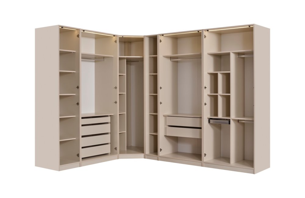 • Köşe Dolap İçeriği: 1 ad. 43 cm raflı dolap, 1 ad. 2 kapaklı kemerlikli dolap, 1 ad. köşe dolap, 1 ad. 30 cm raflı dolap, 1 ad. 2 kapaklı valizlikli dolap ve 1 ad. 2 kapaklı pantolonluklu dolaptan oluşmaktadır.