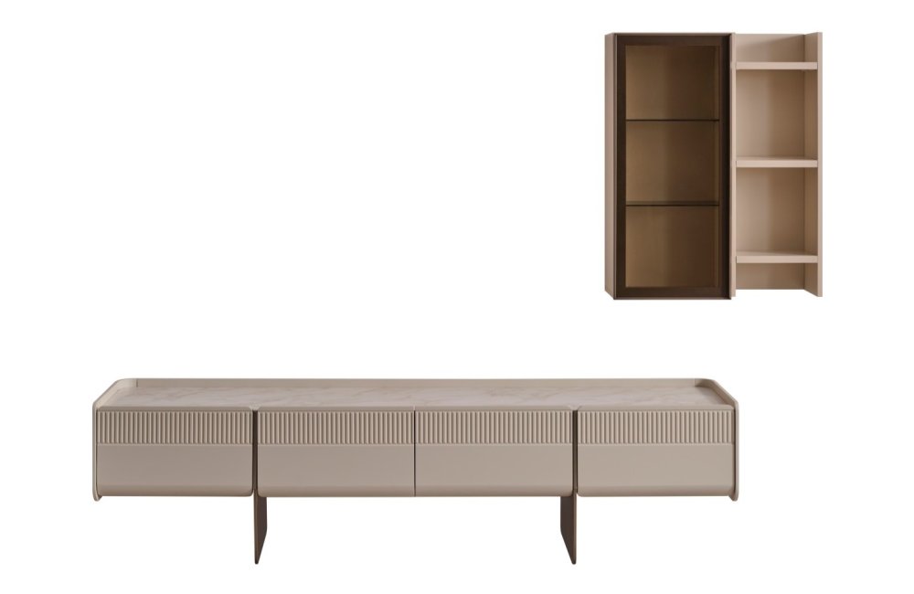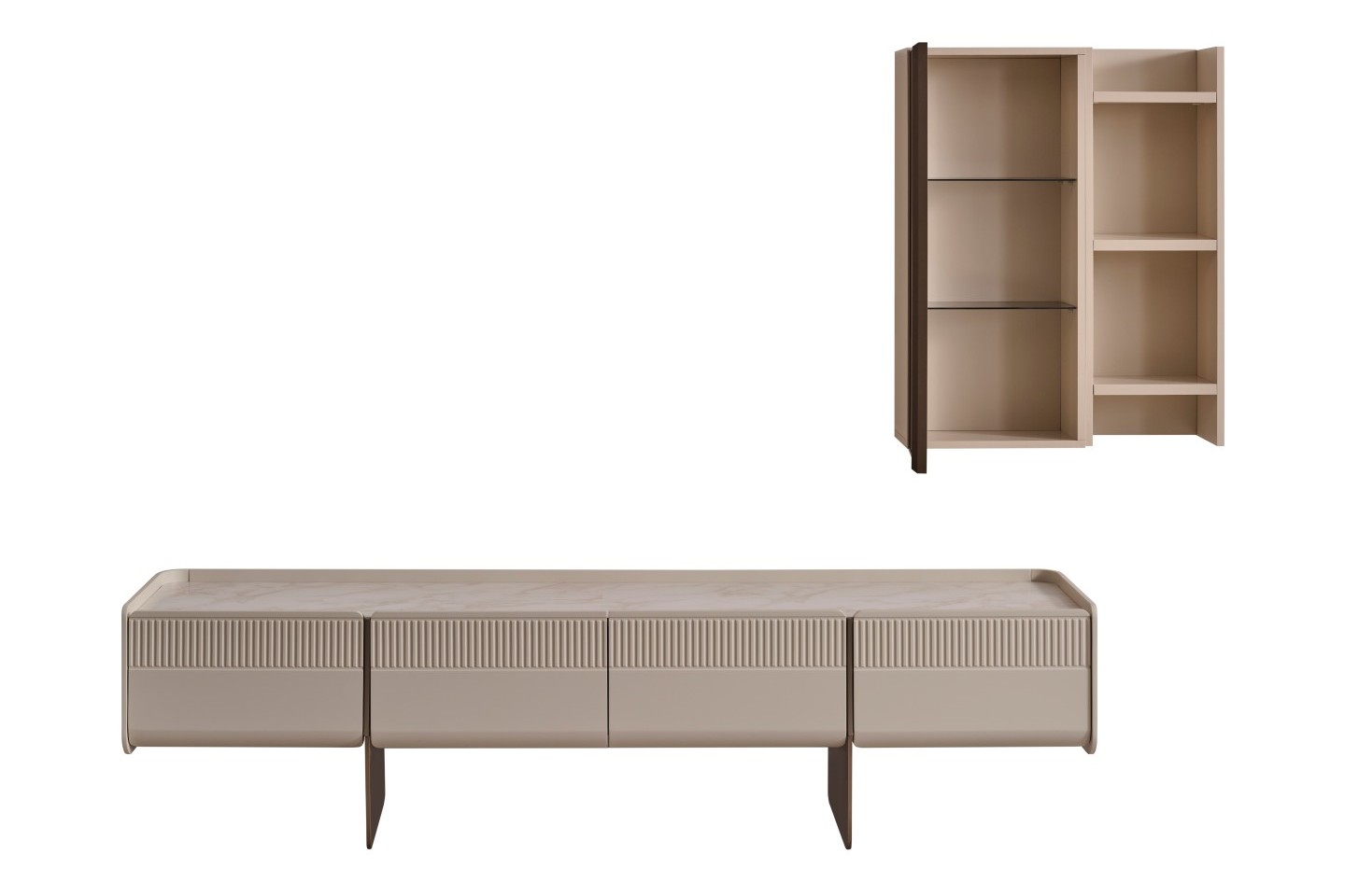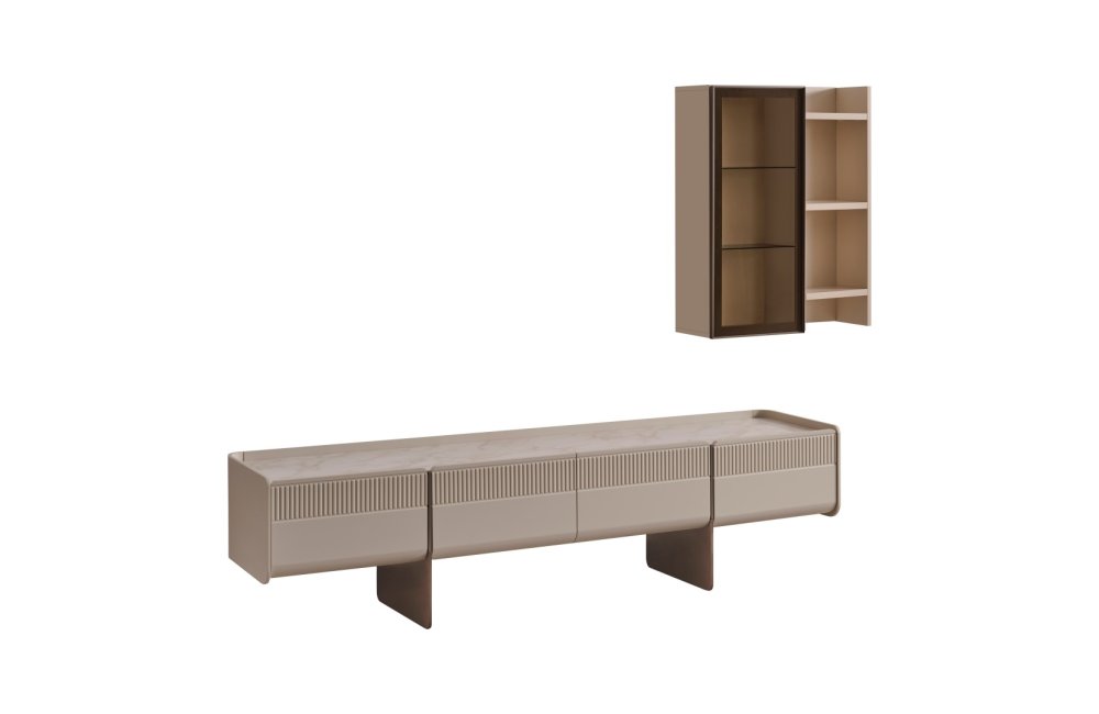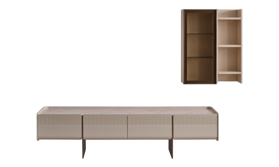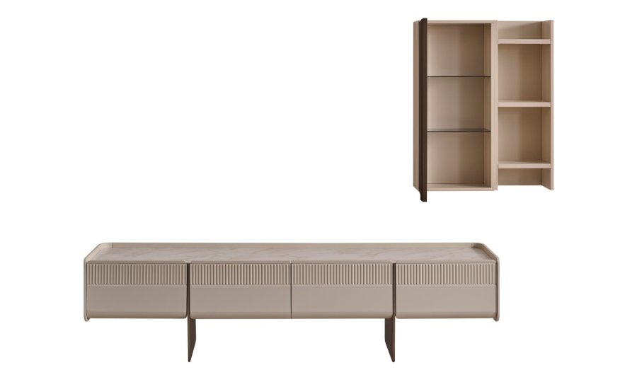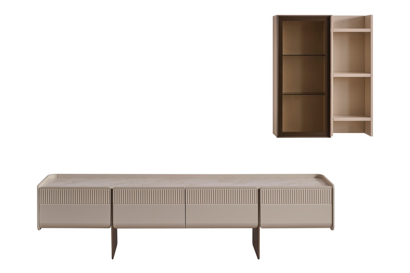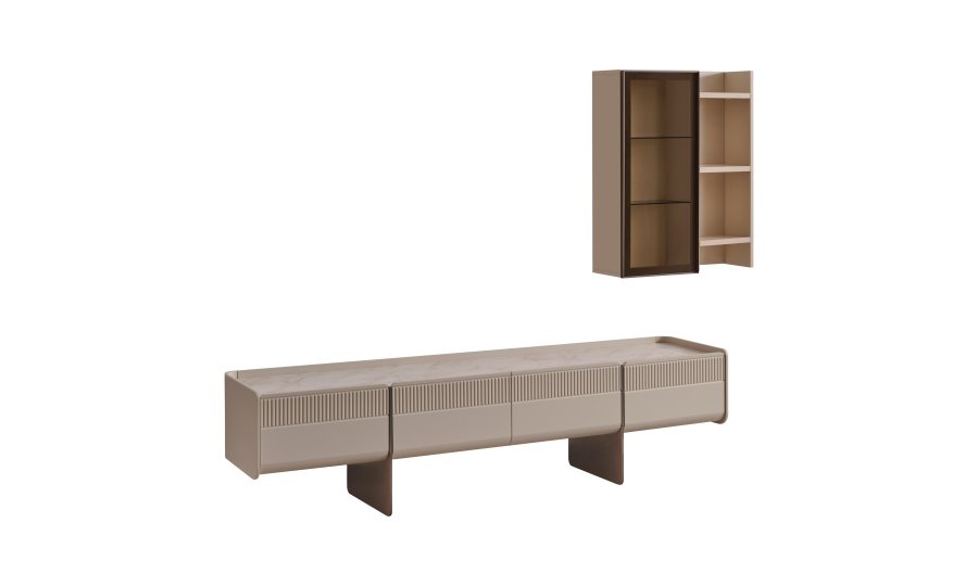 • Ritmik Tasarım: Alt modül kapaklarında yer alan dikey hatlı (fluted) paneller, üniteye hareketli ve modern bir derinlik kazandırır.