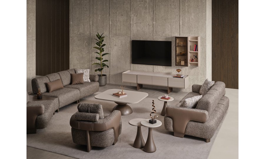 • Mermer ve Vizon Uyumu: Ünitenin üst yüzeyinde kullanılan mermer dokusu, vizon tonlarındaki gövde yapısıyla birleşerek lüks bir görünüm sunar.