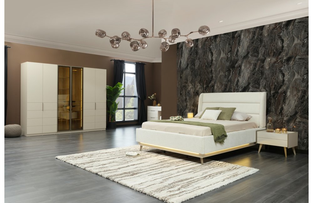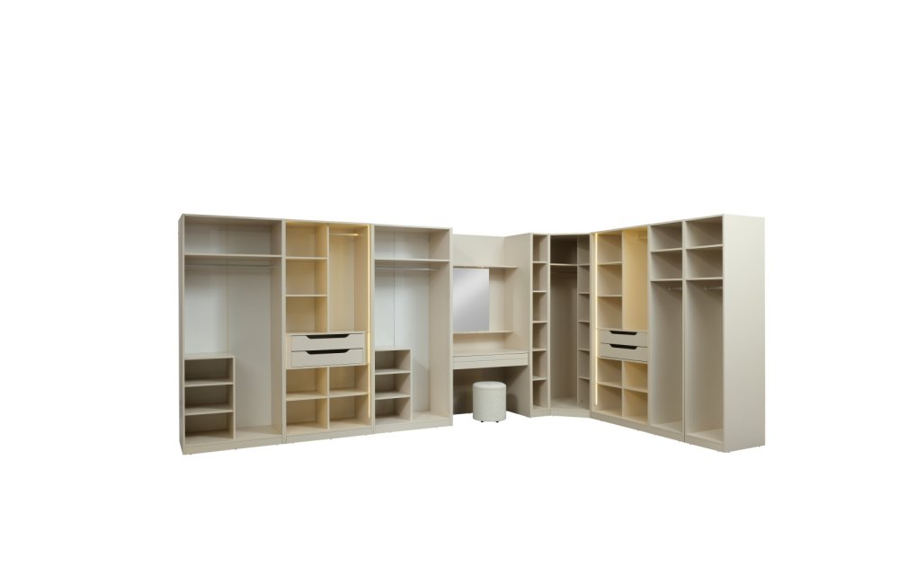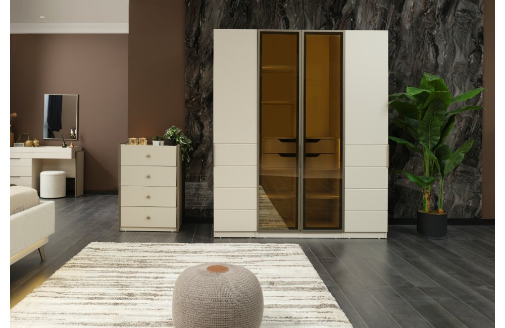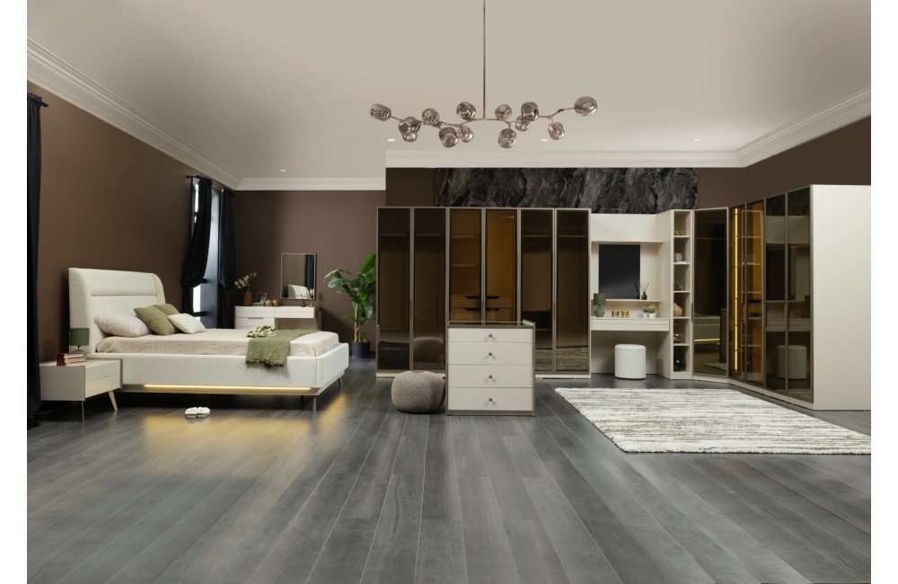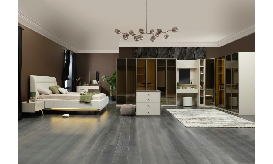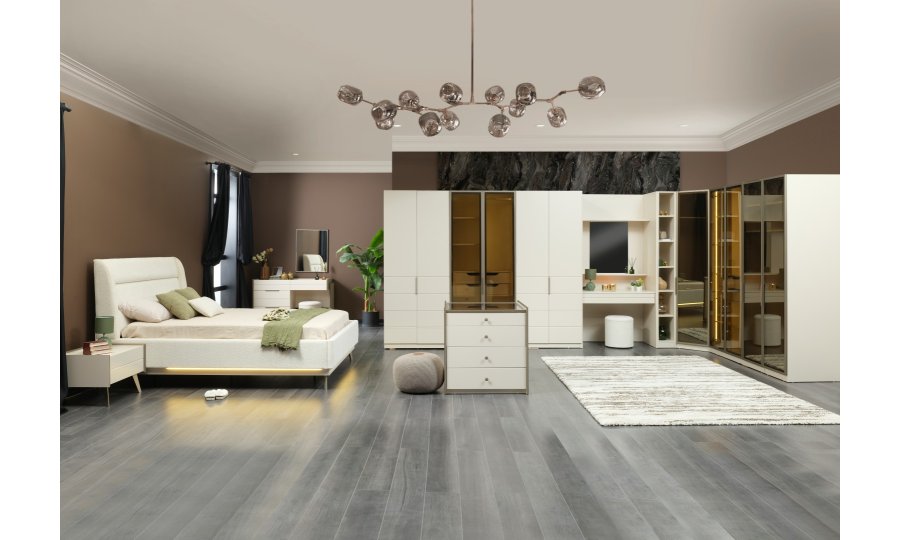 1 ad. köşe camlı dolap, 2 ad. tekli camlı dolap, 2 ad. 2 kapaklı Askılıklı Camlı Dolap, 2 ad. 2 kapaklı Çekmeceli Camlı Dolap, 1 ad. 25 cm Ara Raflı Dolap, 1 ad. Modül Şifonyer, 1 ad. karyola, 2 ad. komodinden oluşmaktadır.