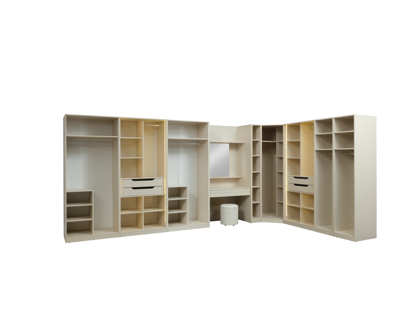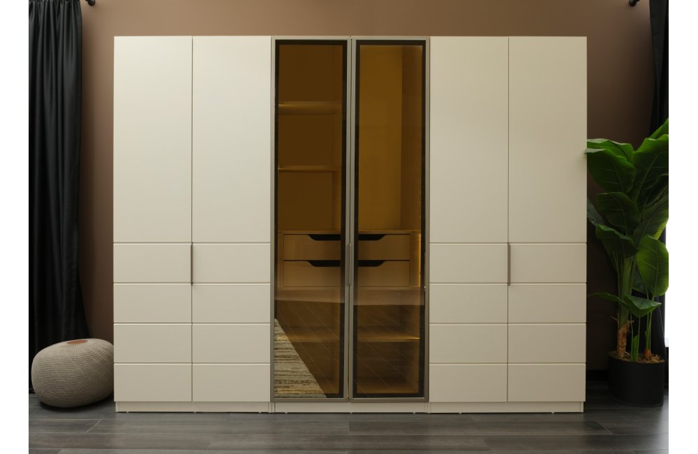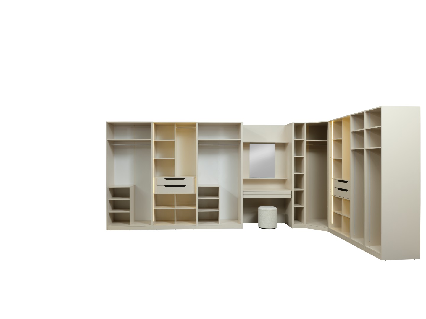 1 ad. köşe camlı dolap, 2 ad. tekli camlı dolap, 2 ad. 2 kapaklı Askılıklı Camlı Dolap, 2 ad. 2 kapaklı Çekmeceli Camlı Dolap, 1 ad. 25 cm Ara Raflı Dolap, 1 ad. Modül Şifonyer, 1 ad. karyola, 2 ad. komodinden oluşmaktadır.