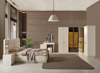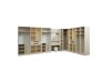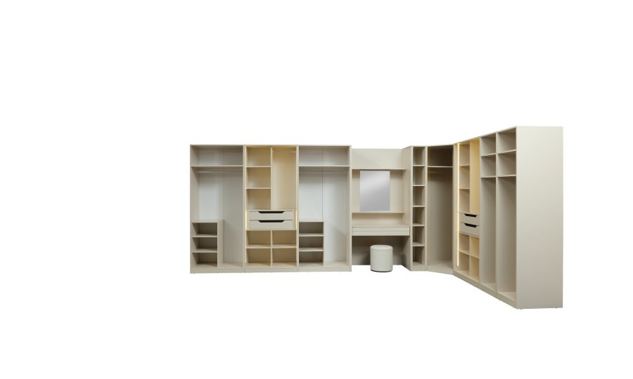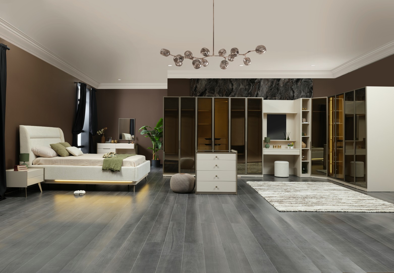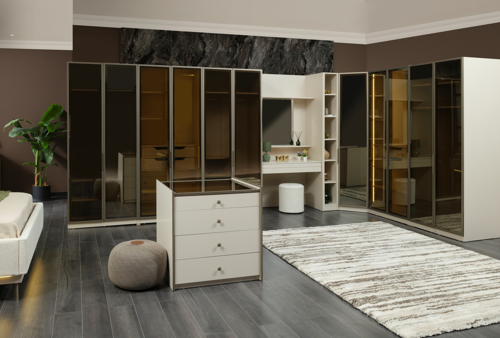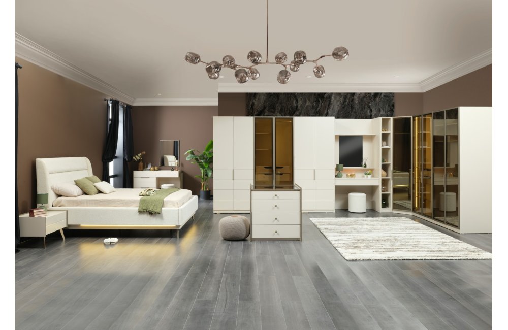 1 ad. köşe camlı dolap, 2 ad. tekli camlı dolap, 2 ad. 2 kapaklı Askılıklı Camlı Dolap, 2 ad. 2 kapaklı Çekmeceli Camlı Dolap, 1 ad. 25 cm Ara Raflı Dolap, 1 ad. Modül Şifonyer, 1 ad. karyola, 2 ad. komodinden oluşmaktadır.
