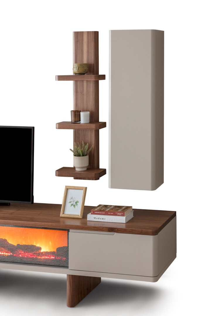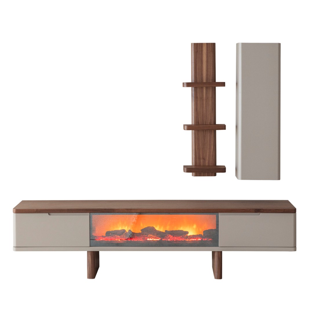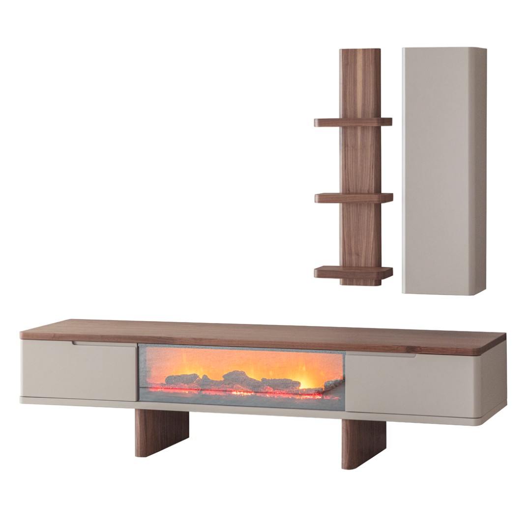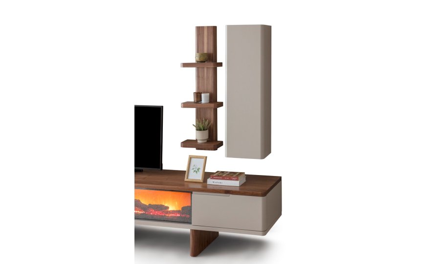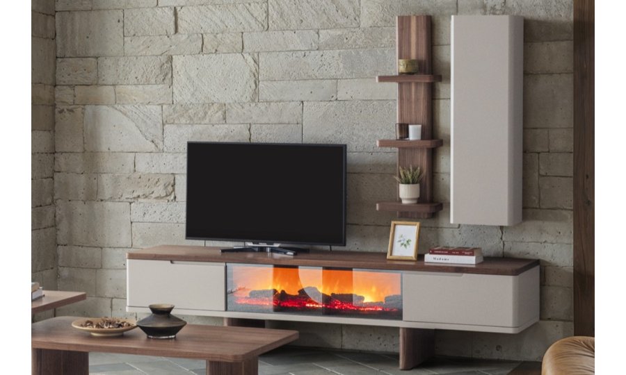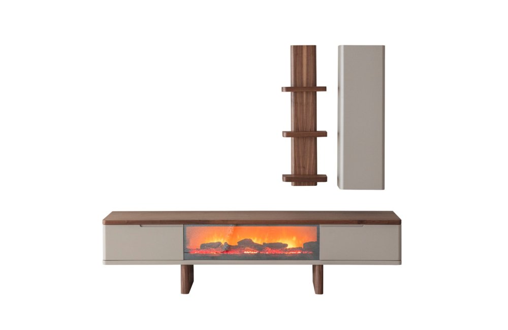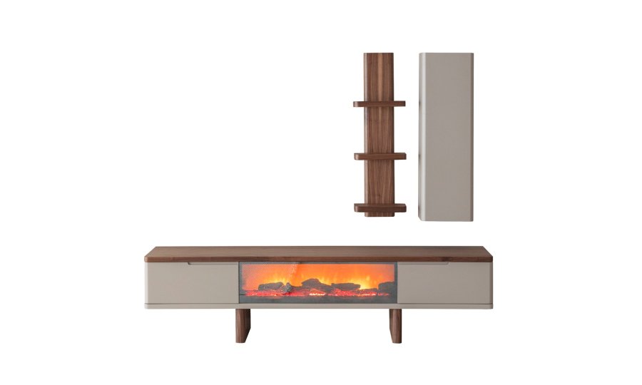 1 ad. TV ünitesi şömineli alt blok, 1 ad. üst blok ve 1 ad. üst raflı bloktan oluşmaktadır.