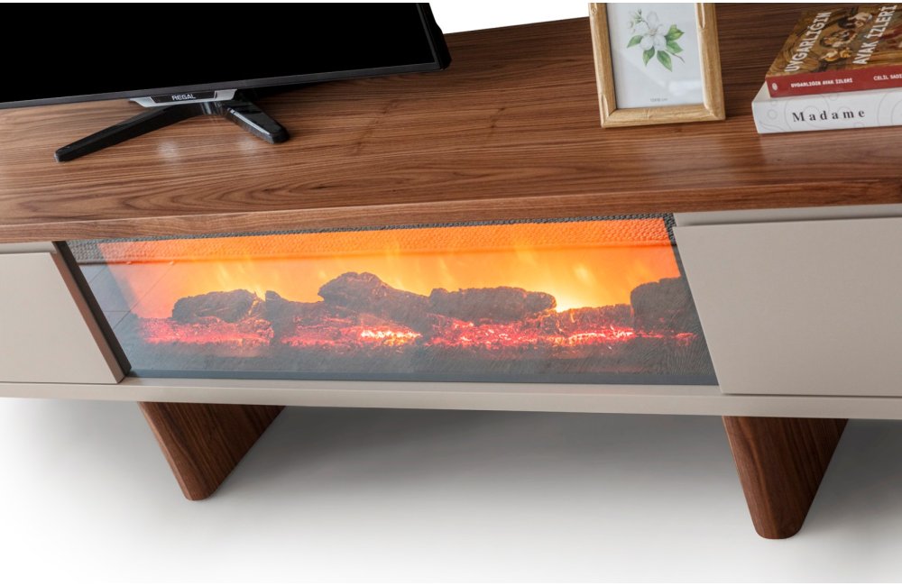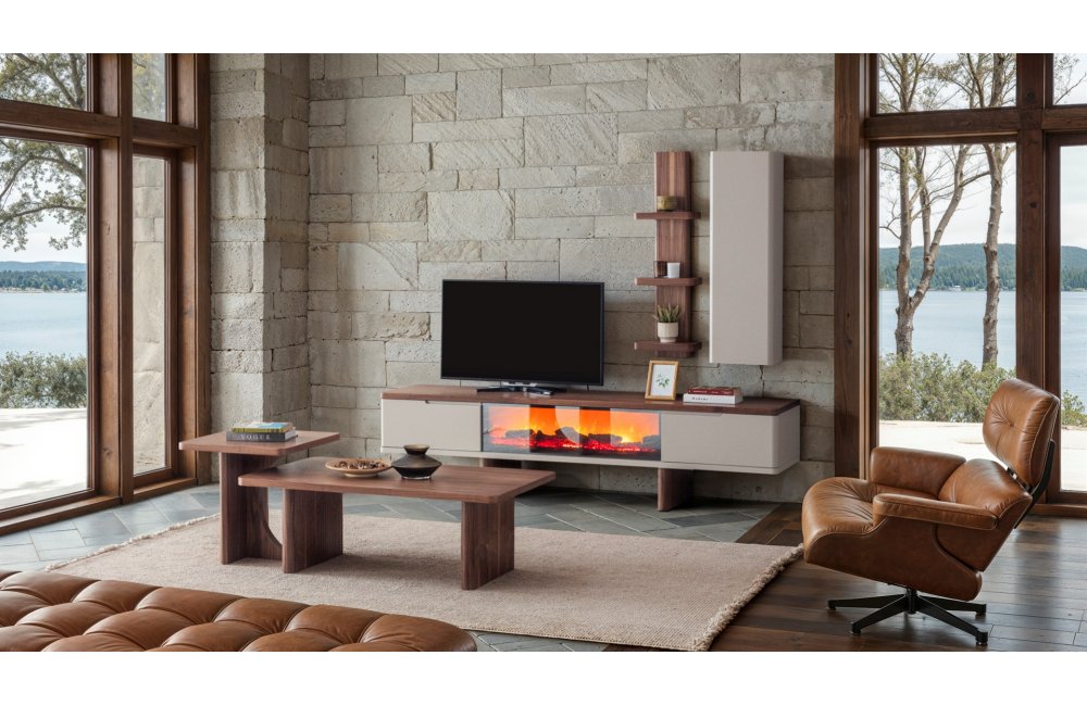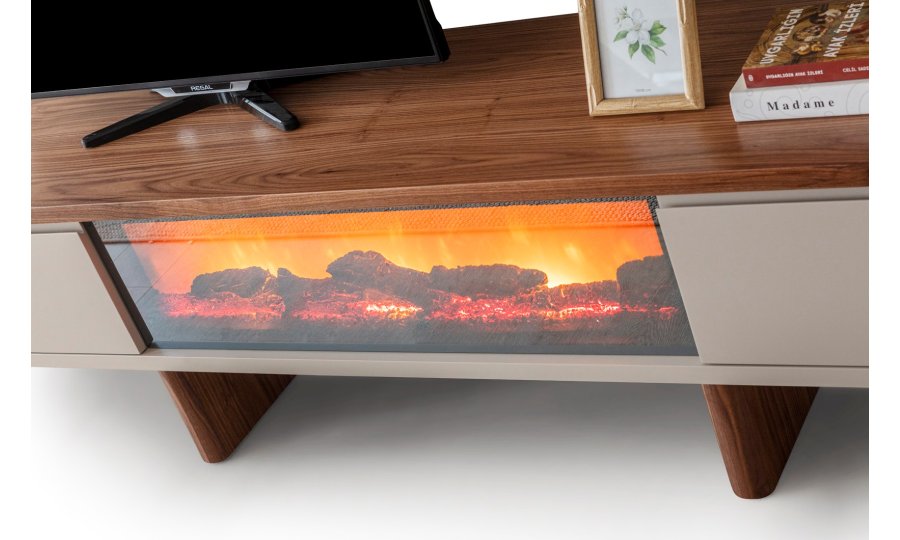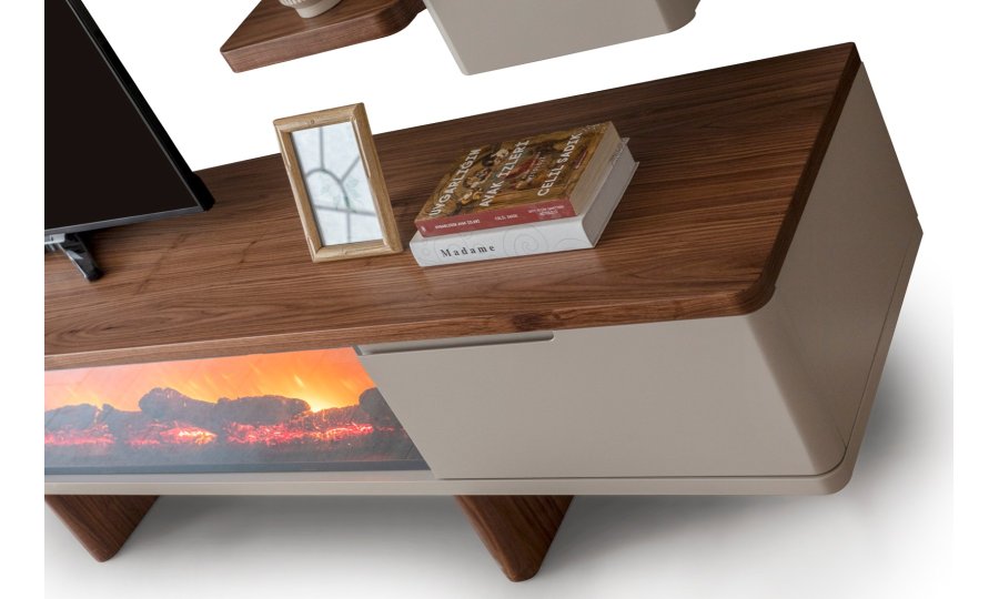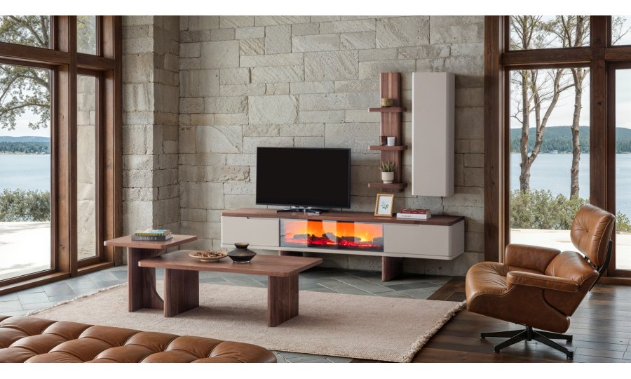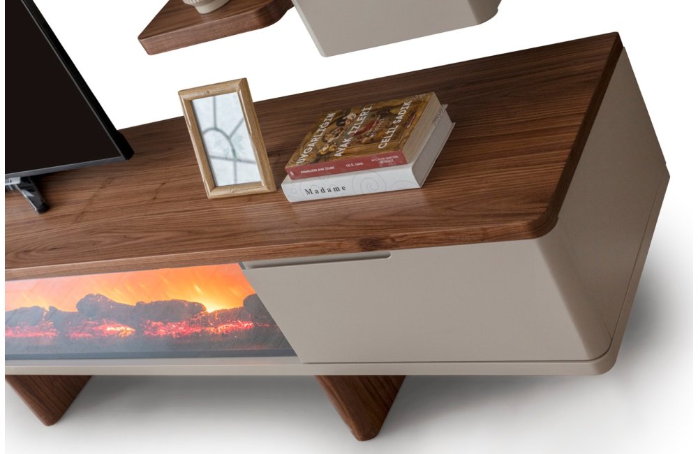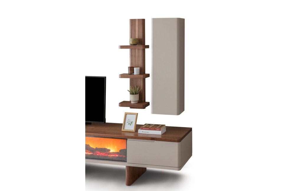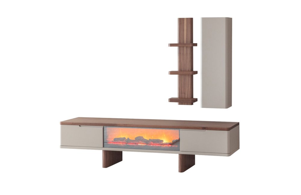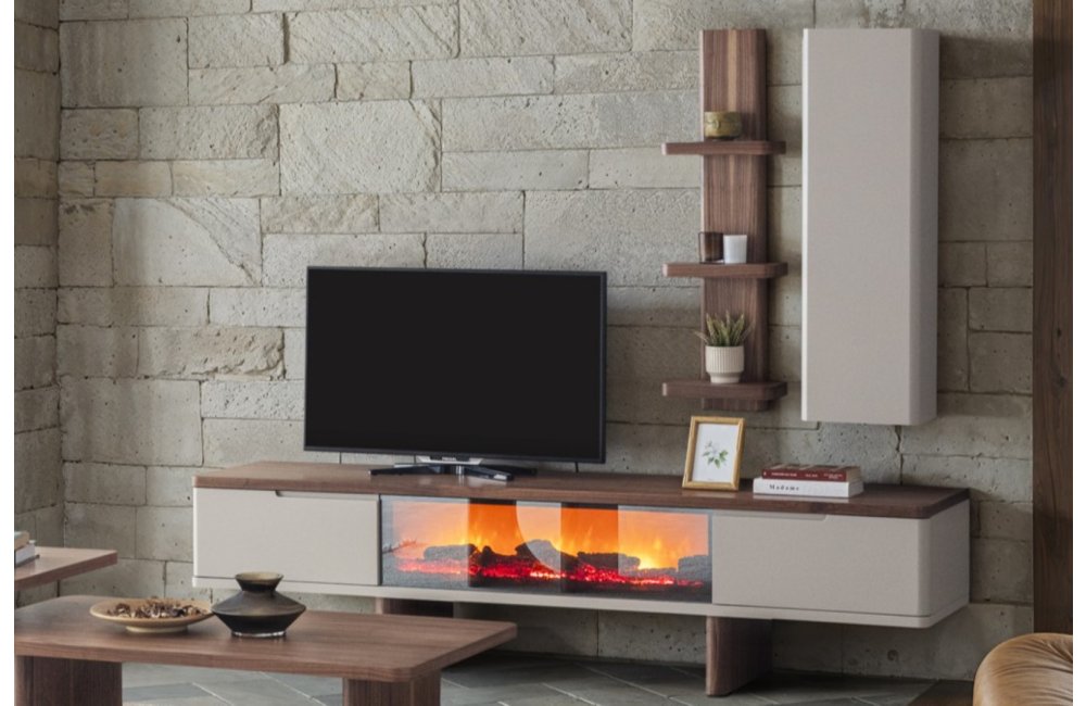 1 ad. TV ünitesi şömineli alt blok, 1 ad. üst blok ve 1 ad. üst raflı bloktan oluşmaktadır.