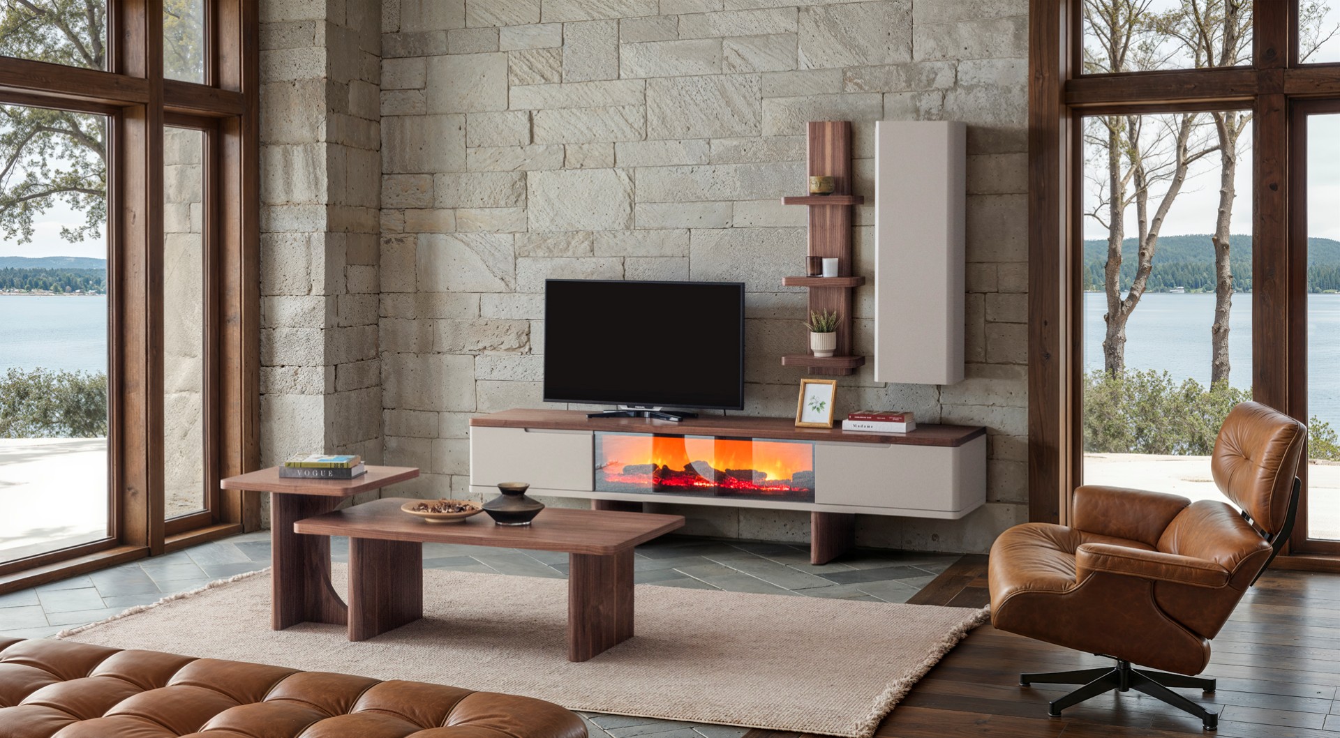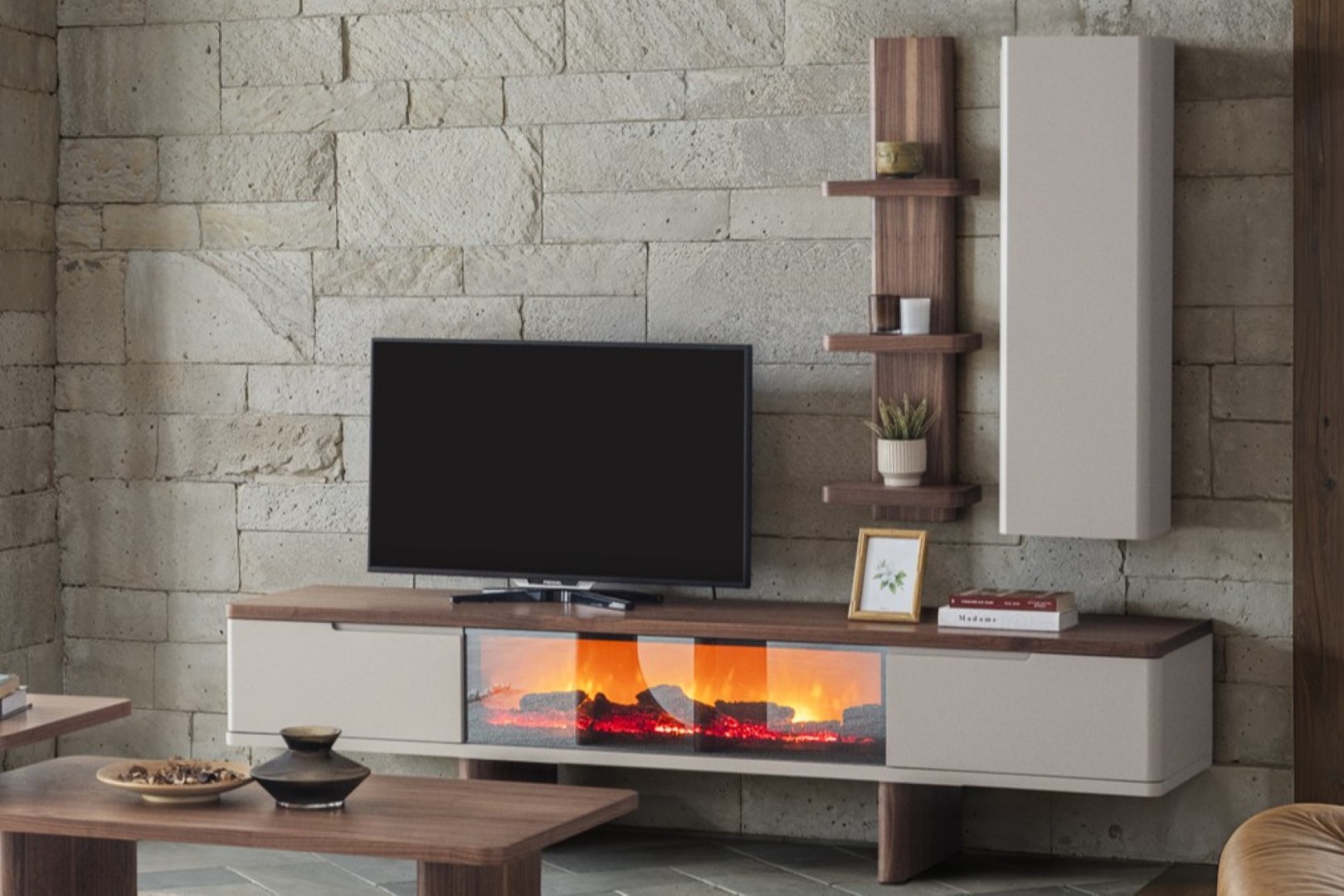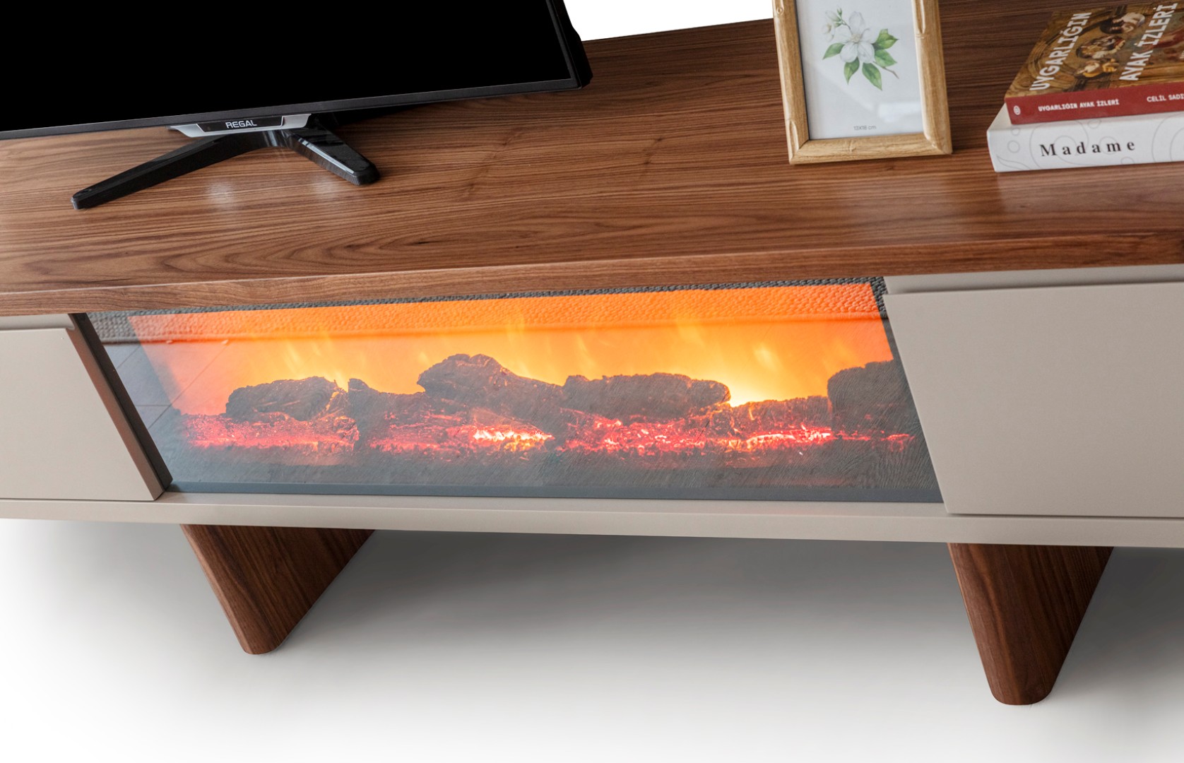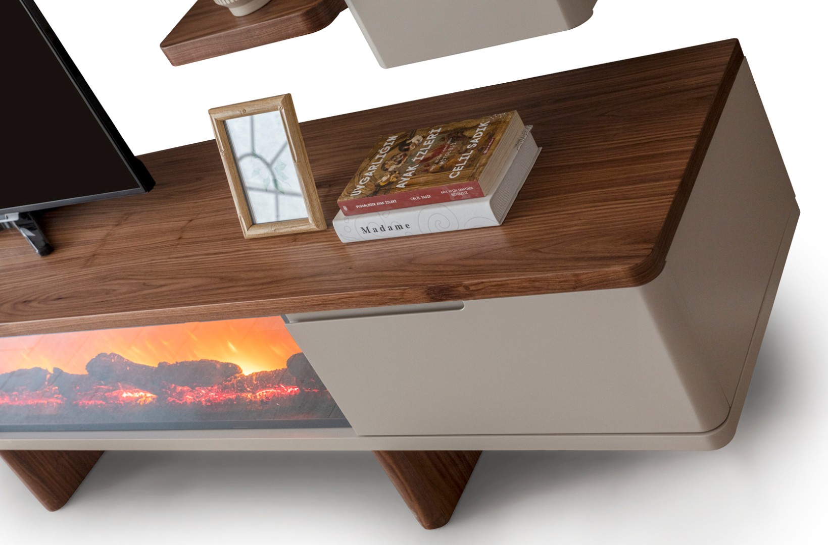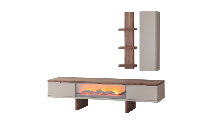1 ad. TV ünitesi şömineli alt blok, 1 ad. üst blok ve 1 ad. üst raflı bloktan oluşmaktadır.