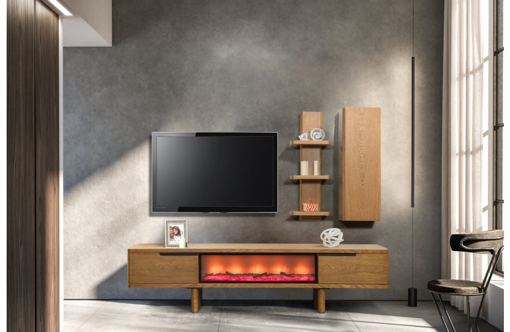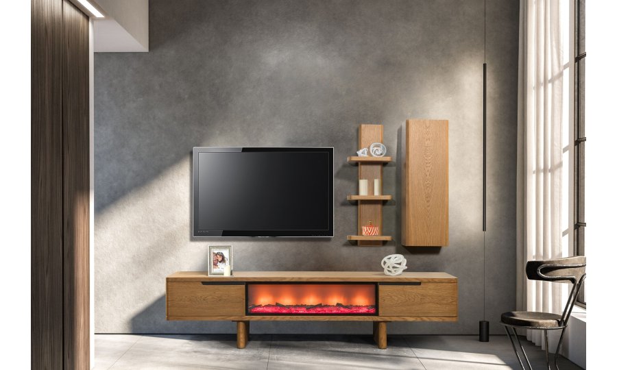1 ad. TV ünitesi şömineli alt blok, 1 ad. üst blok ve 1 ad. üst raflı bloktan oluşmaktadır.