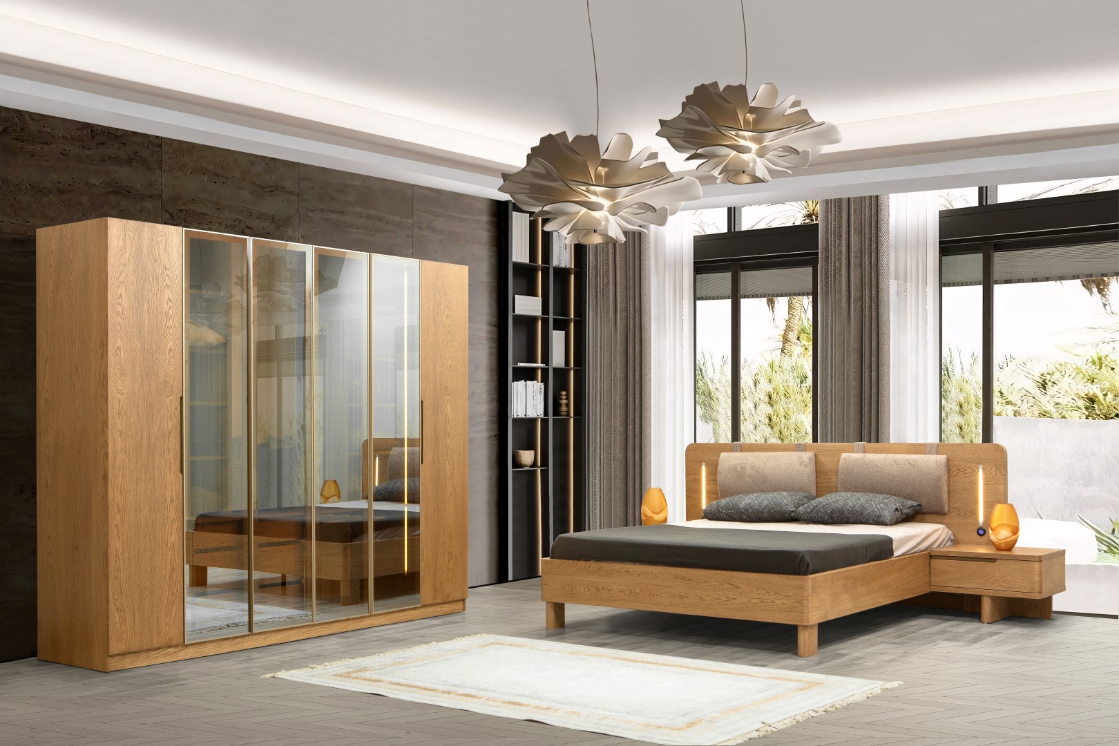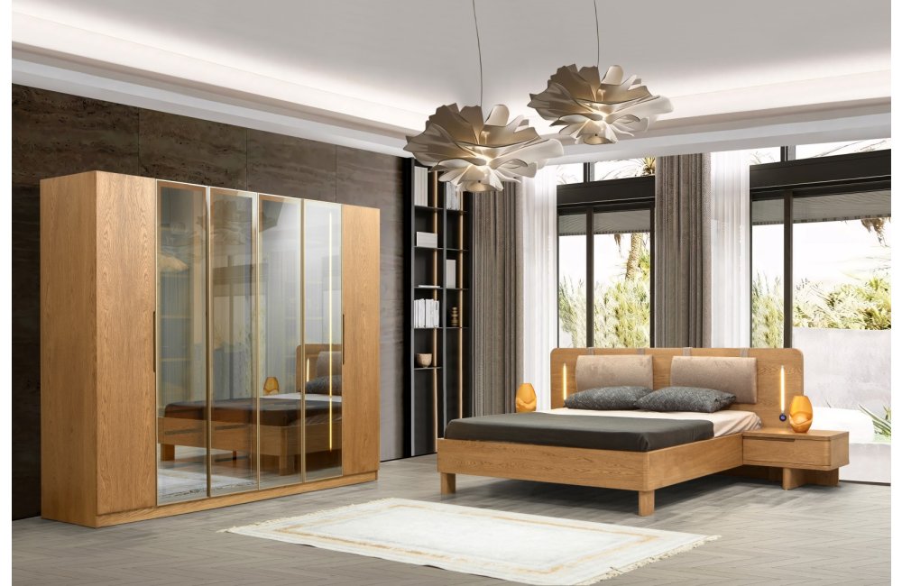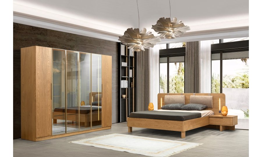 1 ad. 6 akordiyon kapaklı dolap, 1 ad. şifonyer ve aynası, 1 ad. karyola ve 2 ad. komodinden oluşmaktadır.