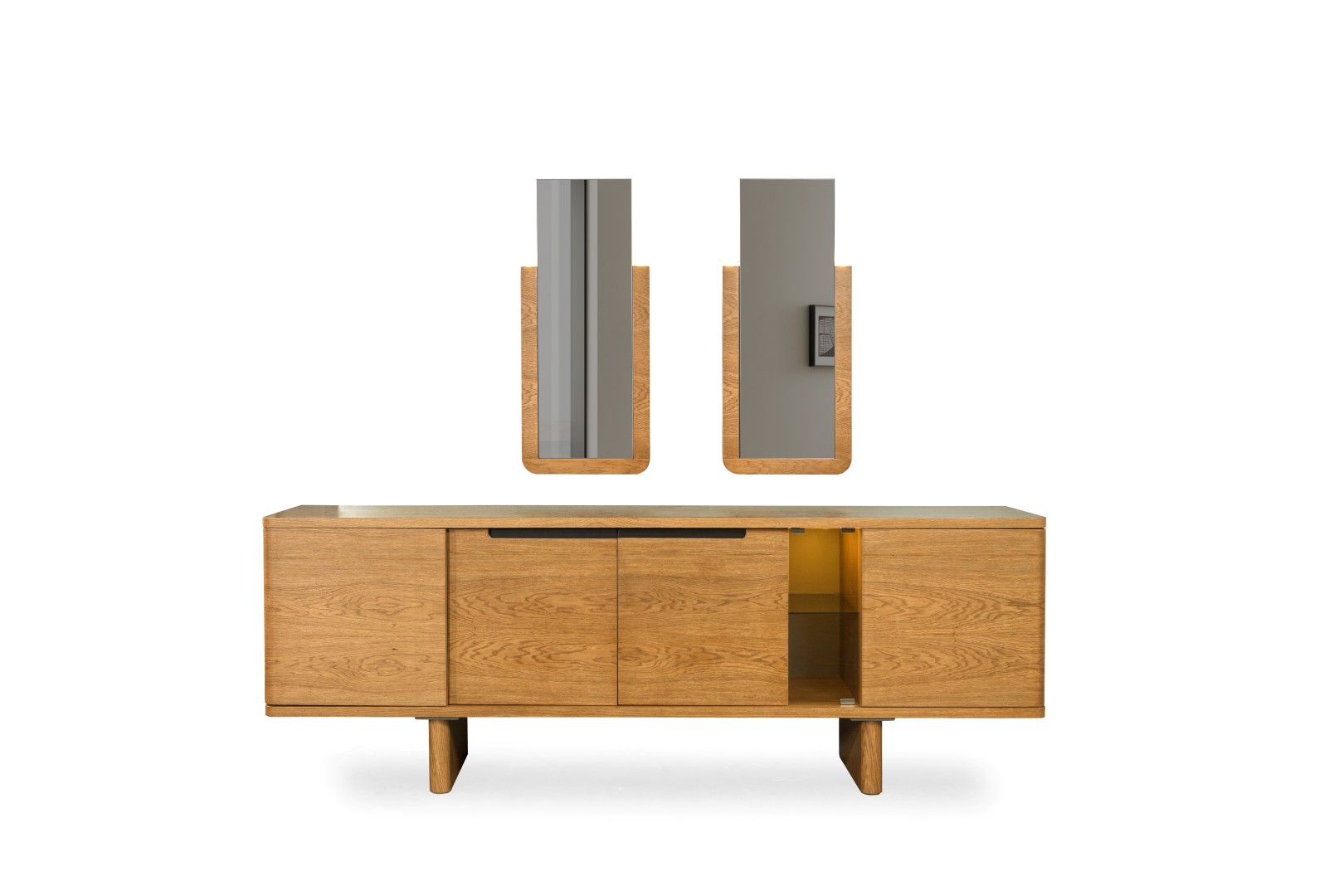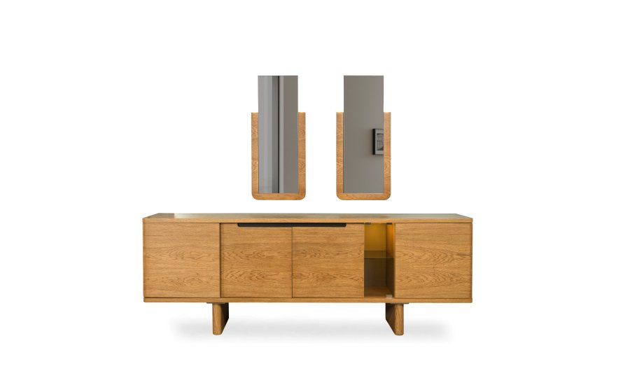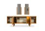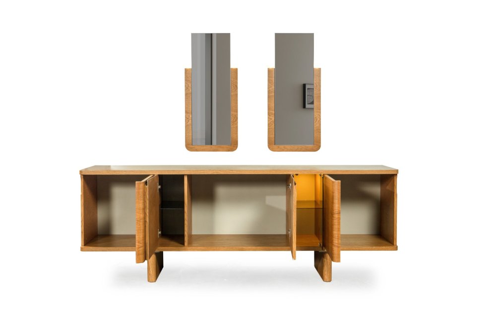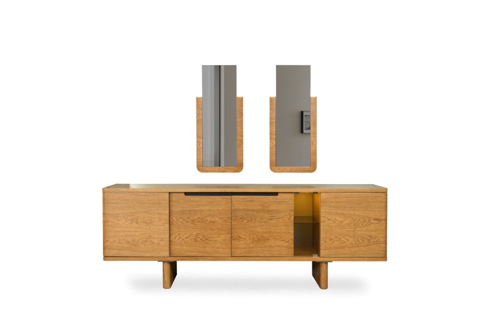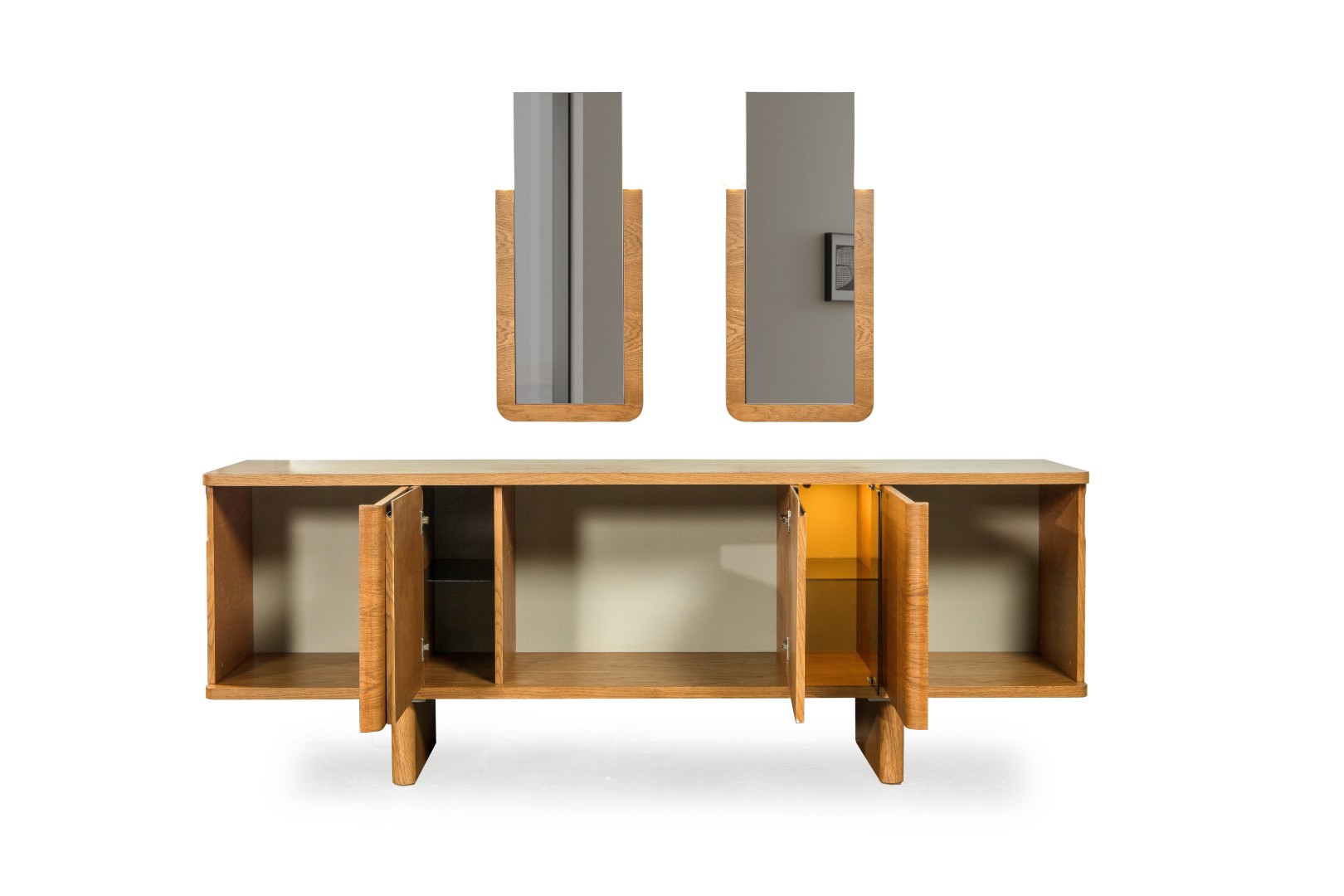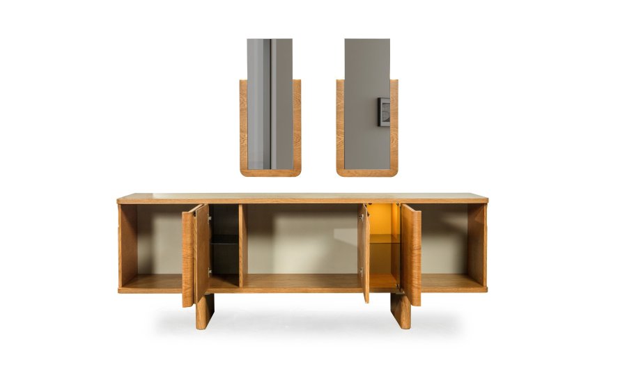 • Füme Camlı Konsol: Konsol kapaklarındaki füme cam detayları ve dikey profiller, takıma modern bir endüstriyel lüks dokunuşu katar.
