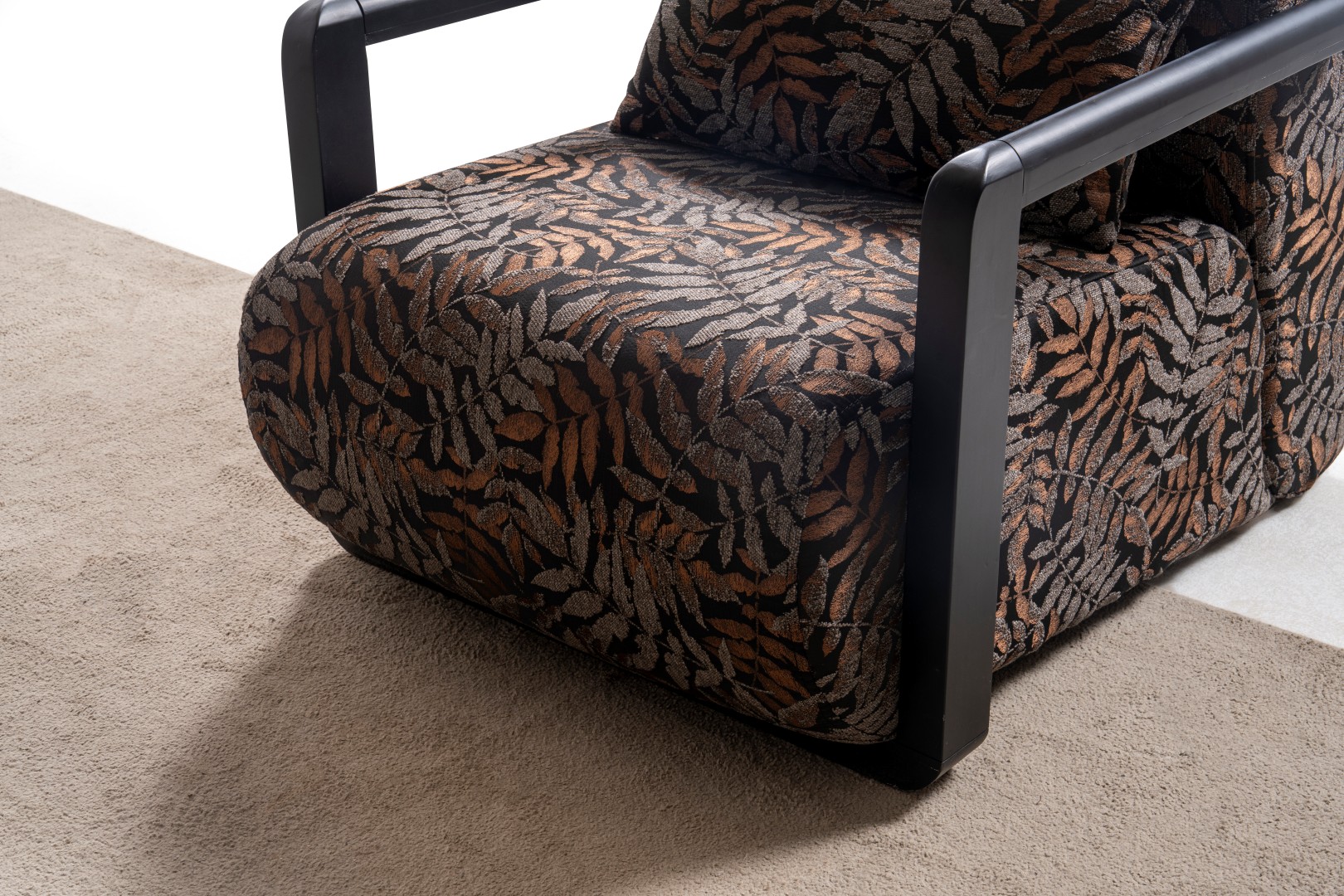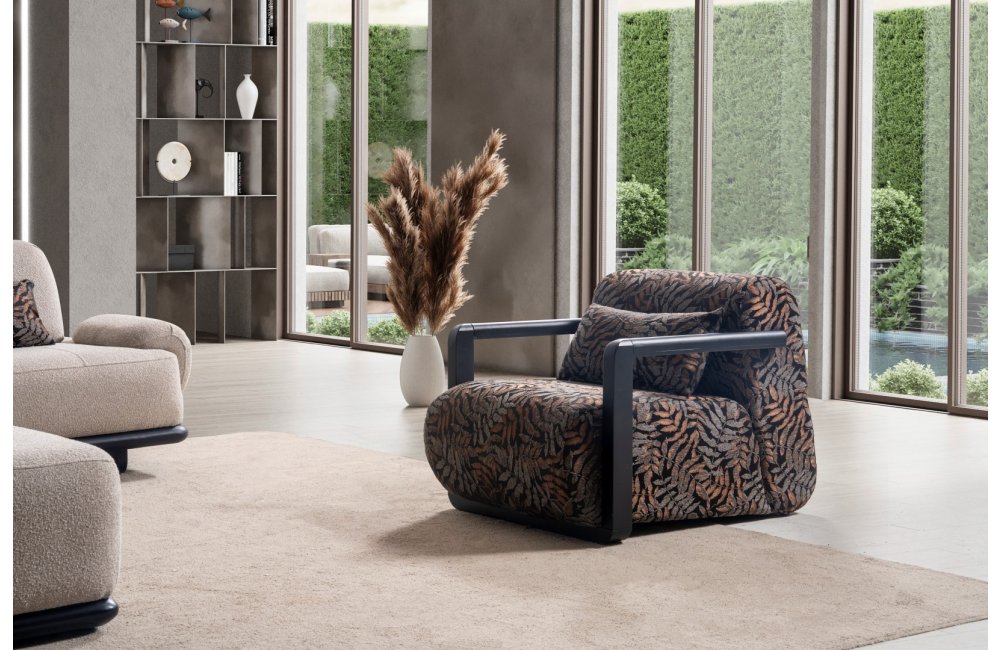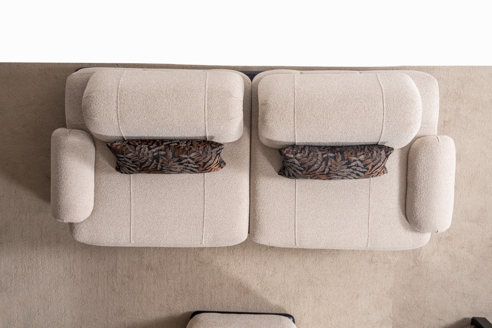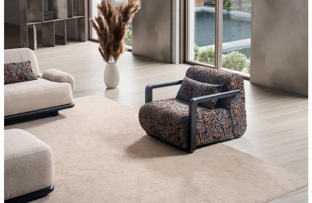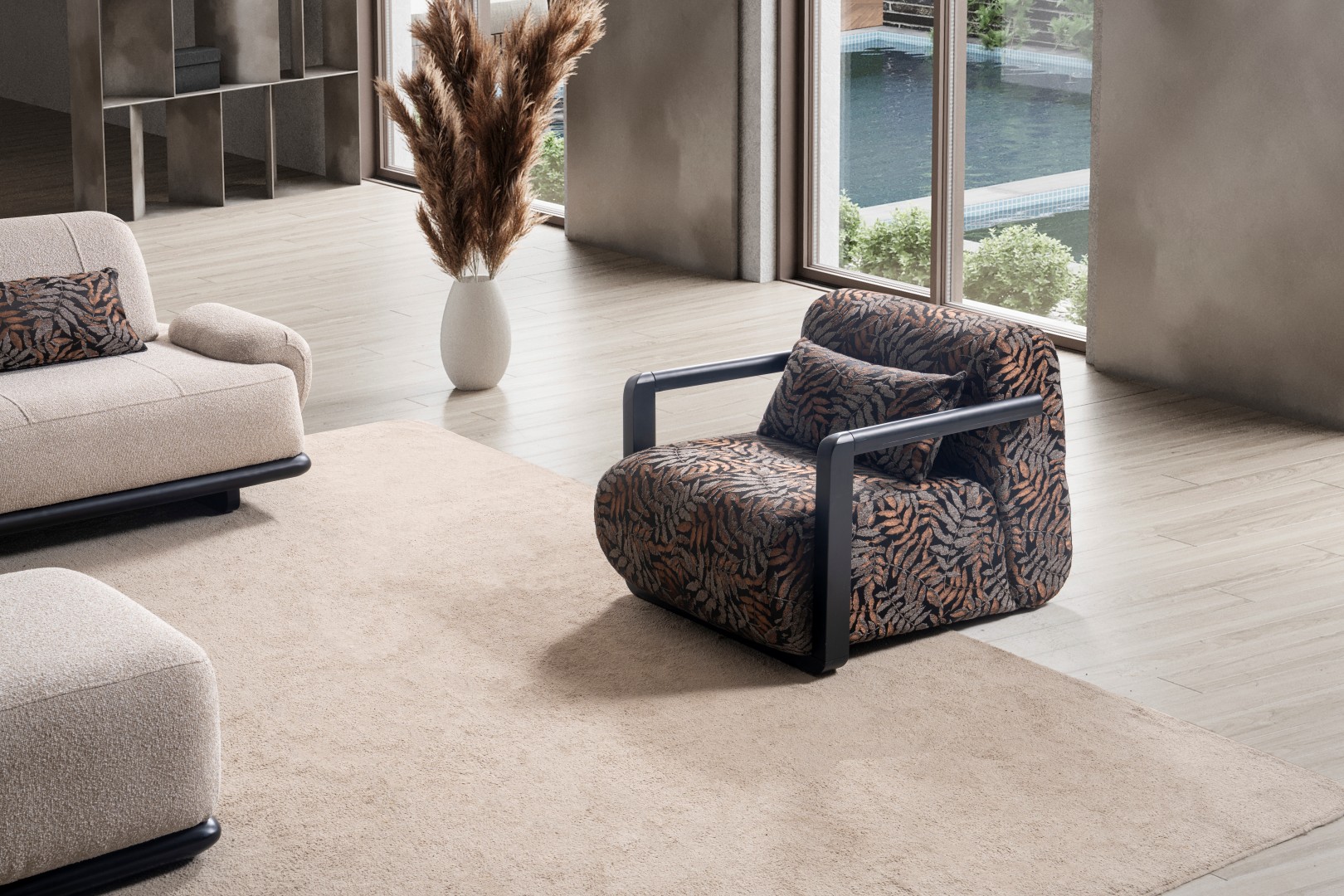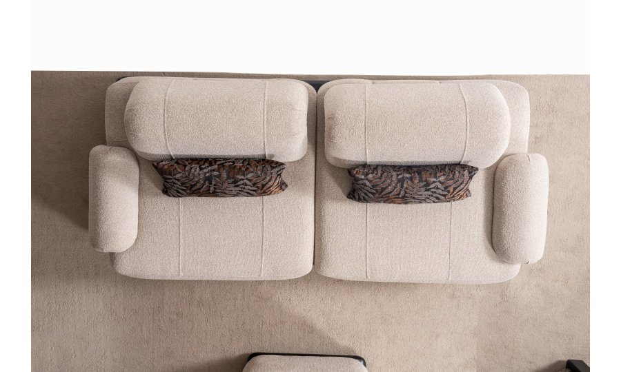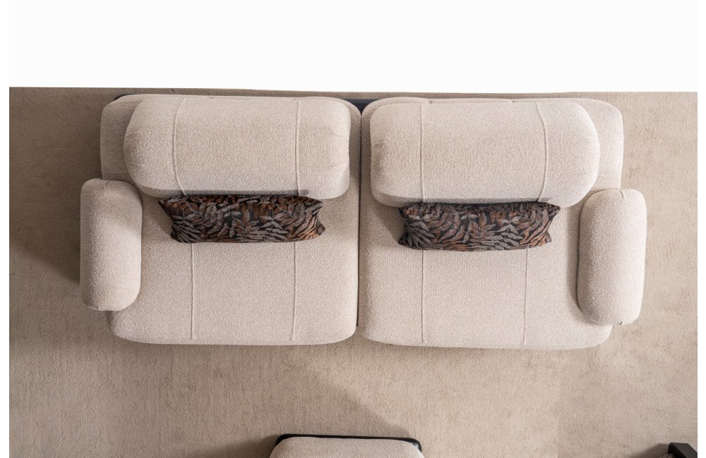 • Premium Kumaş Dokusu: Yumuşak dokulu bouclé (buklet) tarzı ana kumaş, zengin desenli kırlent ve berjer detaylarıyla mükemmel bir kontrast oluşturur.