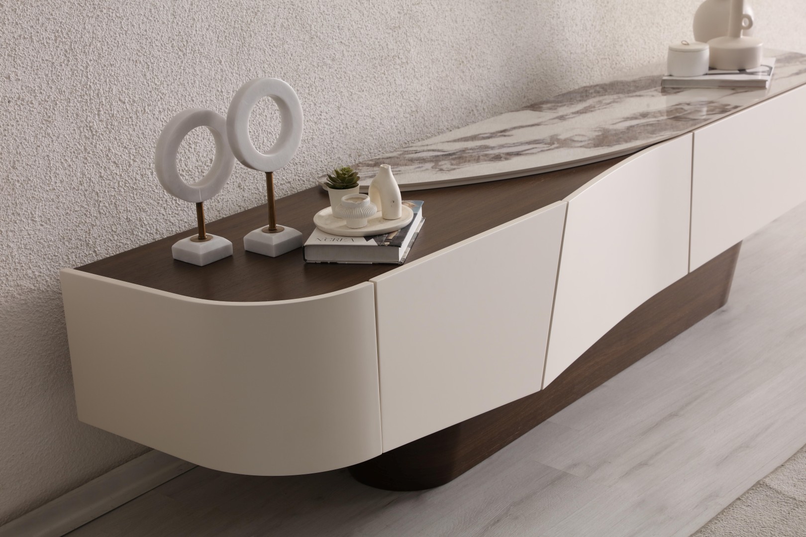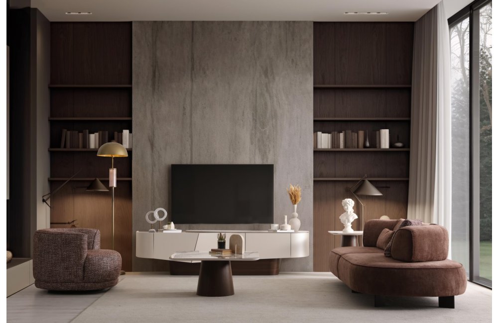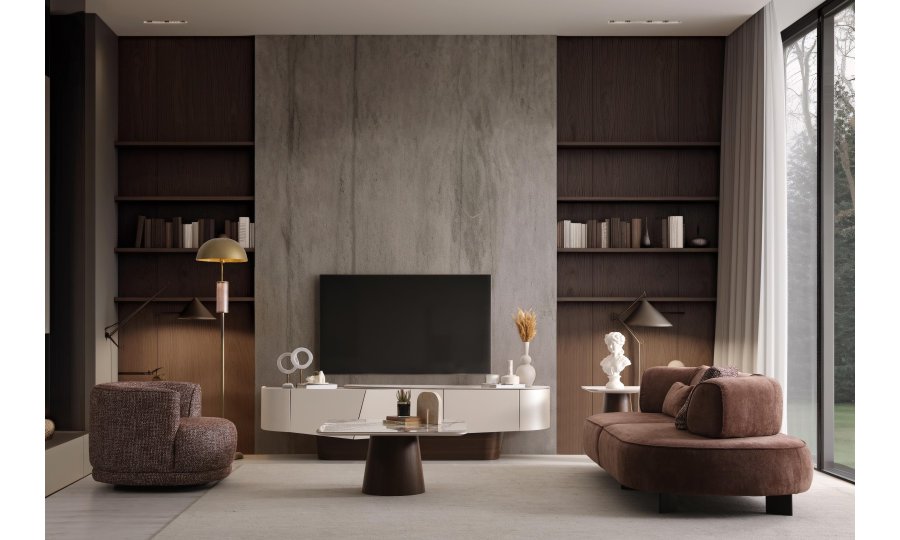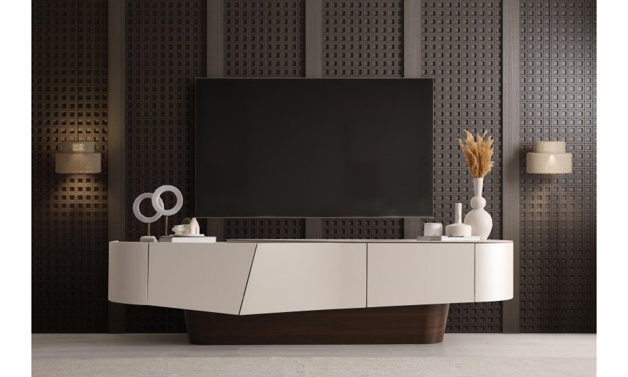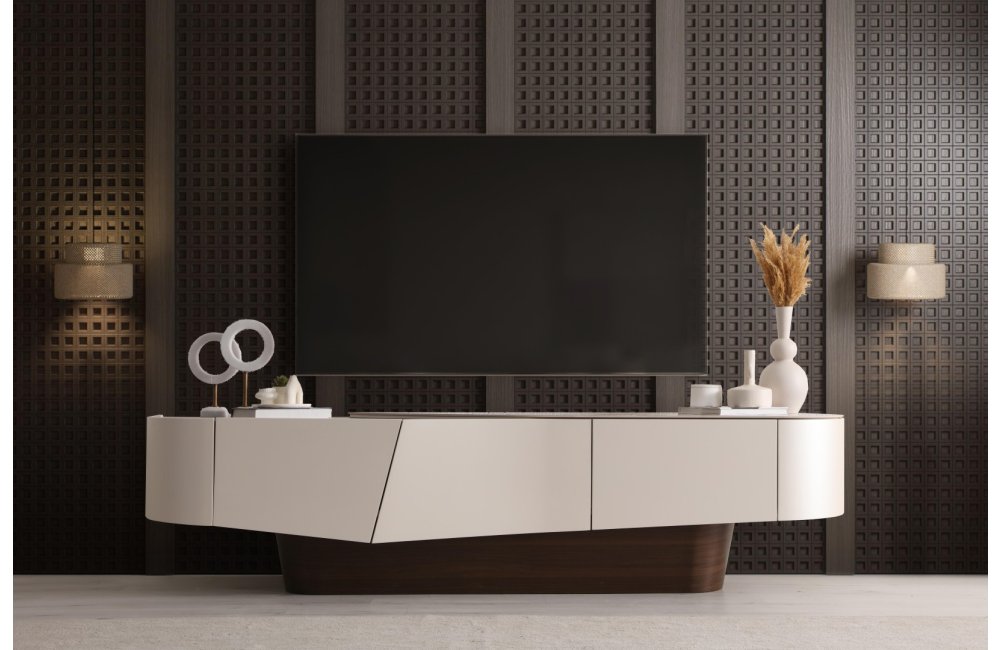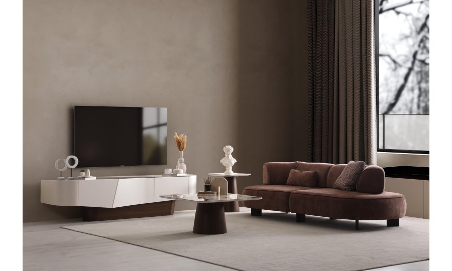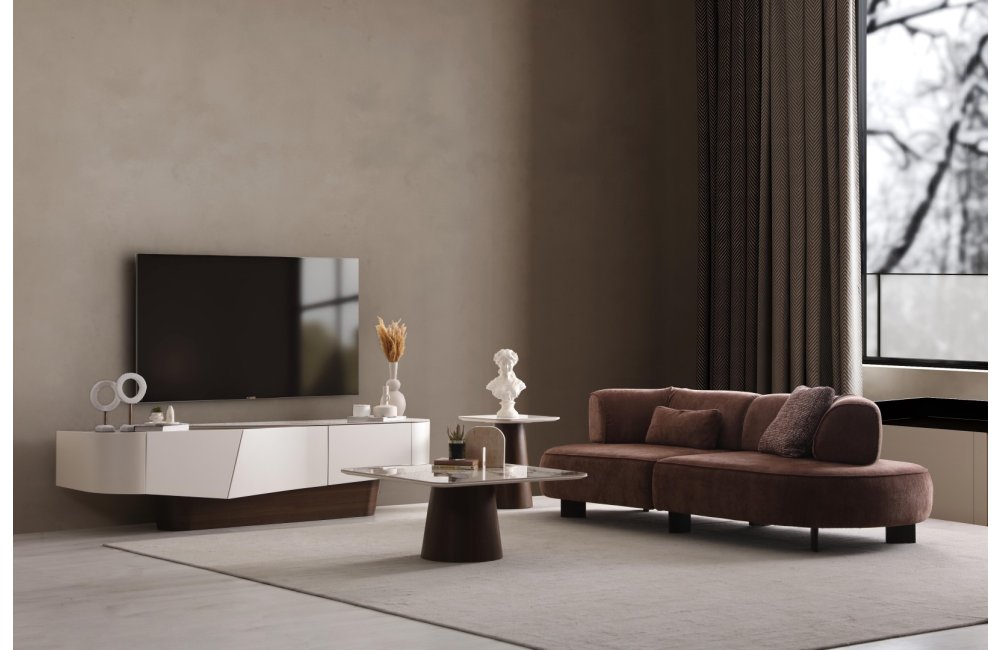 • Yumuşatılmış Köşe Detayları: Ovalleştirilmiş kenarlar, TV ünitesine akışkan ve modern bir silüet kazandırır.