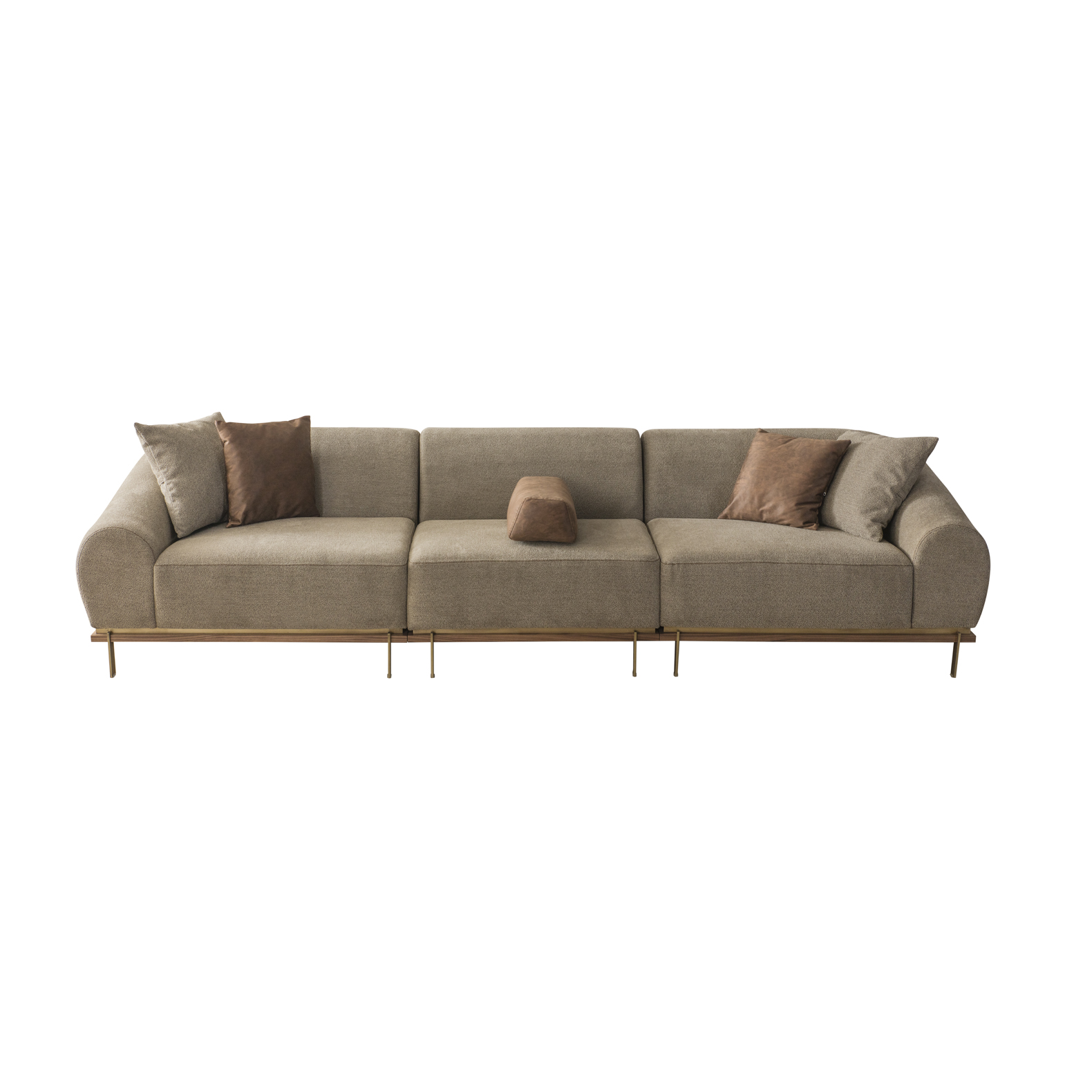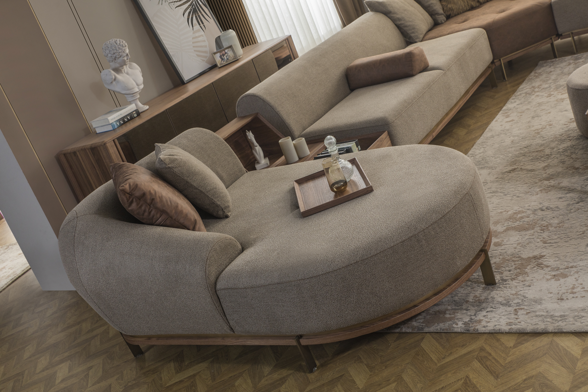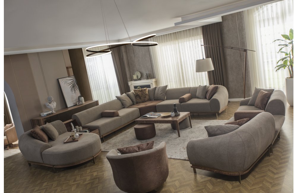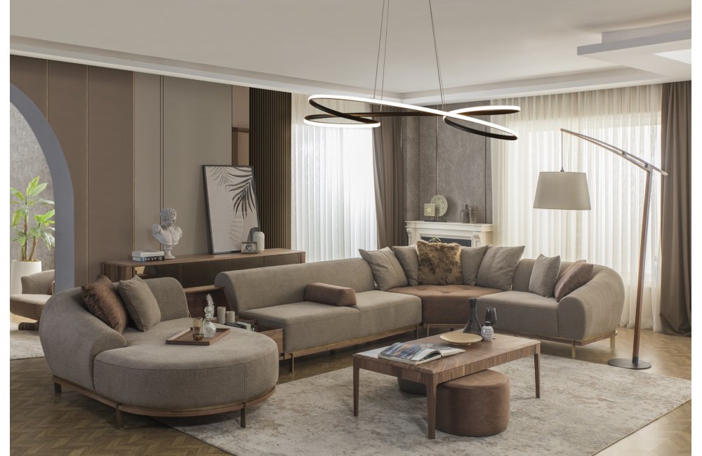 1ad. dinlenme modül, 1ad. ara modül, 1ad. çerezlik 1ad. 180cm kolsuz, 1ad. köşe modül ve 1ad. sağ kollu modülden oluşmaktadır. , Sol kollu modül, ara puf, sehpa, orta puf ve berjer opsiyonel olarak satışa sunulmuştur.