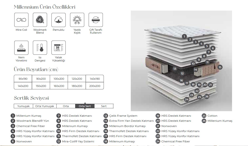 Üstün kaliteli malzemeler kullanılarak üretilen ve uzun ömürlü bir kullanıcı deneyimi vadeden Millennium Yatak'ın 2 yıl garantisi bulunur. Siz de orta sert yapıdaki yataklarda daha çok rahat ediyorsanız 35 cm yüksekliğindeki Millennium Yatak'ı tercih edebilirsiniz. Yatağın farklı ebatlardaki alternatiflerini inceleyerek ihtiyaçlarınıza uygun olanı seçebilirsiniz.