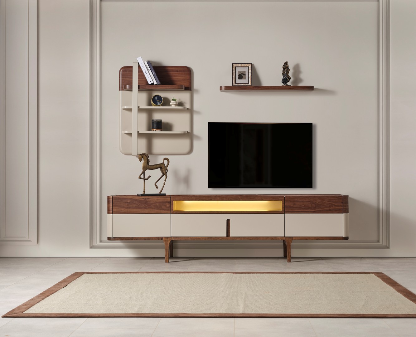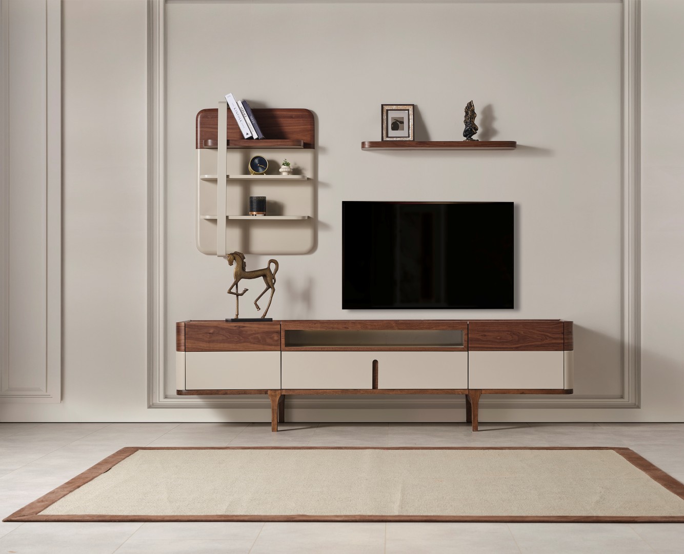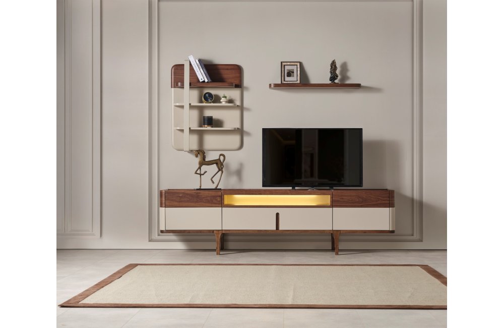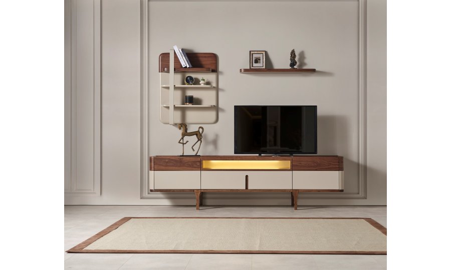 1 ad. TV ünitesinden (TV alt, TV orta raf ve TV üst pano) oluşmaktadır.