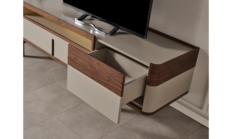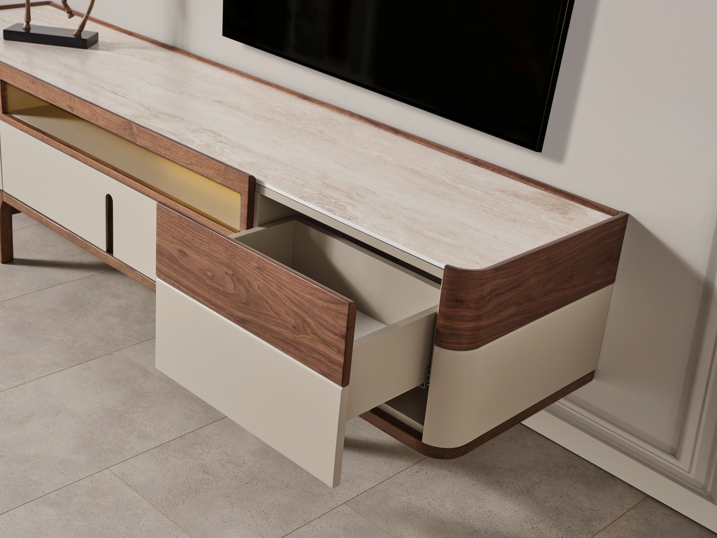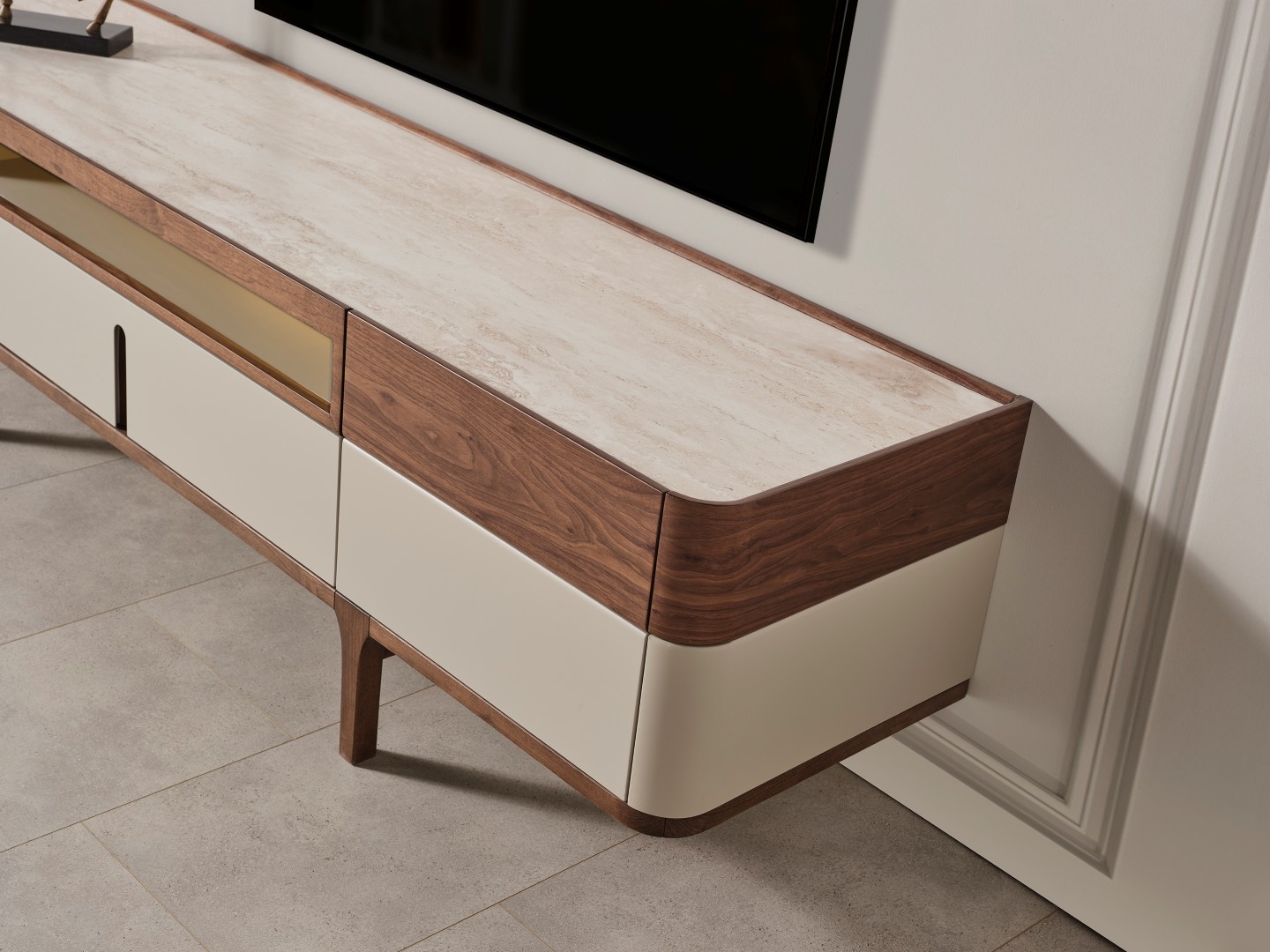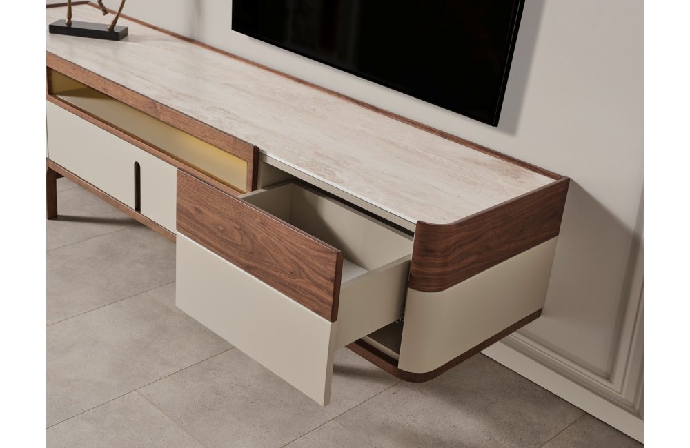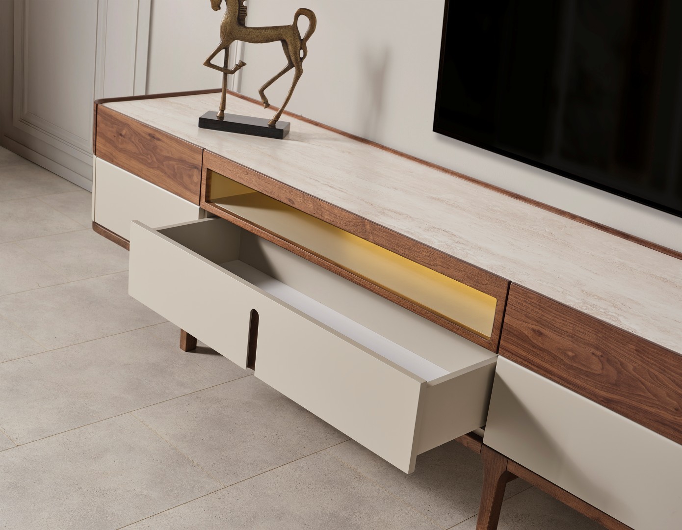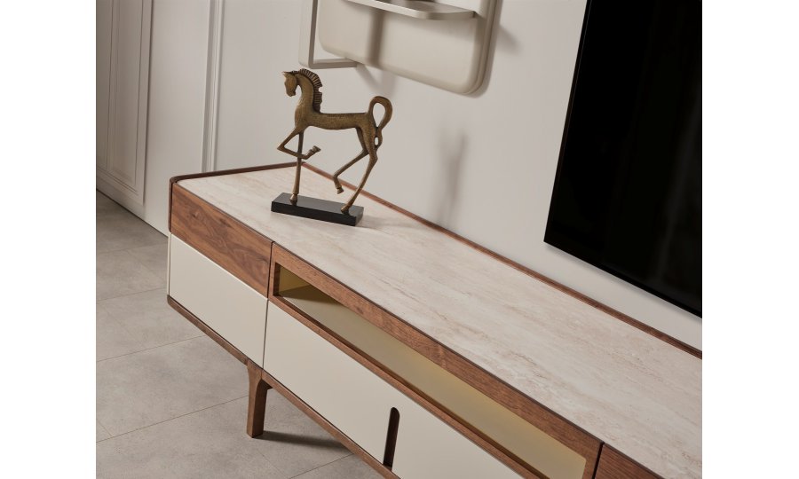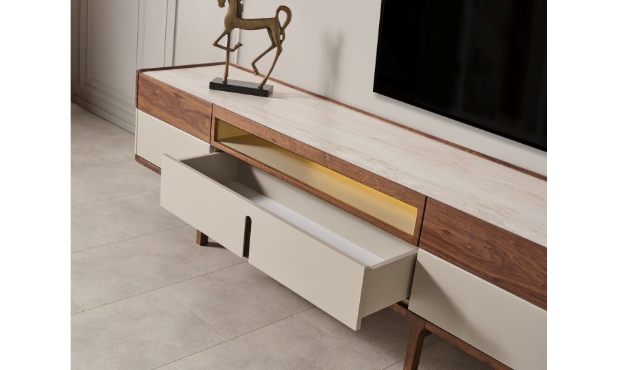 • TV ünitesi alt blok üst tablasında kum taşı rengi, ceviz ve mermer desen rengi seçeneği mevcuttur.