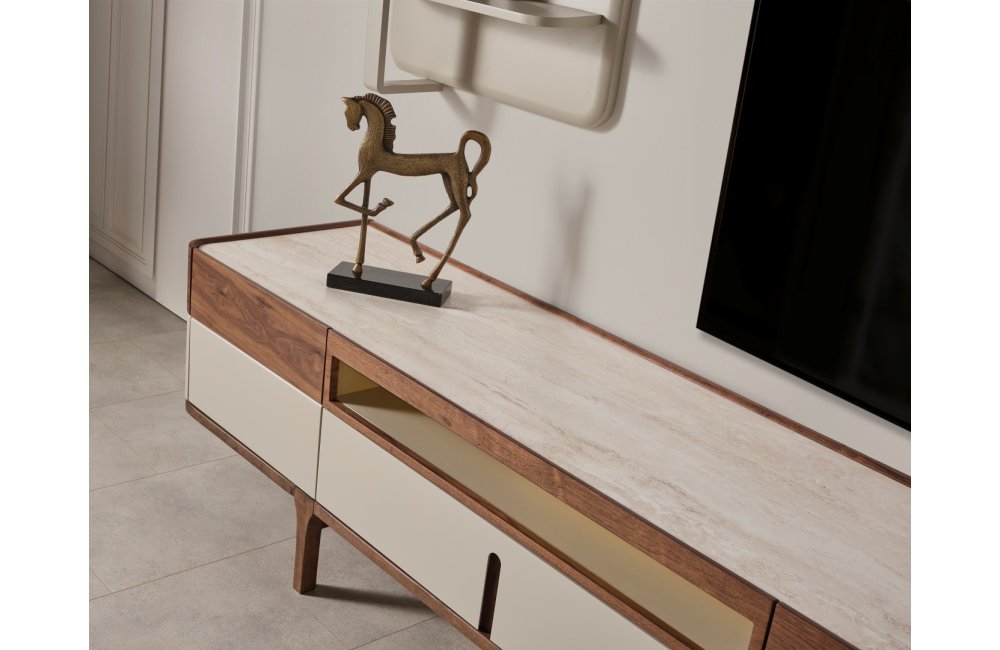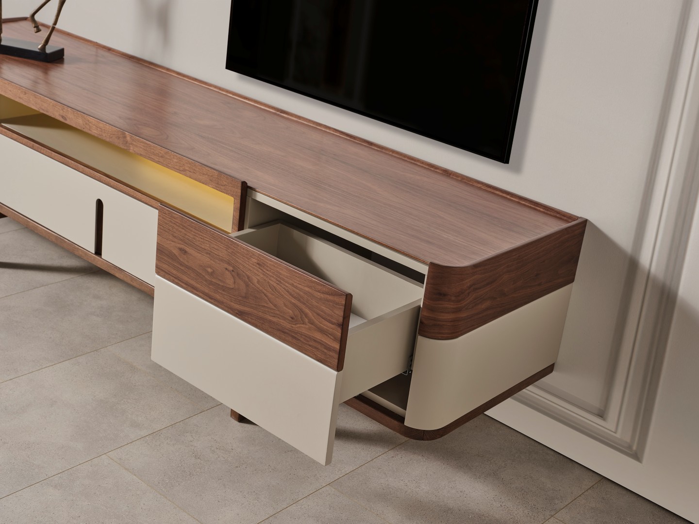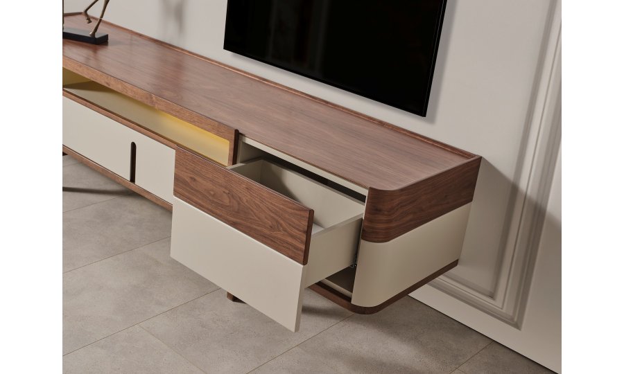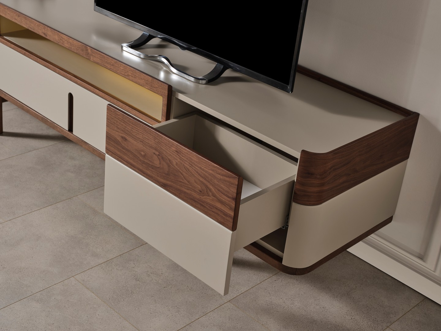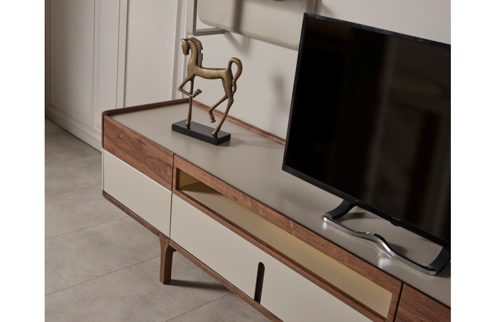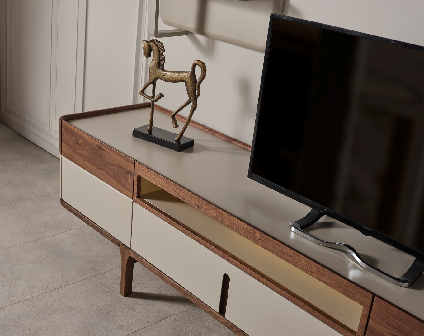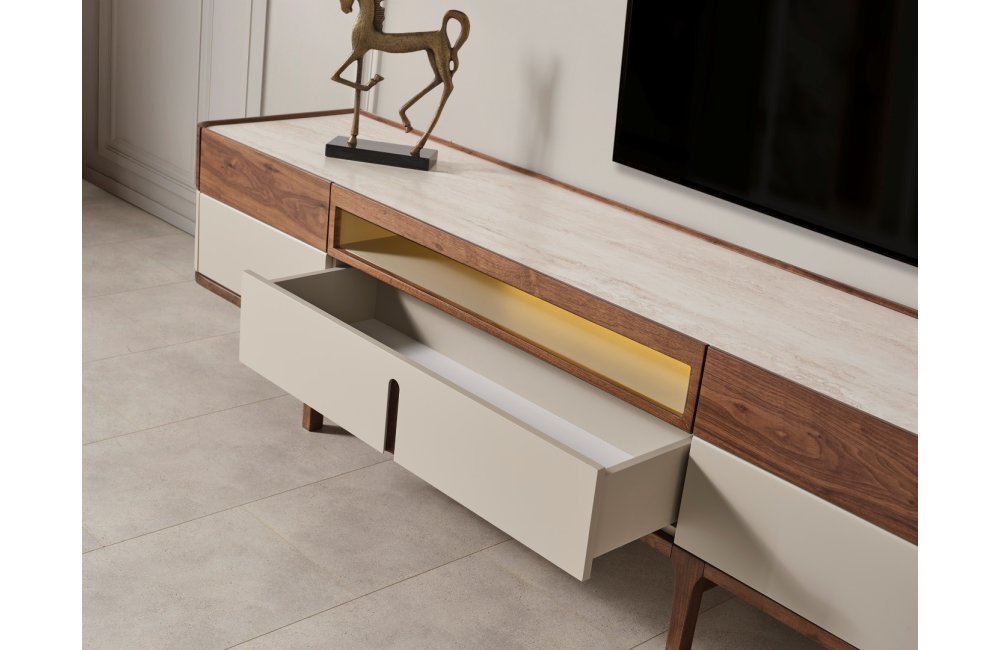 • TV ünitesi alt blok üst tablasında kum taşı rengi, ceviz ve mermer desen rengi seçeneği mevcuttur.