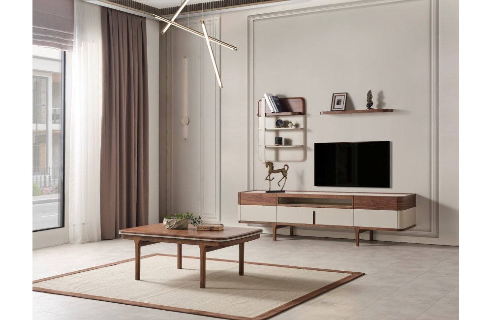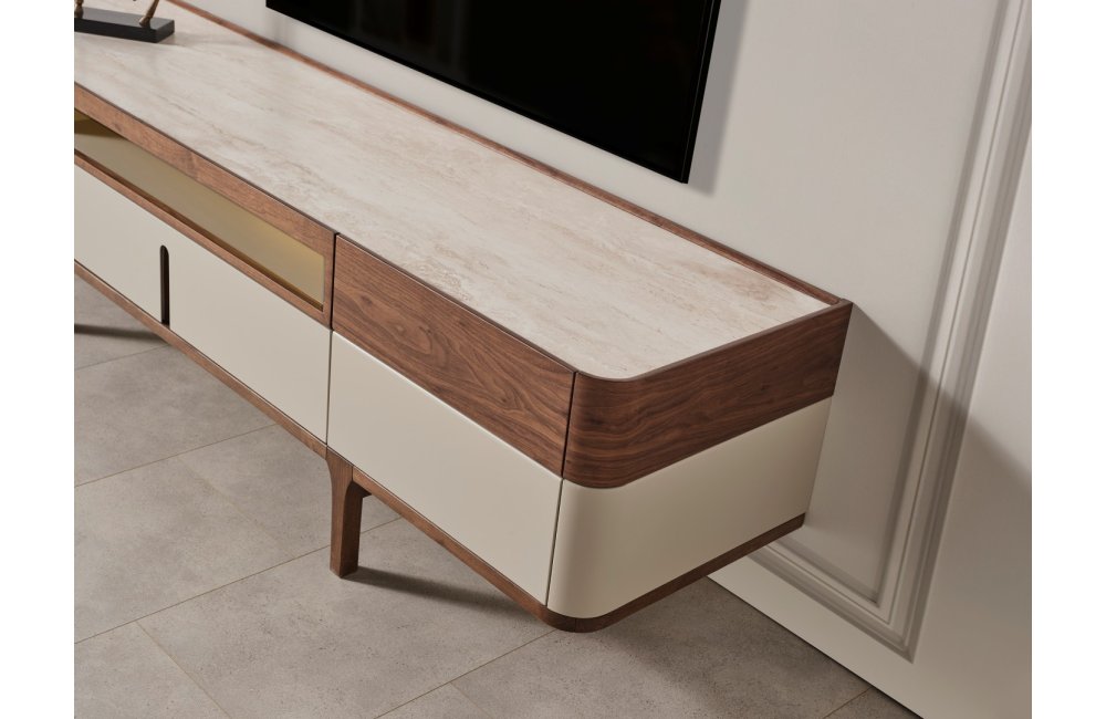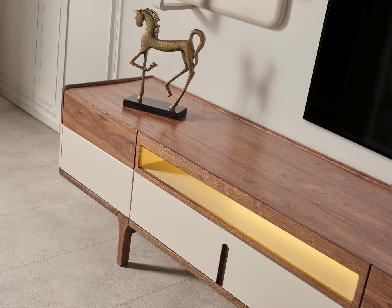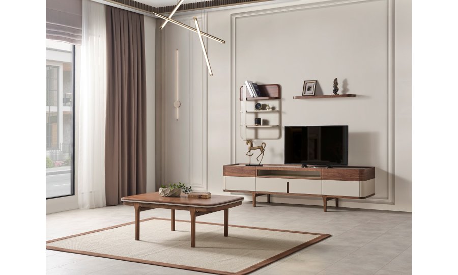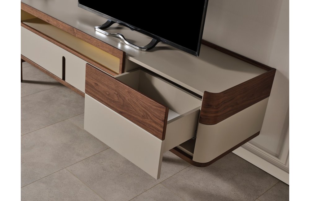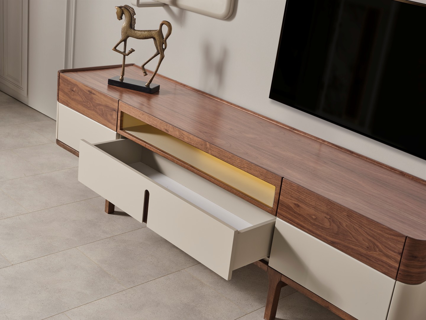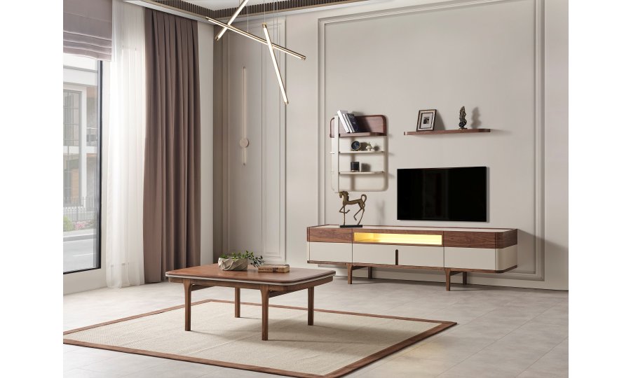 • TV ünitesi alt blok üst tablasında kum taşı rengi, ceviz ve mermer desen rengi seçeneği mevcuttur.