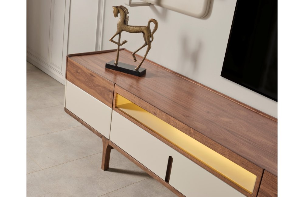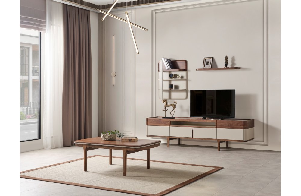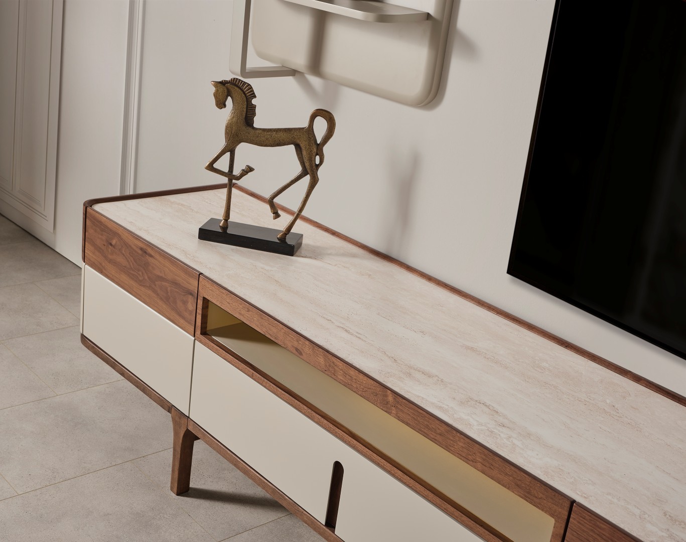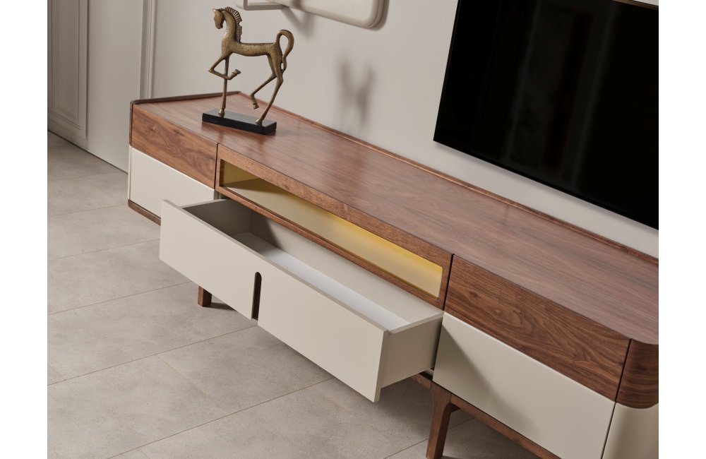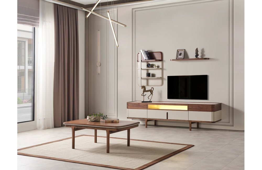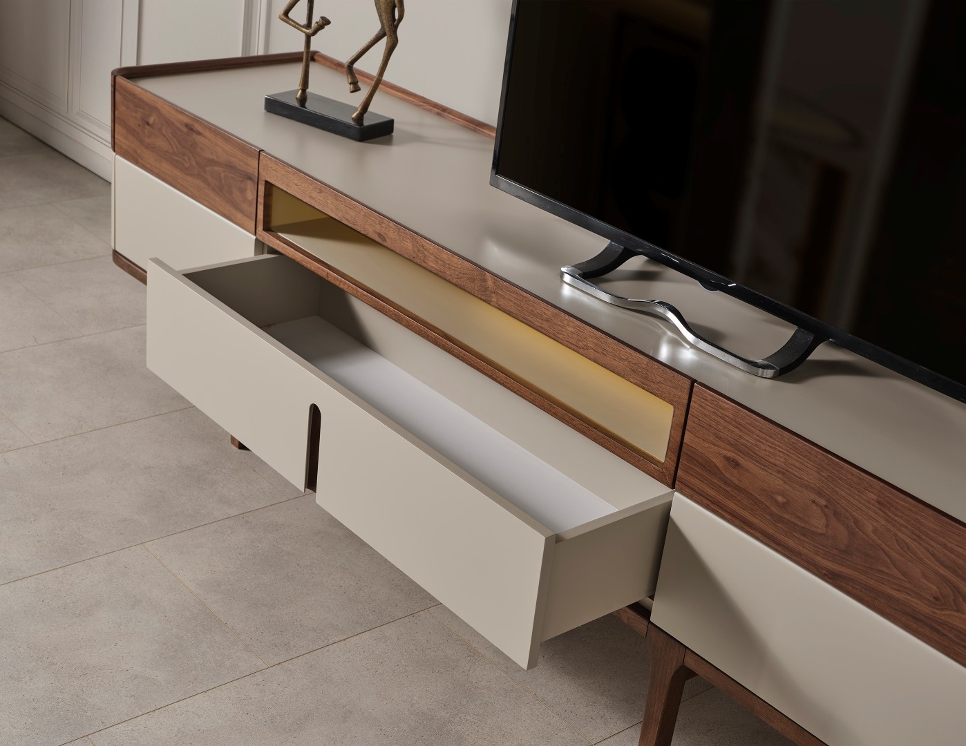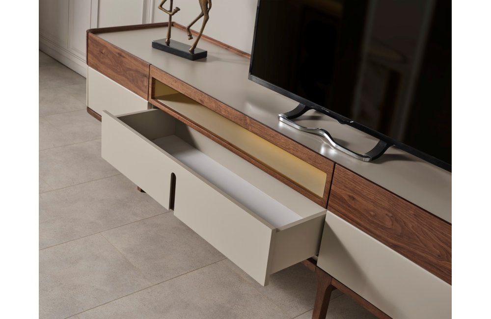 • TV ünitesi alt blok üst tablasında kum taşı rengi, ceviz ve mermer desen rengi seçeneği mevcuttur.