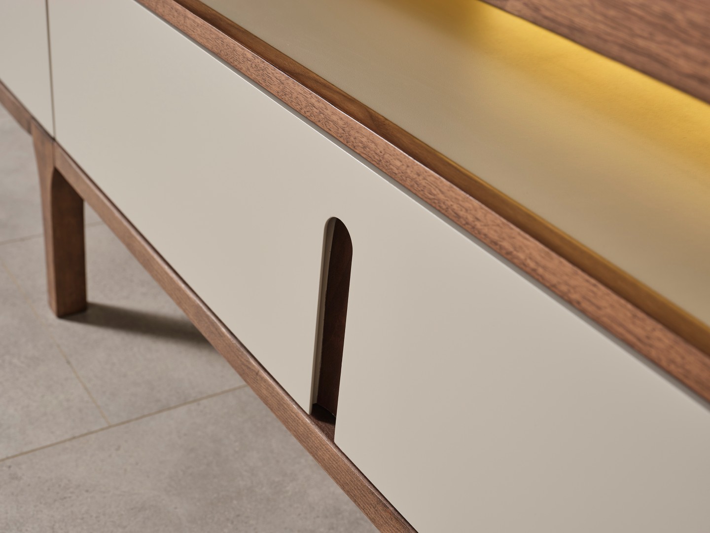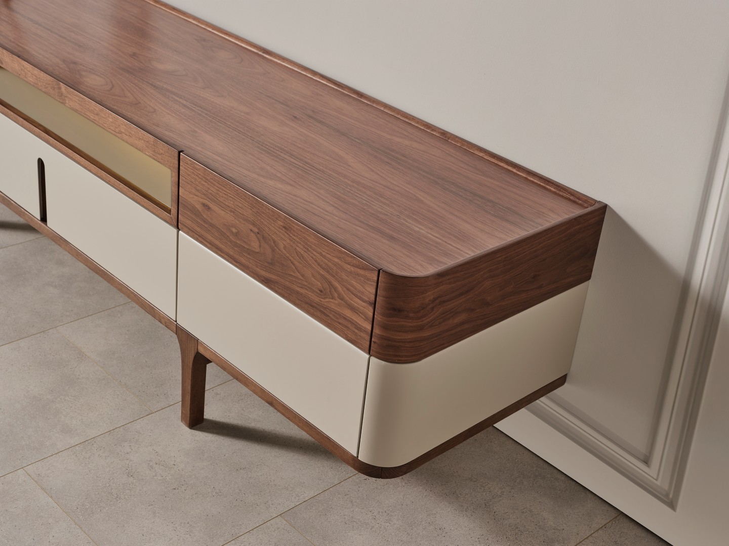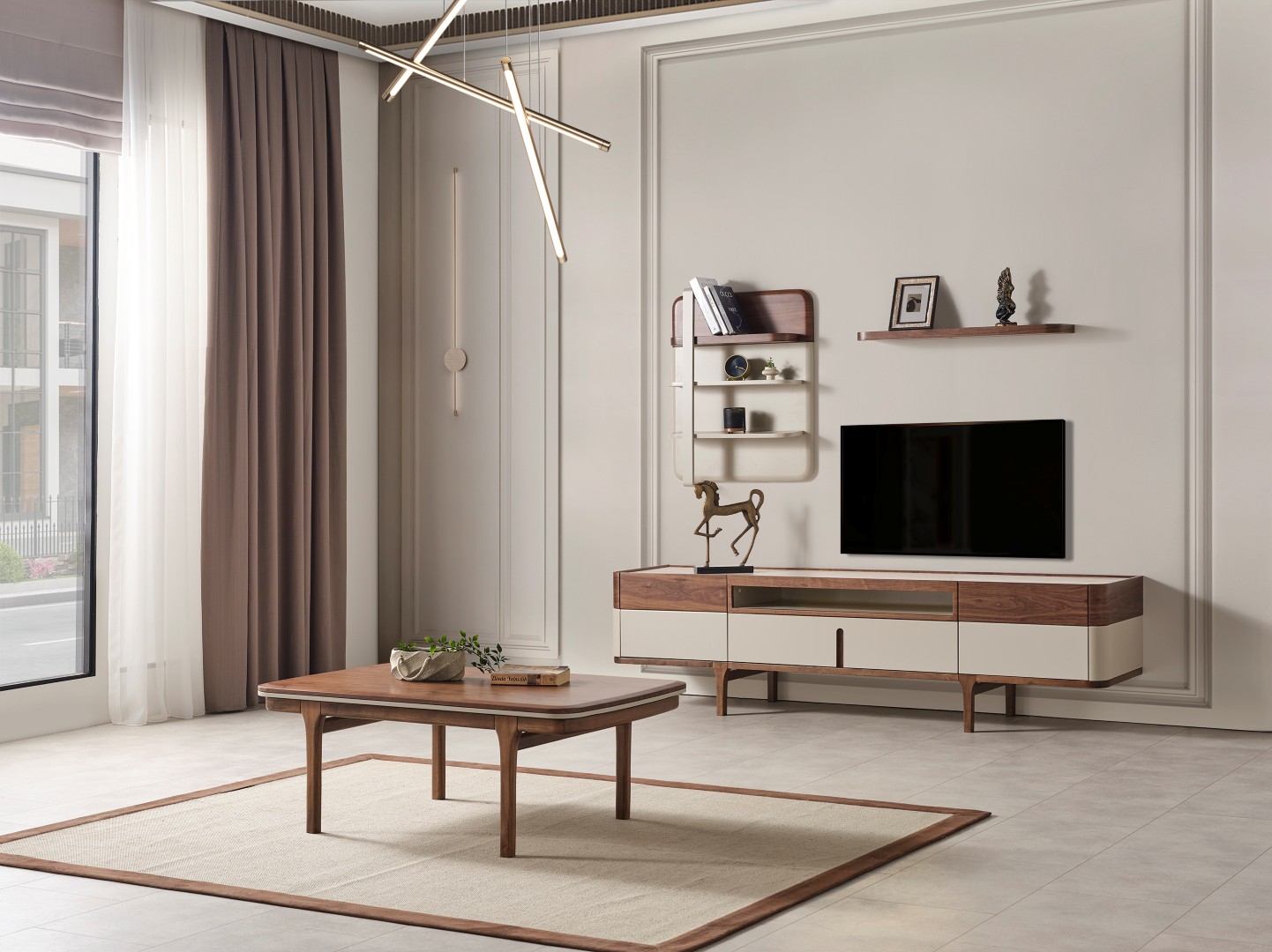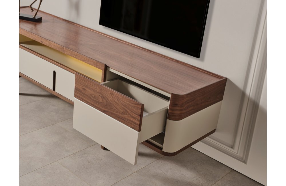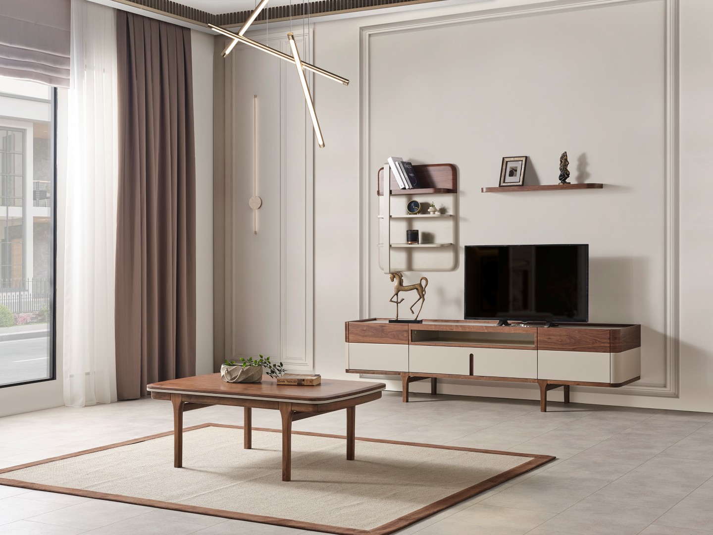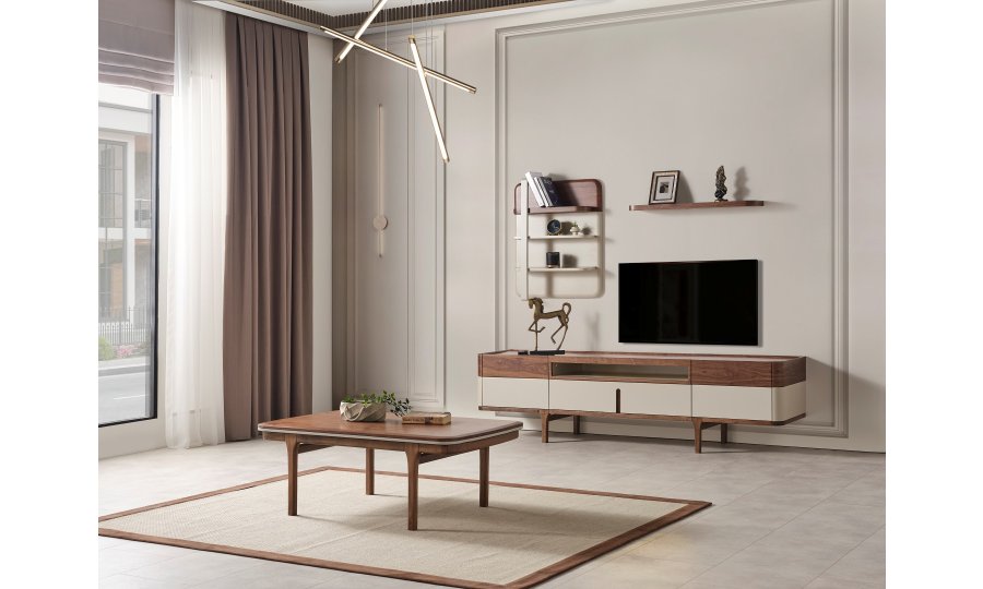 • TV ünitesi alt blok üst tablasında kum taşı rengi, ceviz ve mermer desen rengi seçeneği mevcuttur.