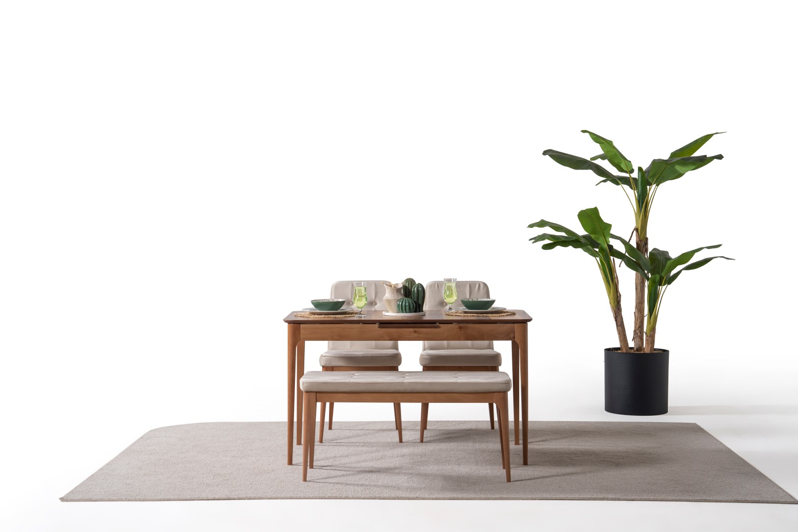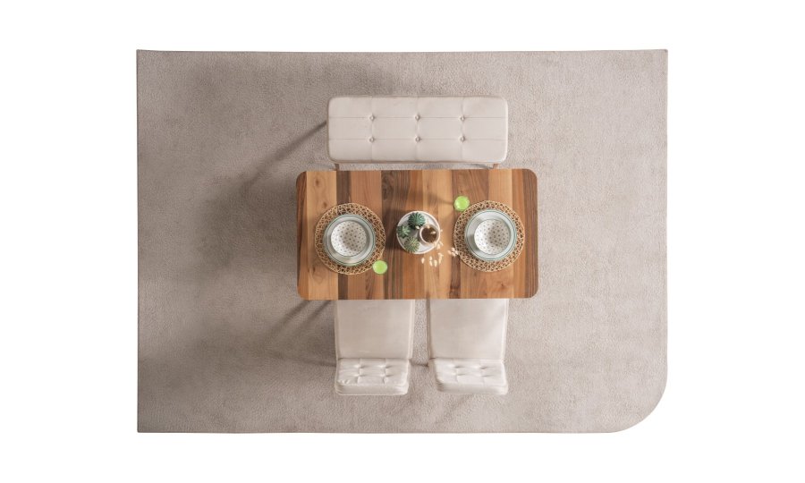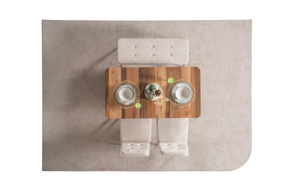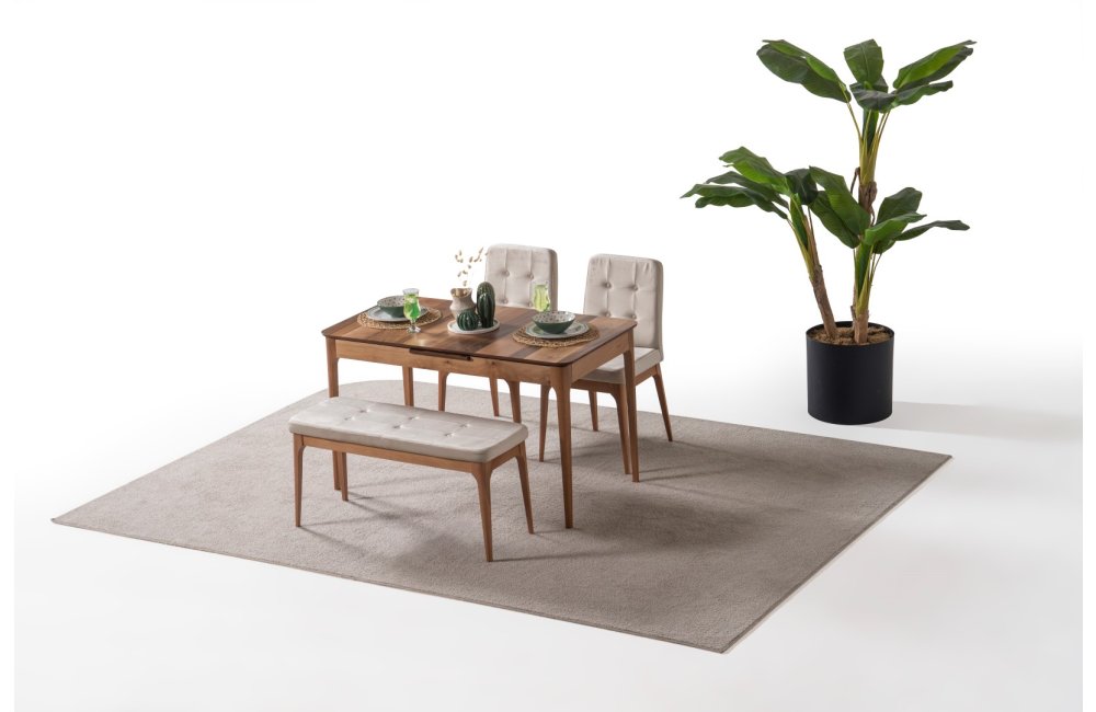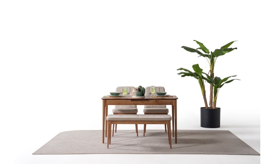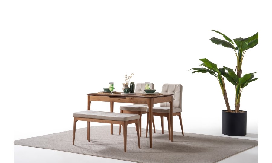 1 ad. masa, 1 ad. sandalye ve 1 ad. benchden oluşmaktadır. Puf opsiyonel olarak satışa sunulmuştur.