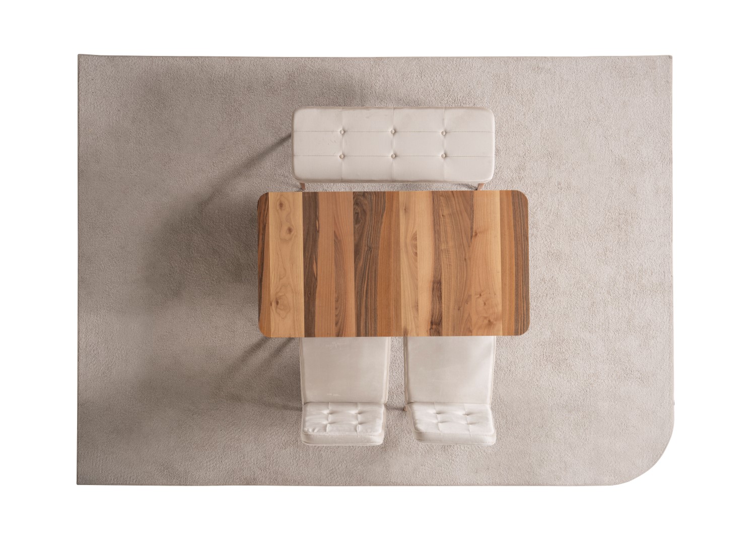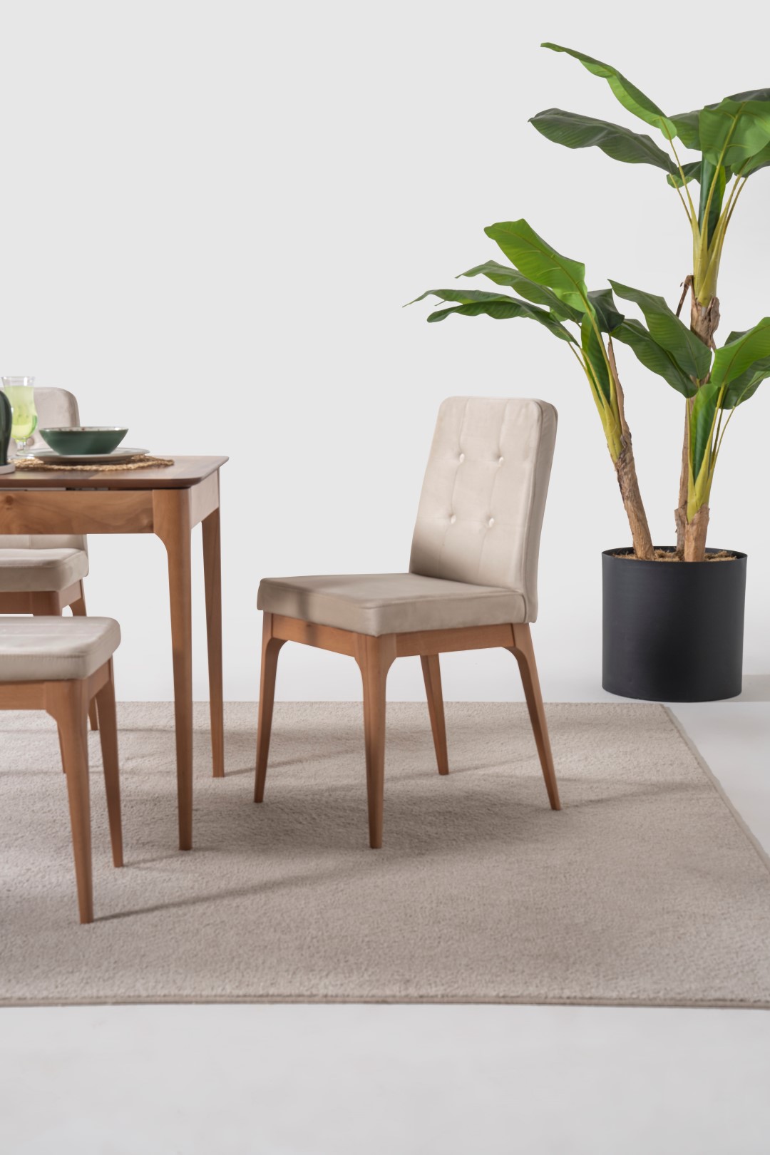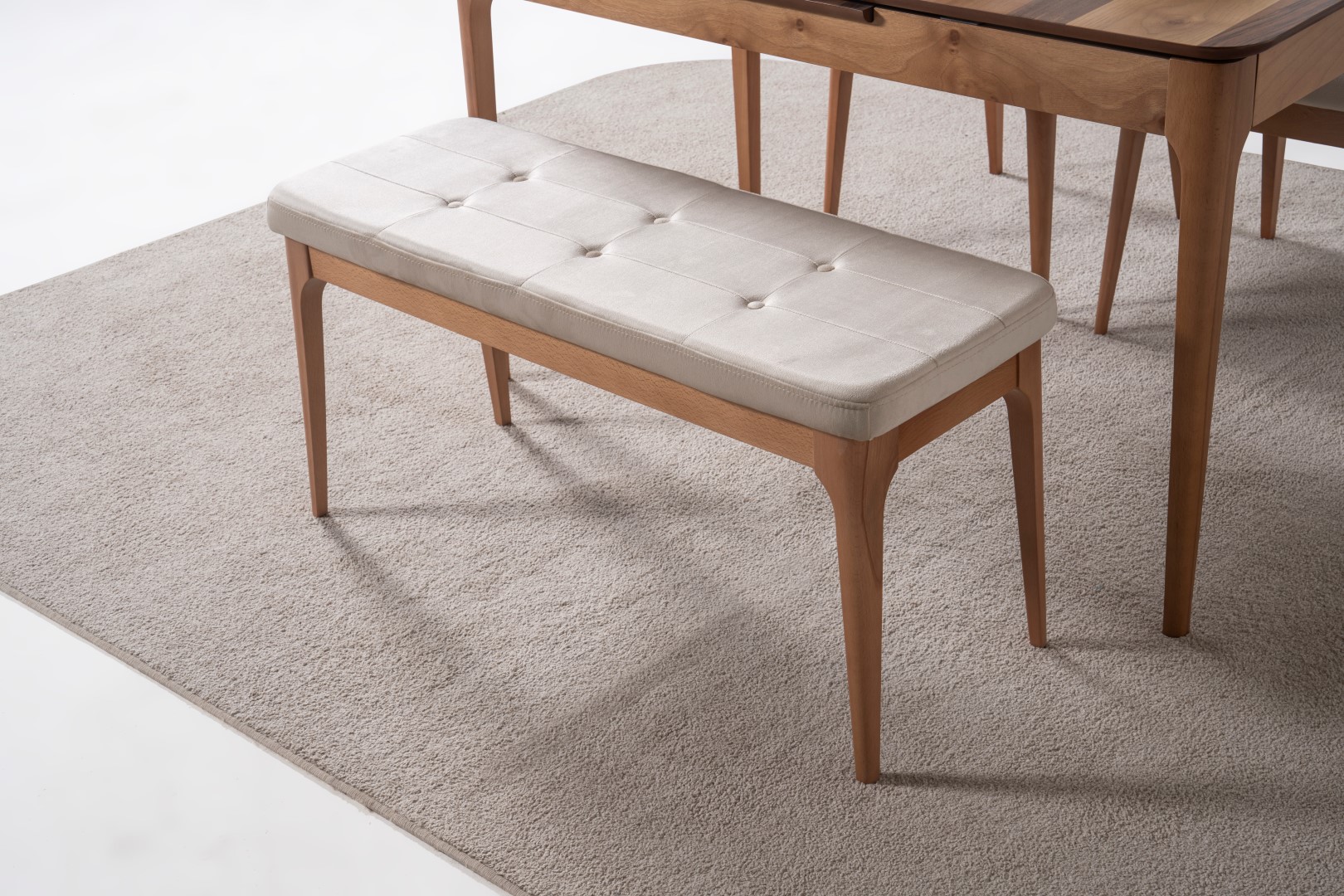 1 ad. masa, 1 ad. sandalye ve 1 ad. benchden oluşmaktadır. Puf opsiyonel olarak satışa sunulmuştur.