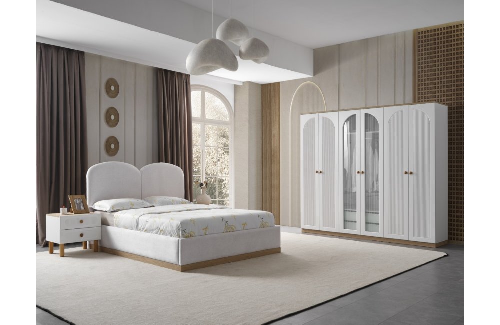 1ad.6 kapaklı dolap( 4 boyalı+2 camlı), 1ad.karyola (içi boş) , 2ad. komodin , 1 ad.şifonyer , 1ad. aynadan oluşmaktadır. Bazalı takım ve tekil parçalar opsiyonel olarak satışa sunulmuştur.