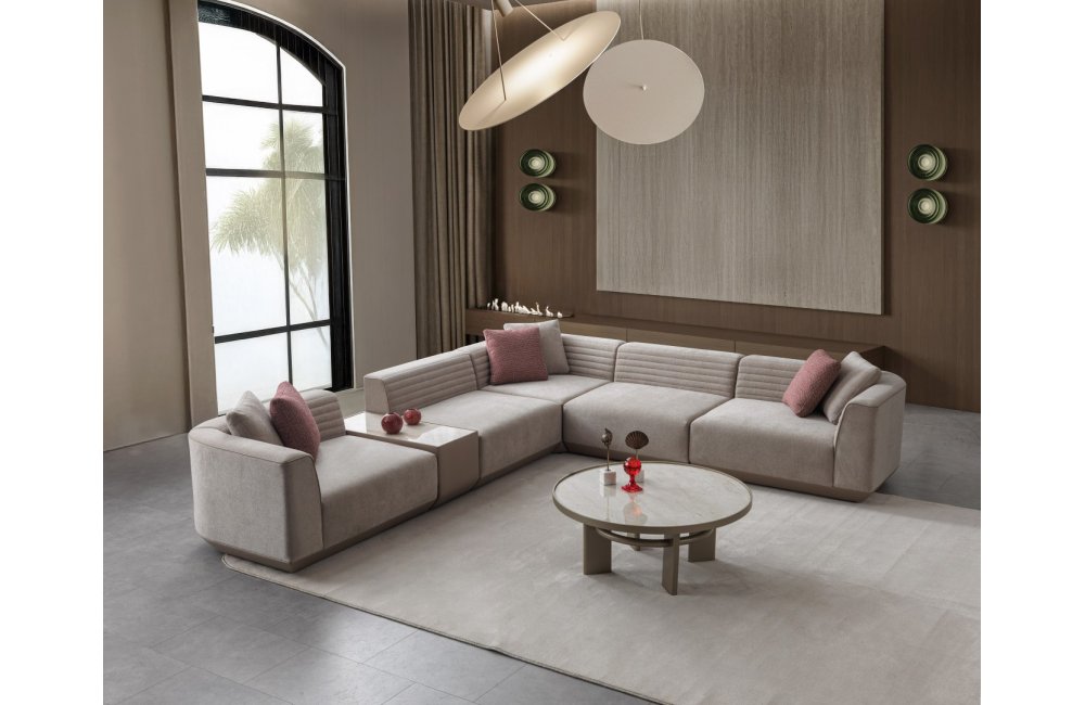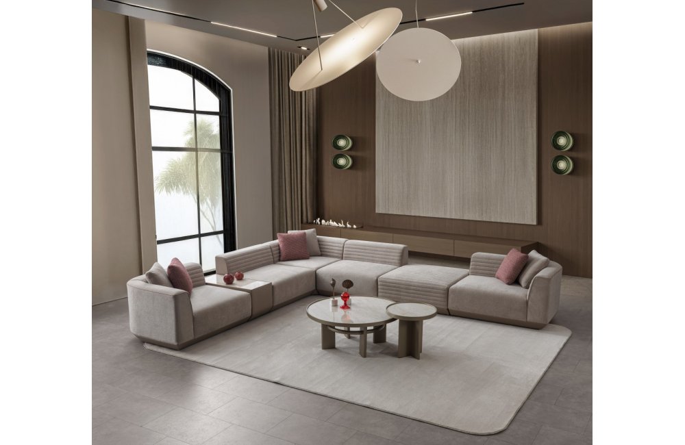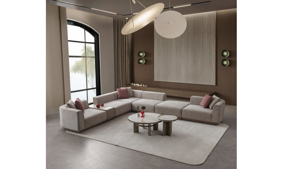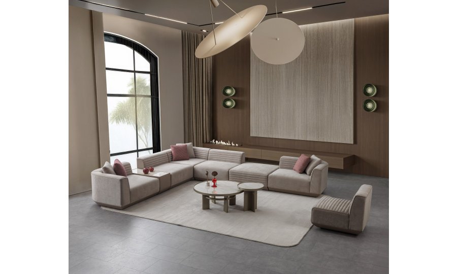 2 ad. kollu modül, 2 ad. ara kolsuz modül, 1 ad. köşe modül, 1 ad. puf ve 1 ad. sehpa modülden oluşmaktadır.