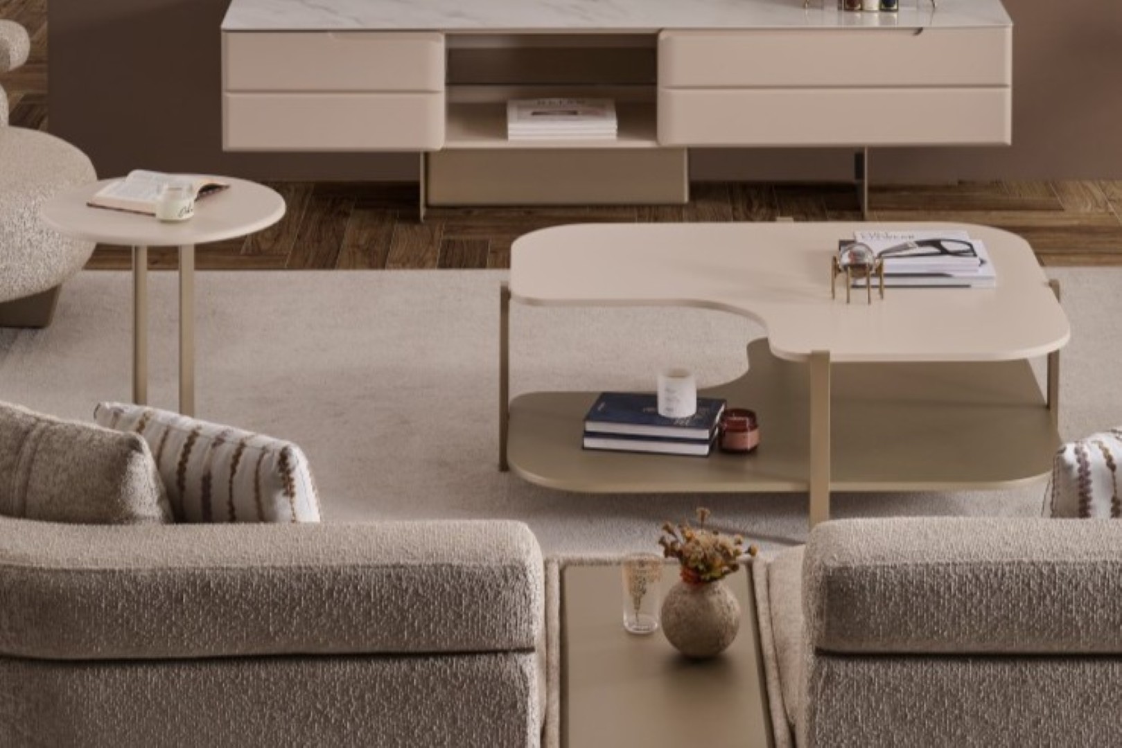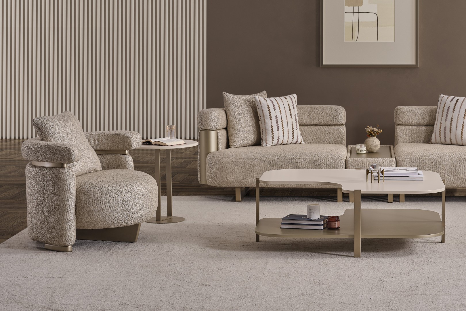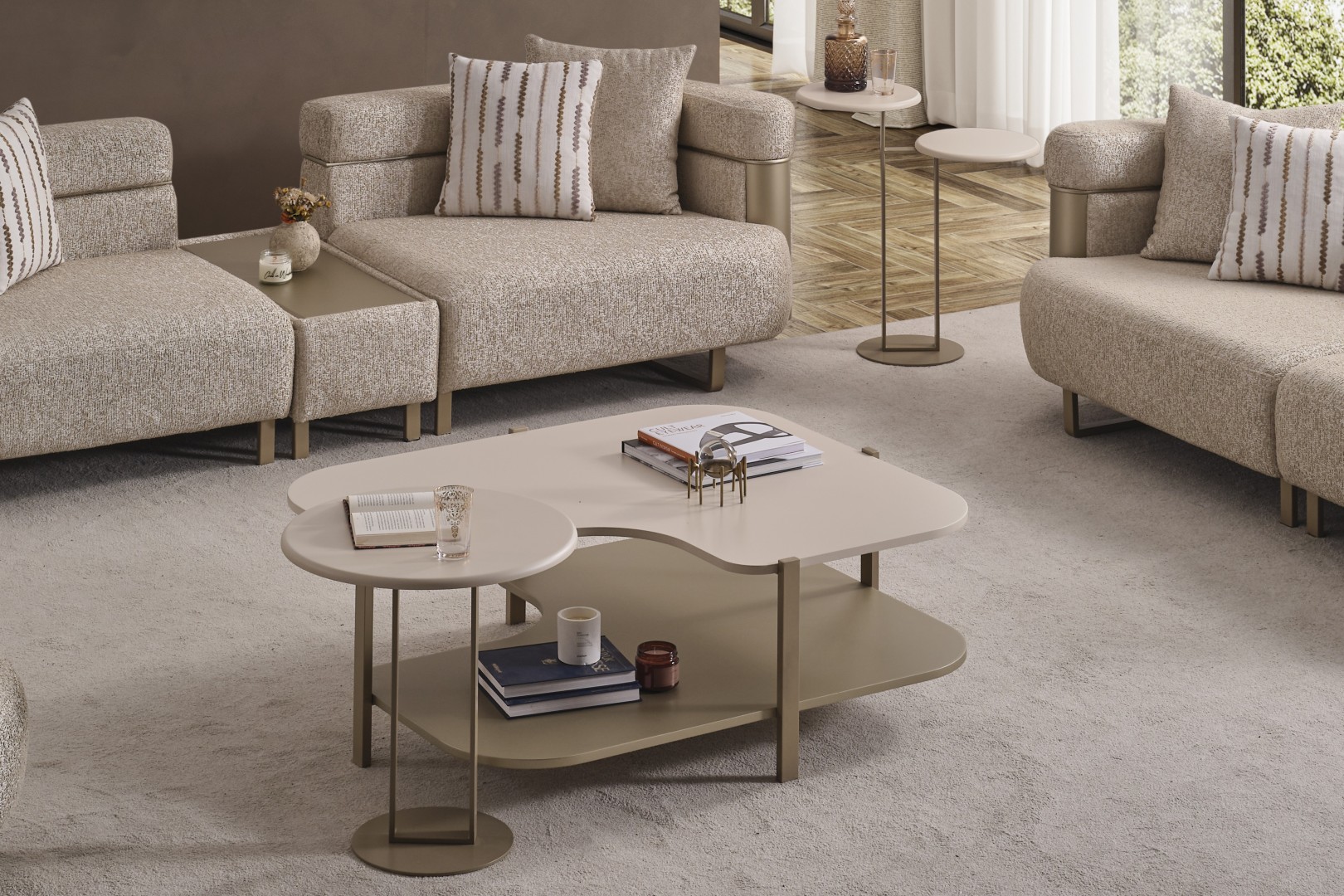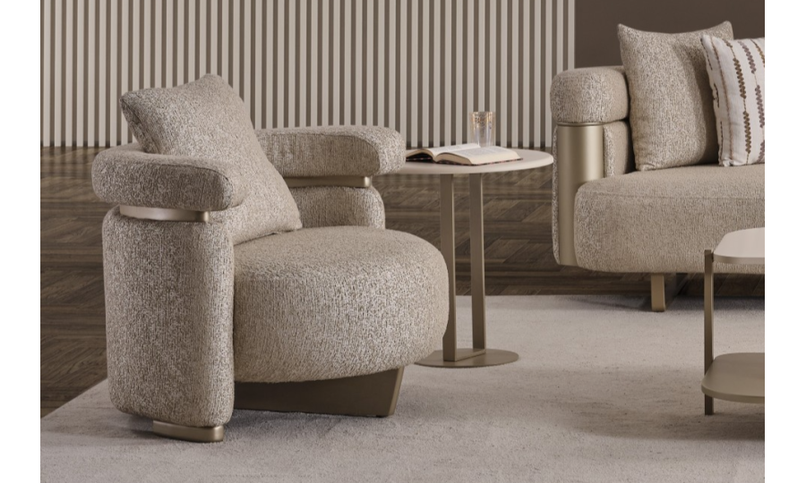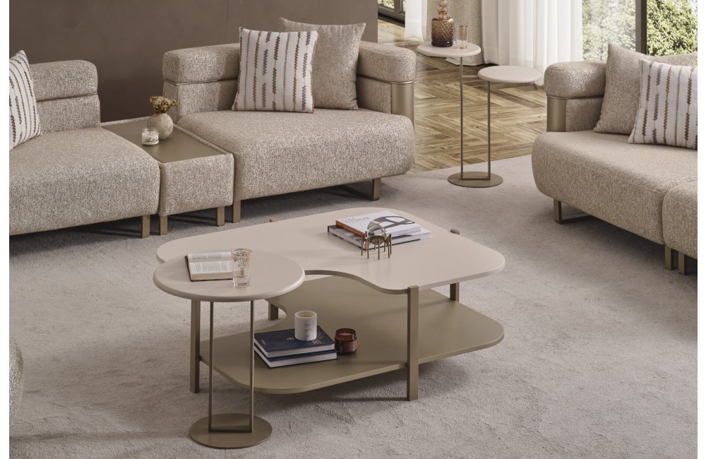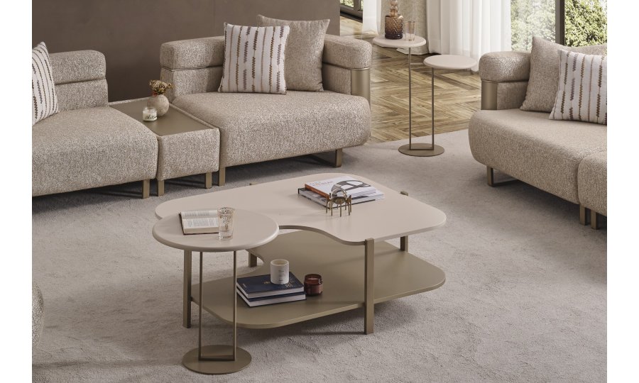 • Yan Sehpa: Koltuk kenarlarında fonksiyonel bir kullanım sunan bu model, minimal yapısı ve dore ayak tasarımıyla serinin diğer parçalarıyla mükemmel uyum sağlar.