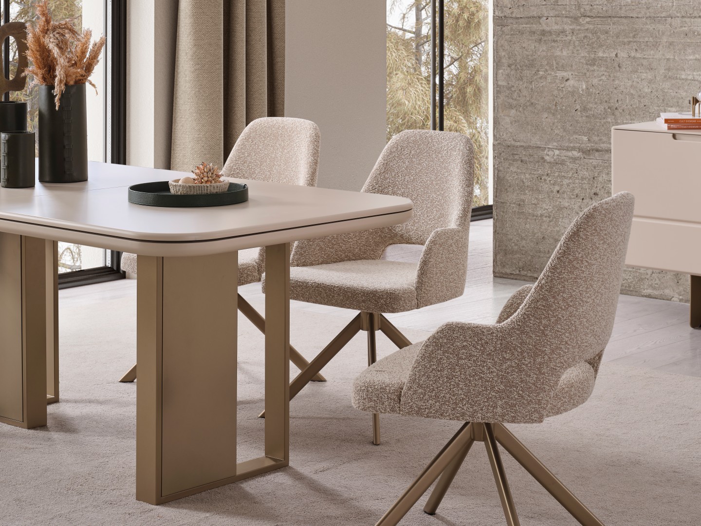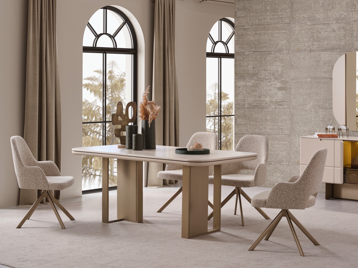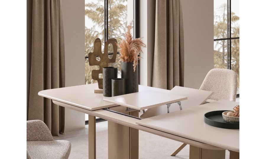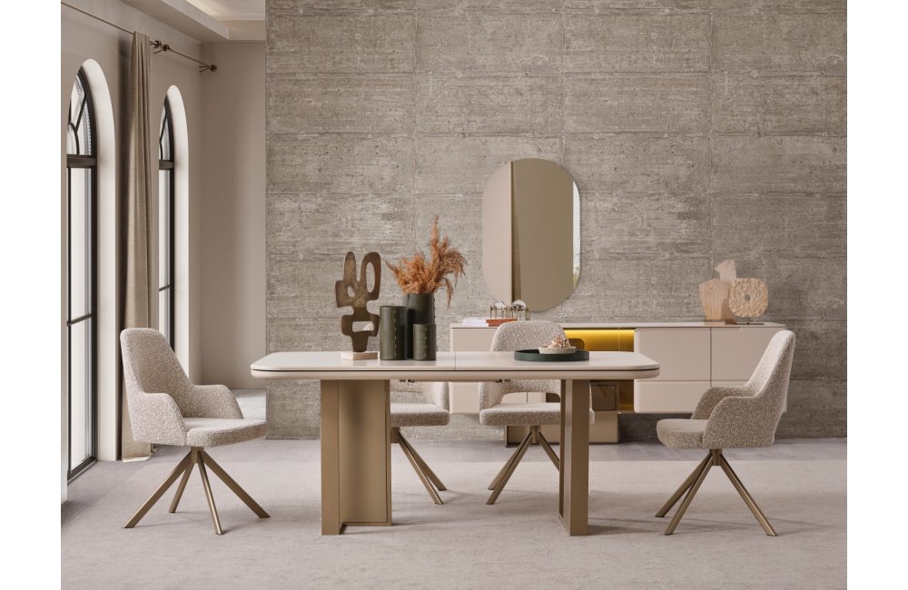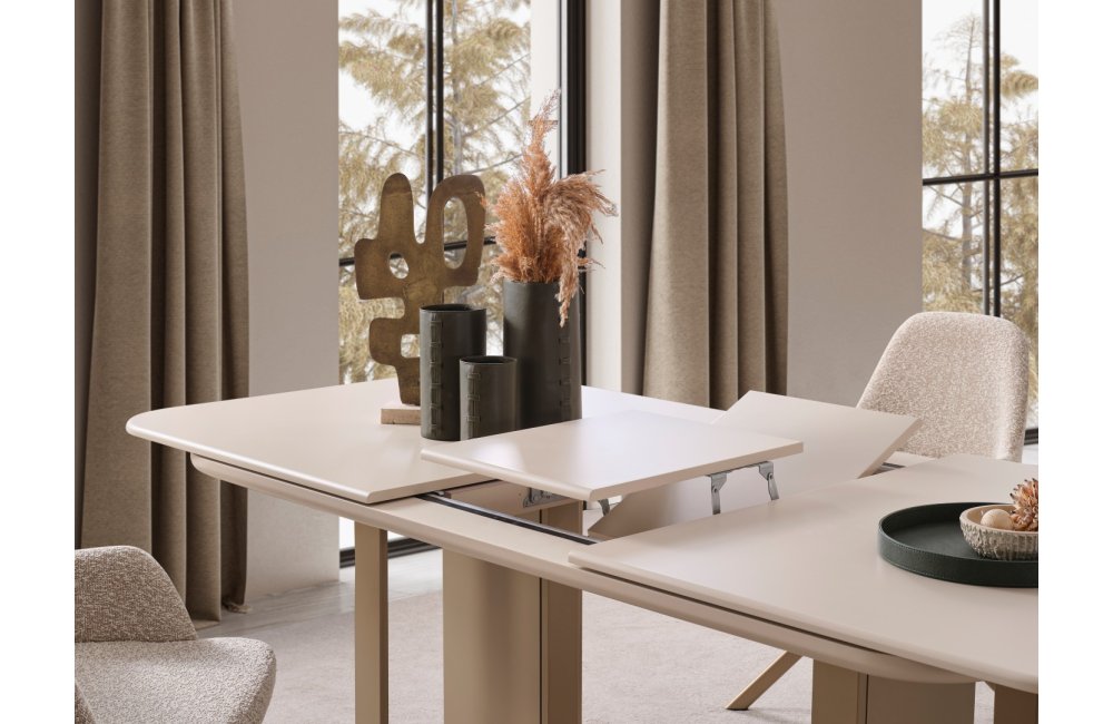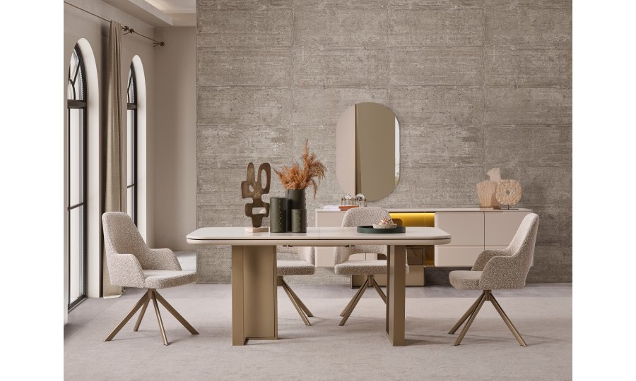 Zarif detaylar ve akıllı çözümler Oslo Soft Yemek Masası'nda birleşiyor. Ovalleştirilmiş köşe hatları sayesinde mekanınıza yumuşak bir görünüm kazandıran masa, genişleyebilen orta mekanizması ile kalabalık misafirlerinizi ağırlamak için saniyeler içinde hazır hale geliyor. Sağlam ayak yapısı ve bronz/metalik tonlardaki detayları, masanın modern kimliğini tamamlıyor. Estetikten ödün vermeden fonksiyonellik arayanlar için ideal bir tercih.