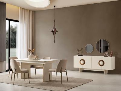 1ad. konsol, 1ad. konsol aynası, 1ad. masa ve 6ad. sandalyeden oluşmaktadır. Vitrin opsiyonel olarak satışa sunulmuştur.