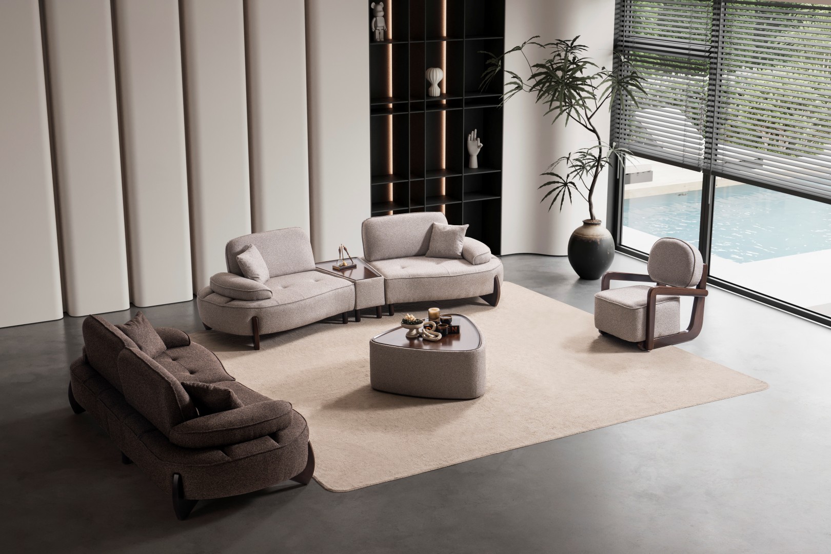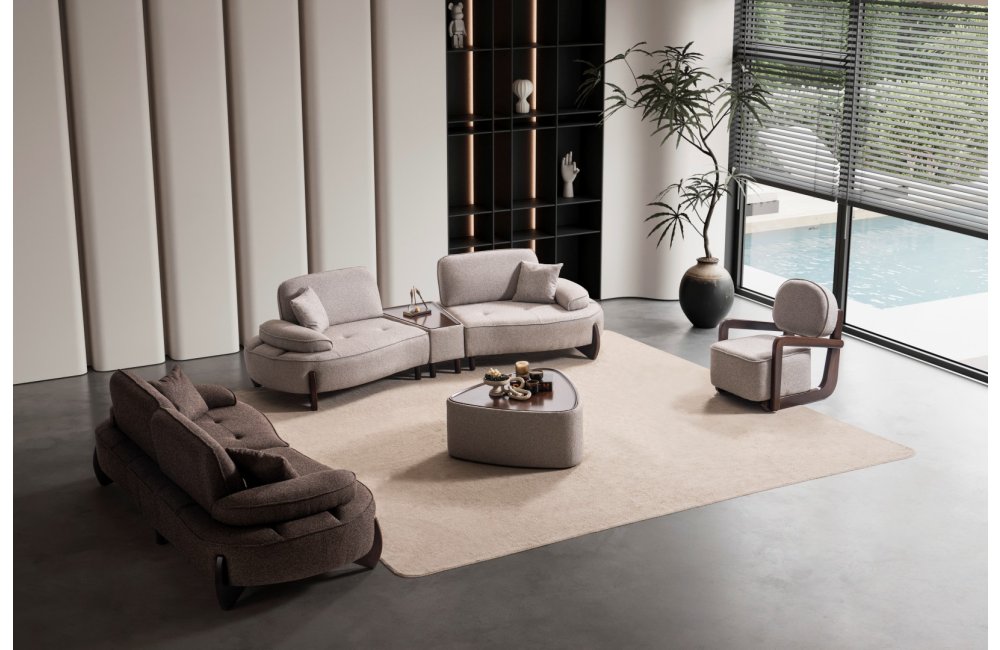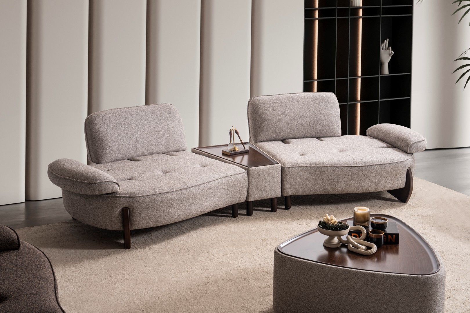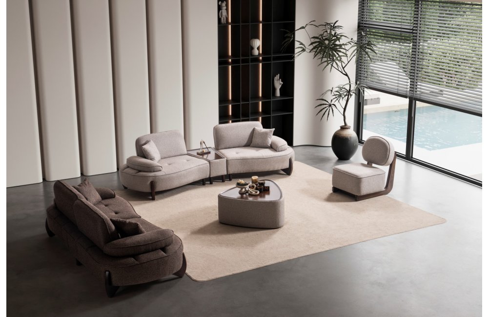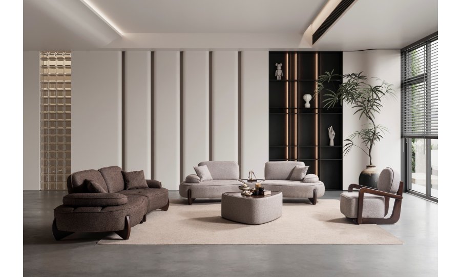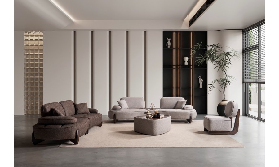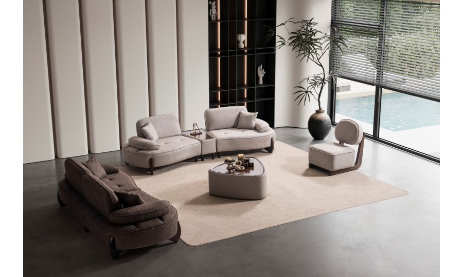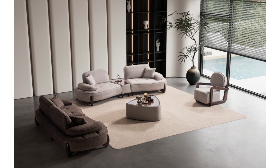 Palma Koltuk Takımı, alışılmışın dışındaki kavisli hatları ve fonksiyonel detaylarıyla yaşam alanlarına modern bir dokunuş katıyor. Minimalist tasarım anlayışını konforla birleştiren bu set; modüler yapısı, dokulu kumaş seçimi ve ahşap detaylarıyla dikkat çekiyor.