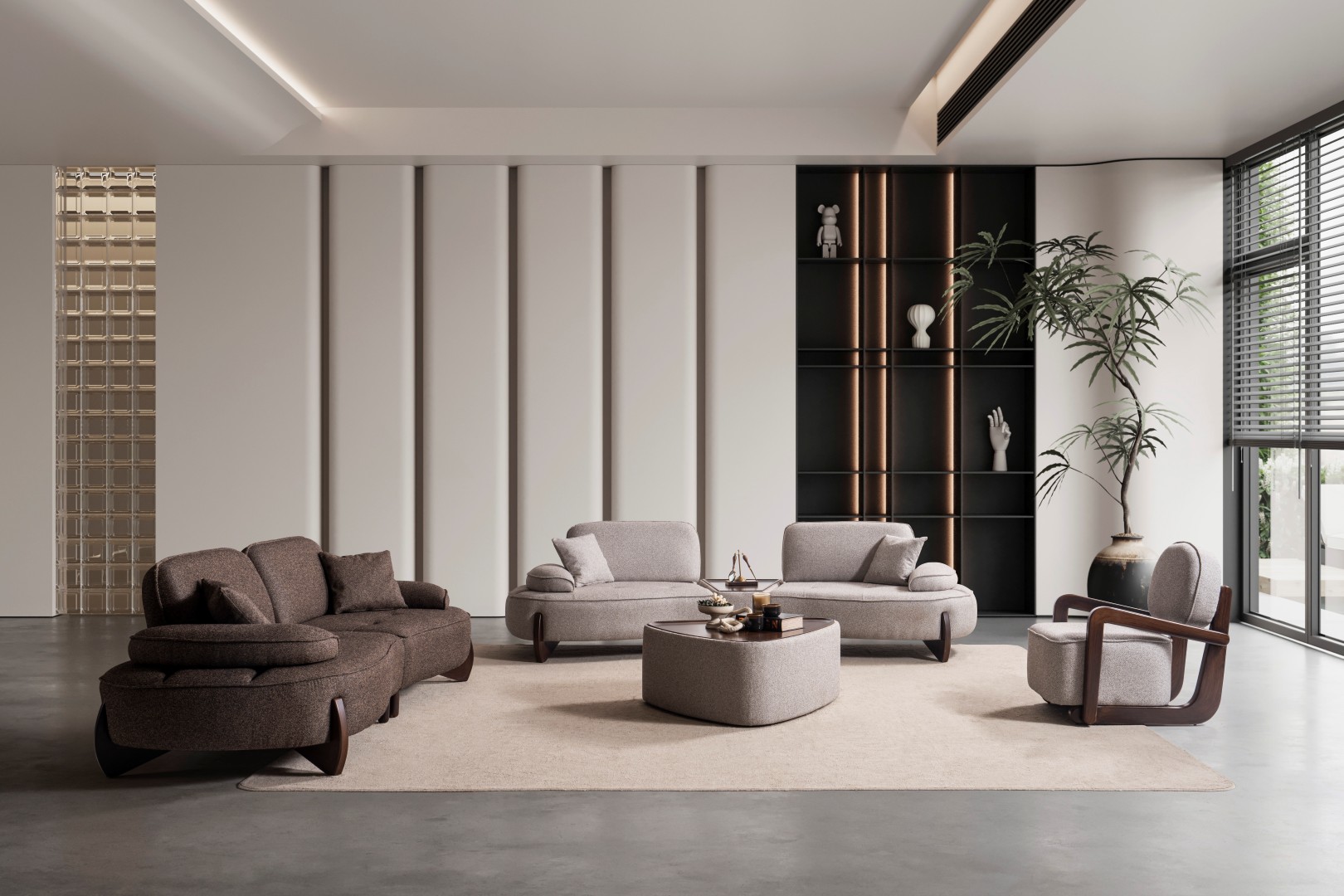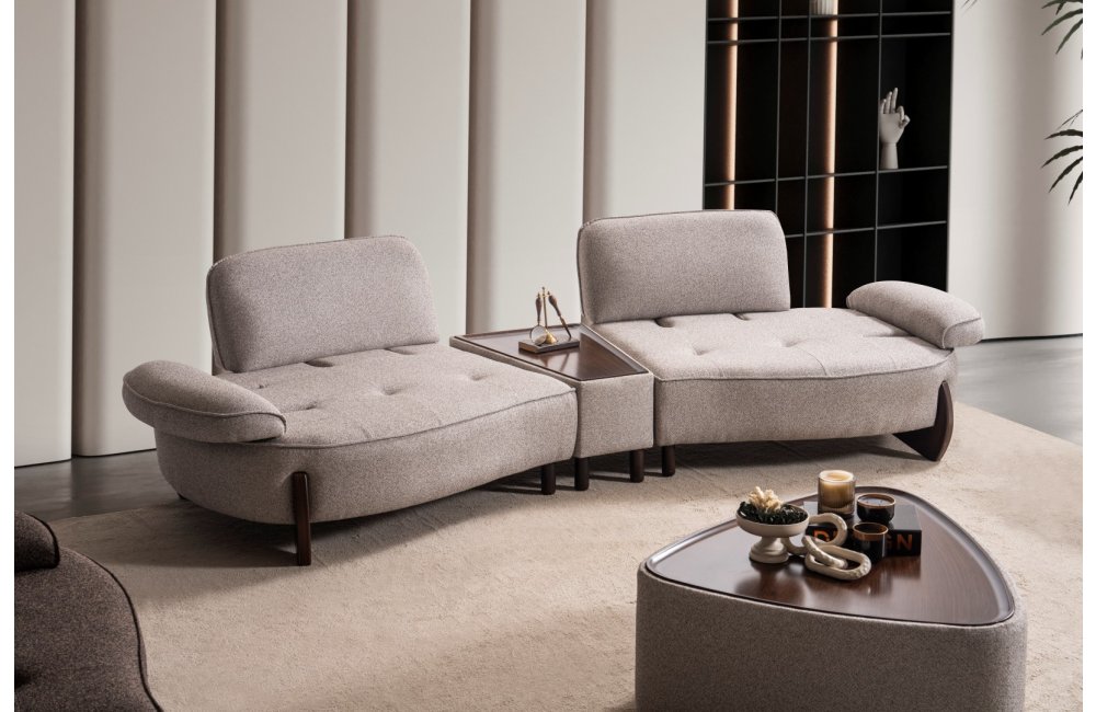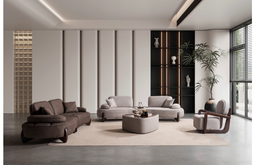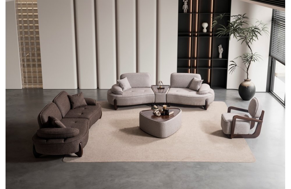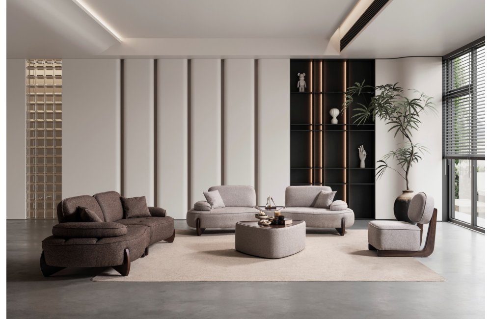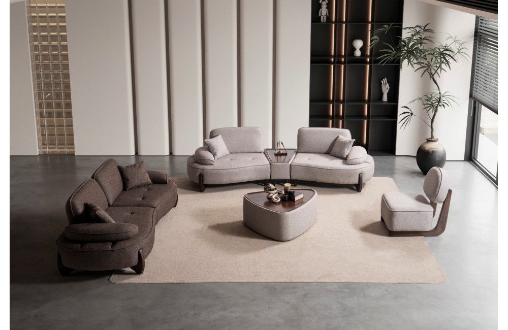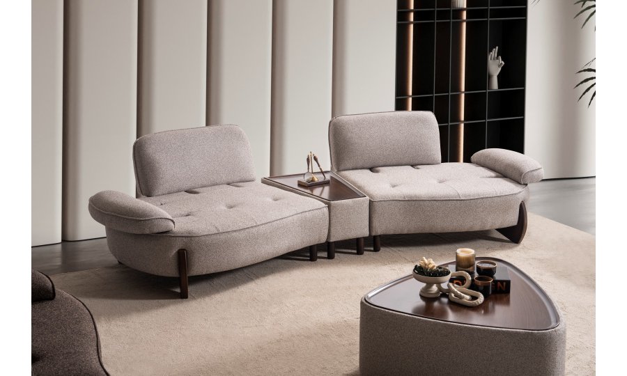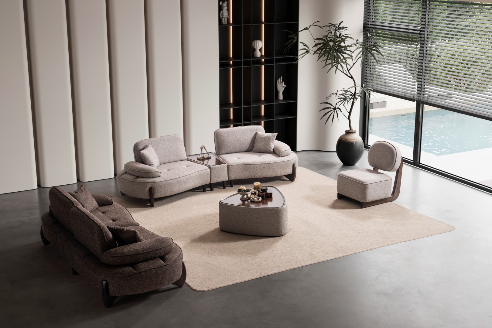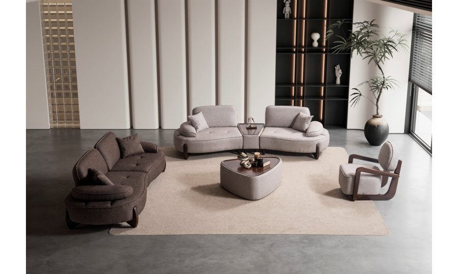 Palma Koltuk Takımı, alışılmışın dışındaki kavisli hatları ve fonksiyonel detaylarıyla yaşam alanlarına modern bir dokunuş katıyor. Minimalist tasarım anlayışını konforla birleştiren bu set; modüler yapısı, dokulu kumaş seçimi ve ahşap detaylarıyla dikkat çekiyor.