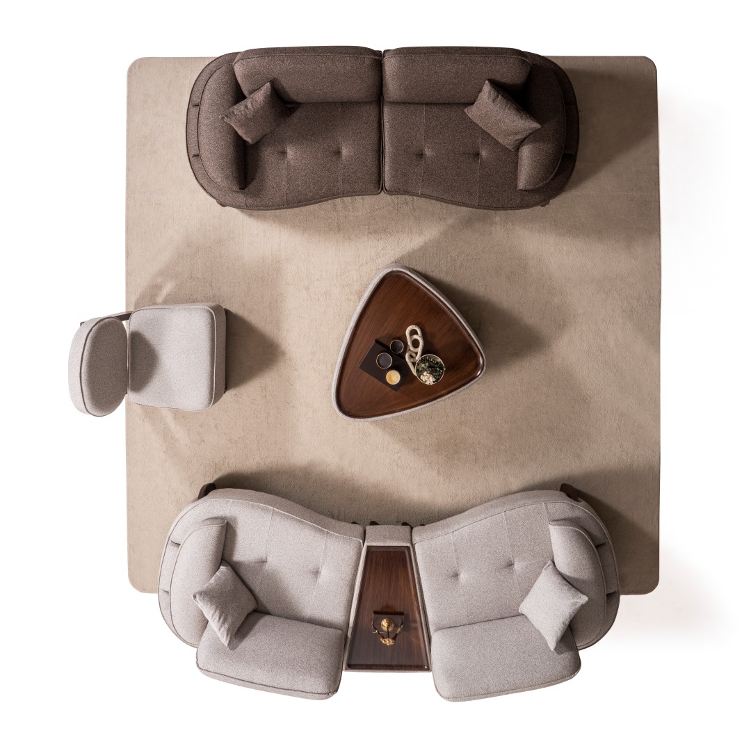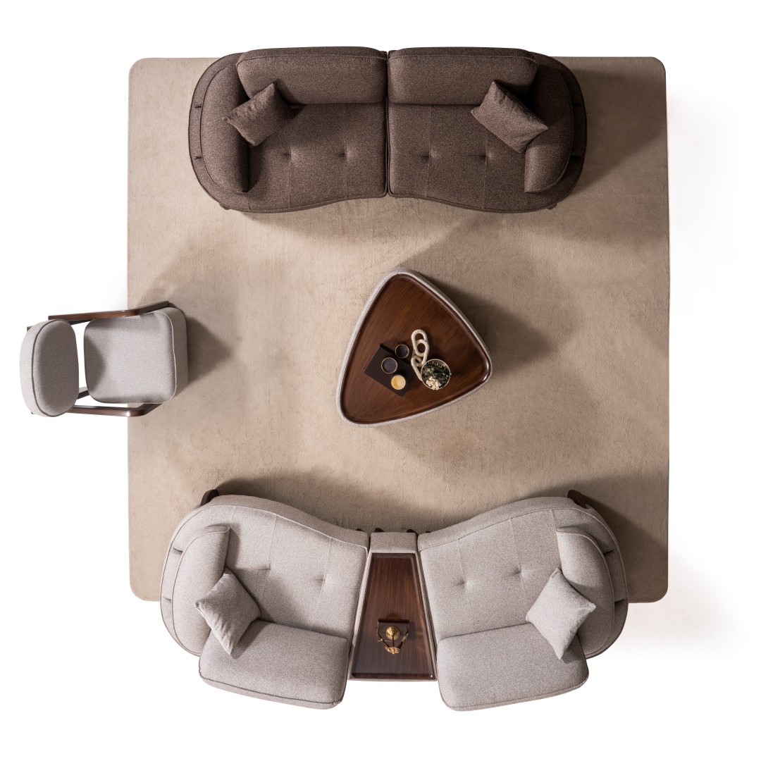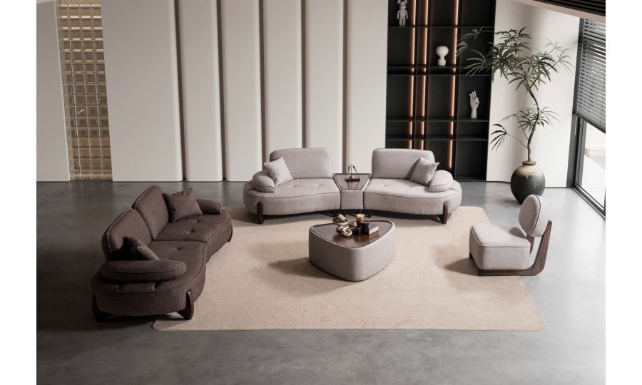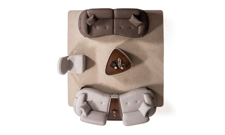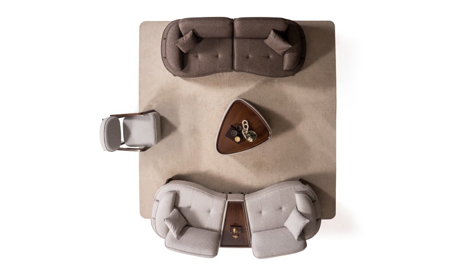 • Bütünleyici Parçalar: Takım genellikle üçgen formlu, yuvarlatılmış köşelere sahip orta sehpalarla kombinlenerek geometrik bütünlük tamamlanır.