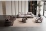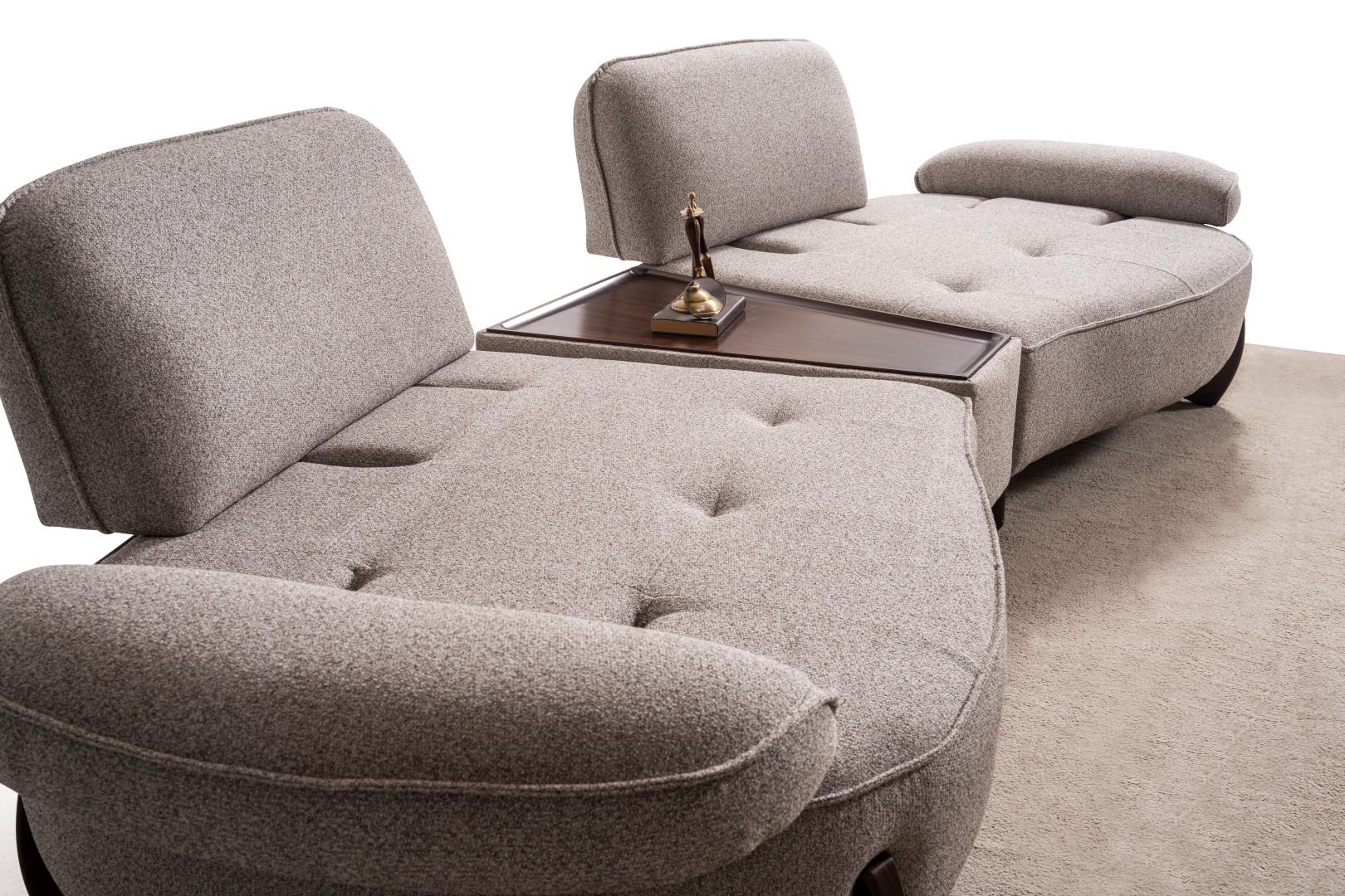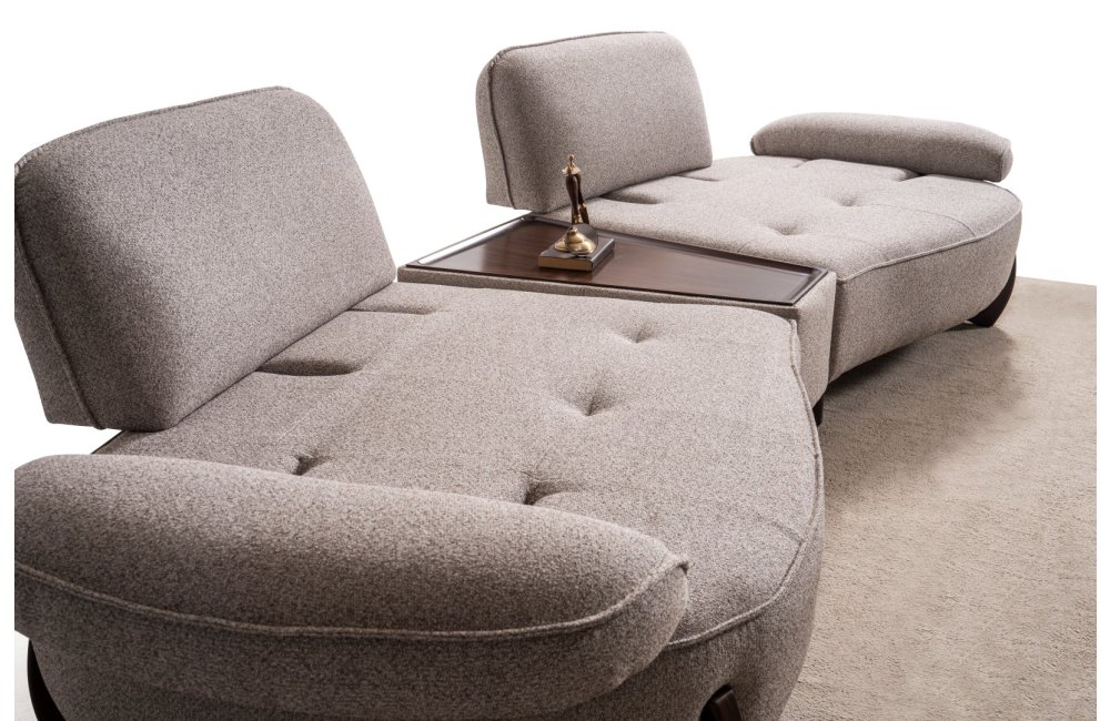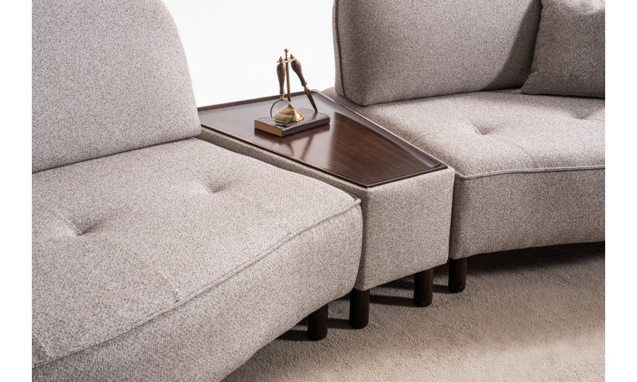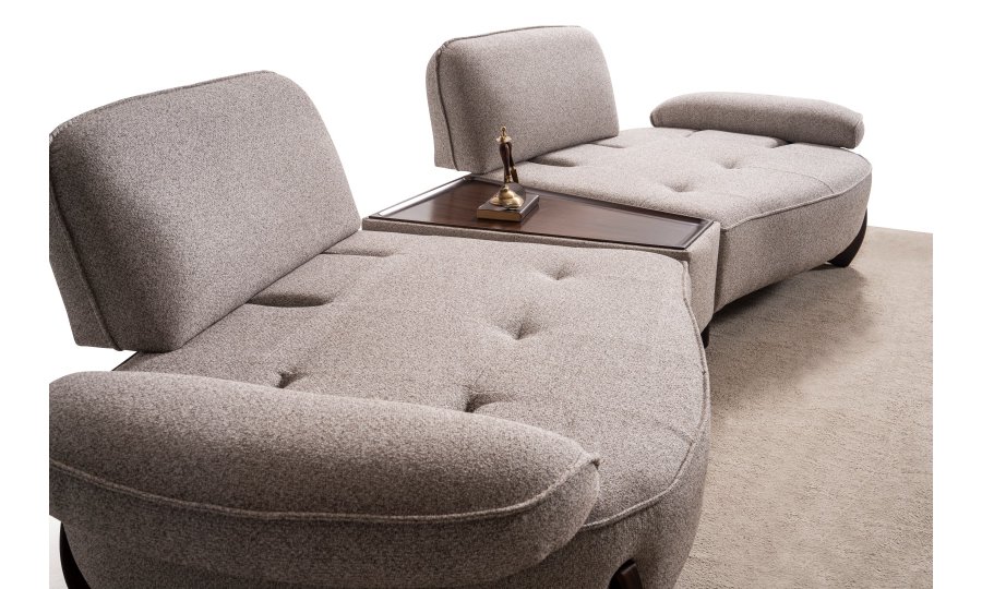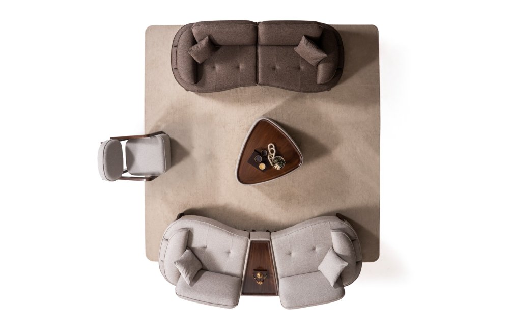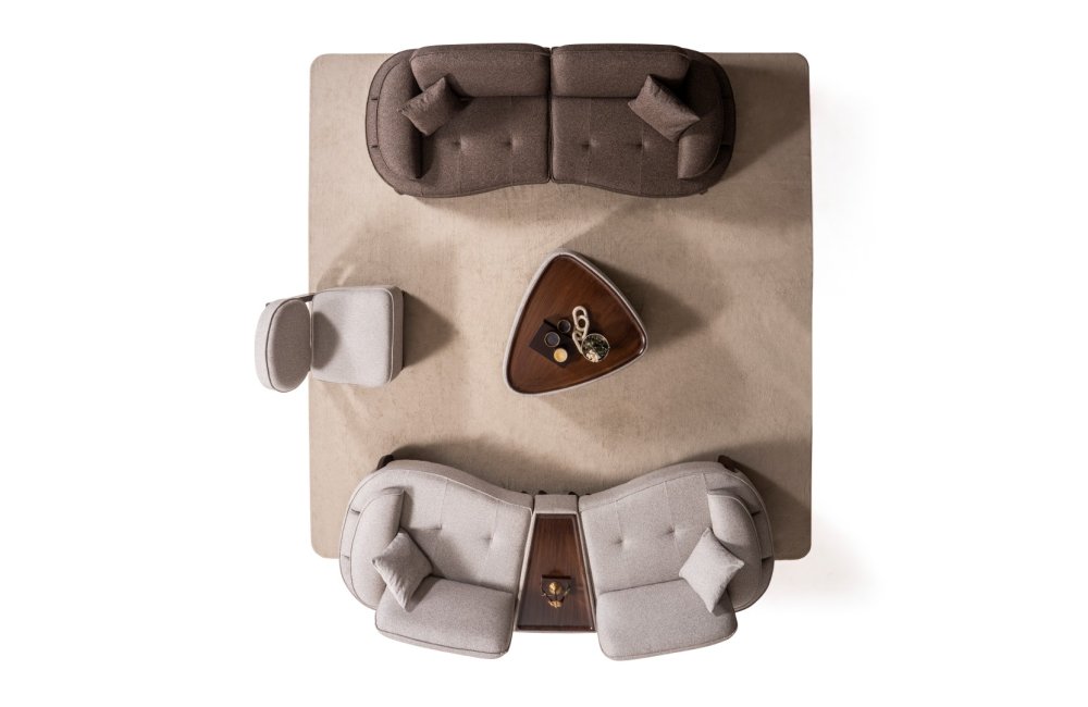 • Bütünleyici Parçalar: Takım genellikle üçgen formlu, yuvarlatılmış köşelere sahip orta sehpalarla kombinlenerek geometrik bütünlük tamamlanır.