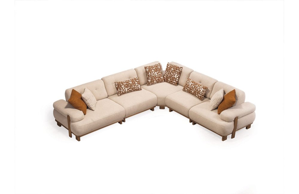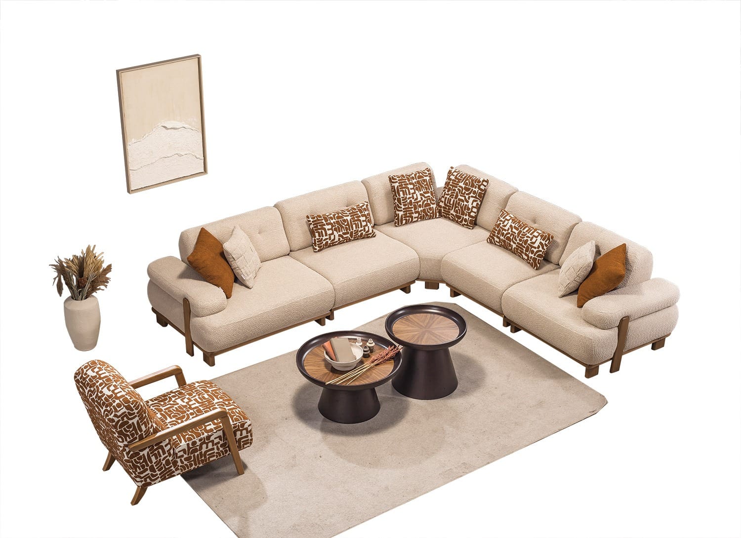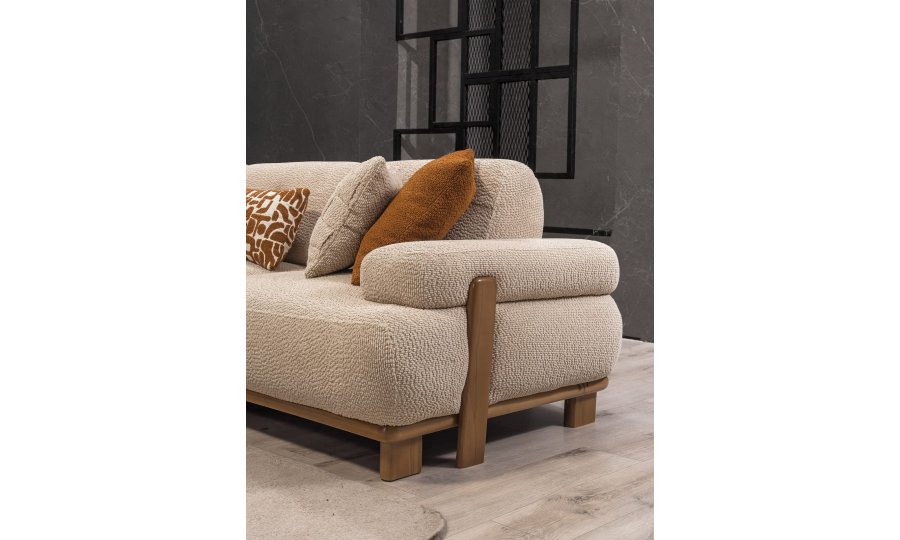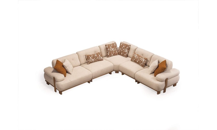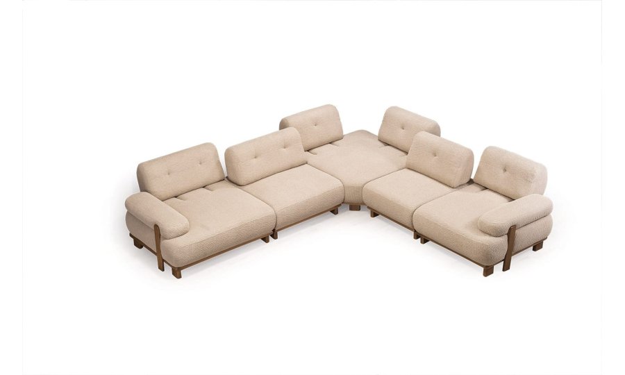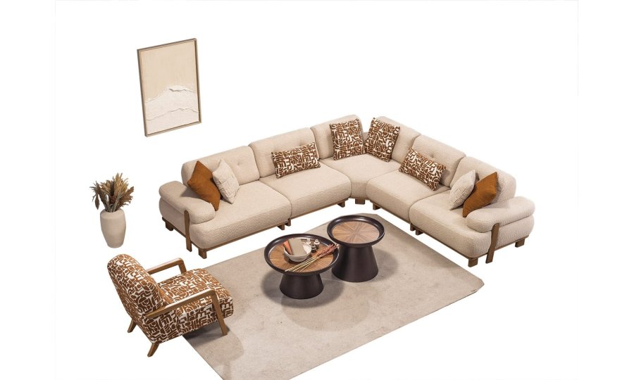 1ad. 90cm kollu modül, 1ad. 90cm ara piyon, 1ad. köşe modül, 1ad. 70cm ara piyon ve 1ad. 70cm kollu modülden oluşmaktadır. Dinlenme modül, berjer, ara sehpa ve sehpa üstü tepsi opsiyonel satılmaktadır.