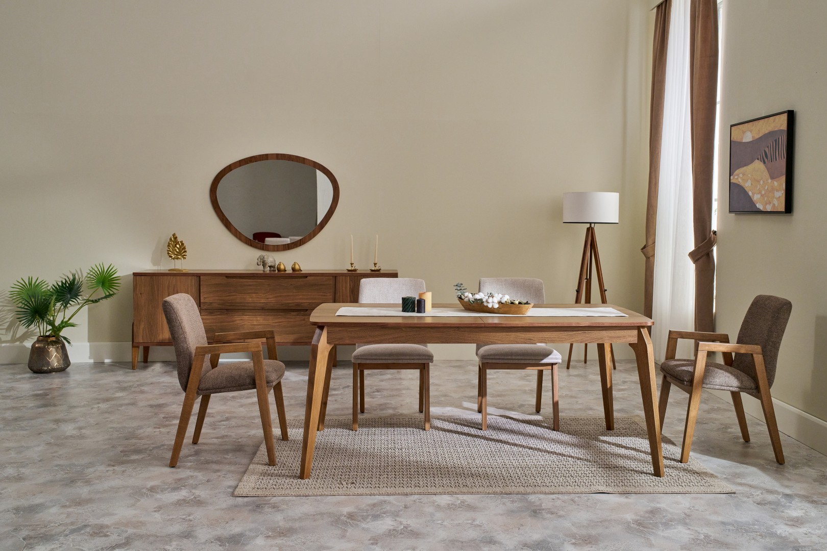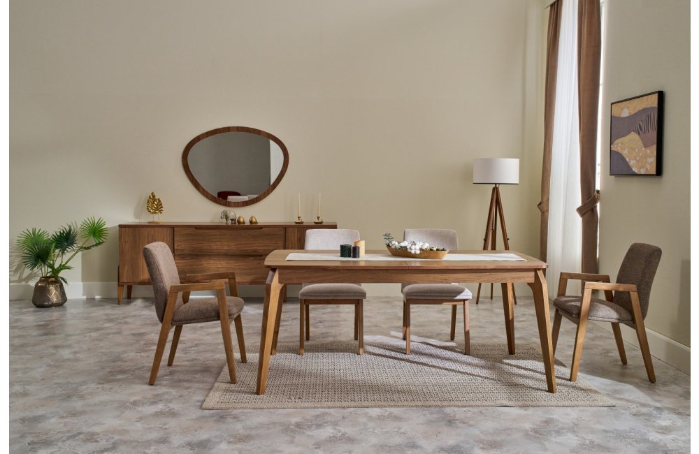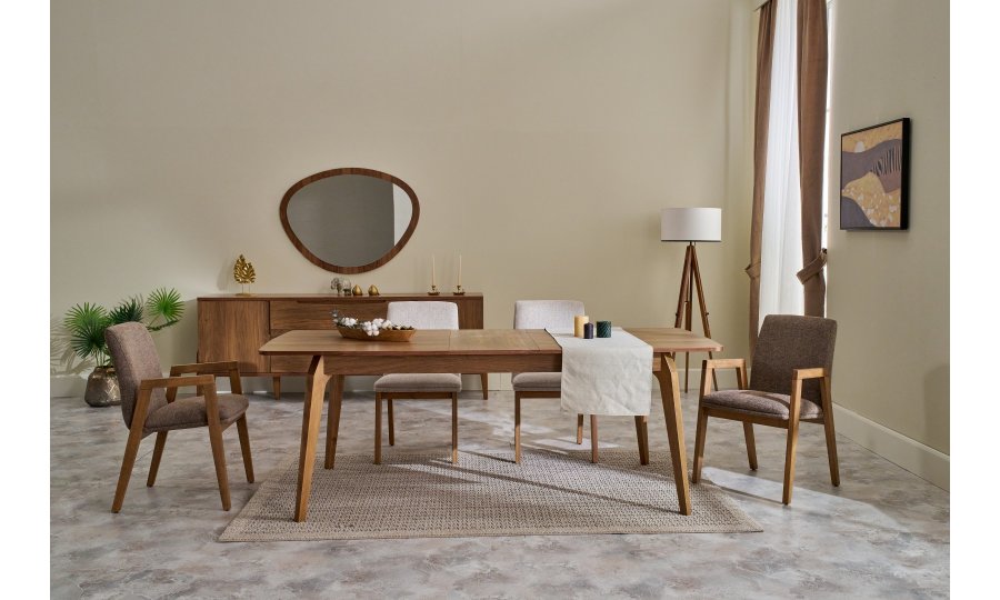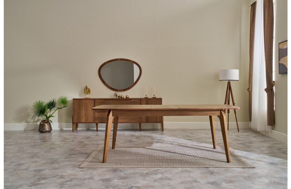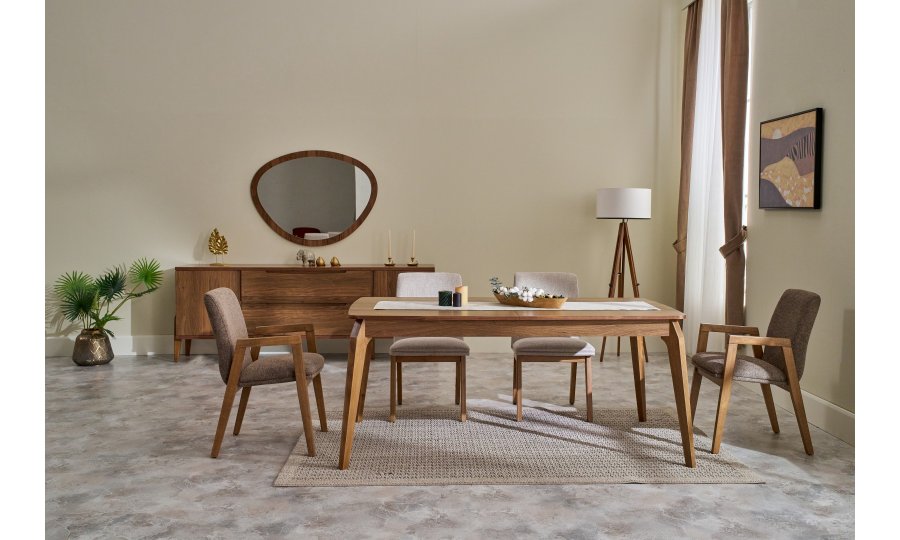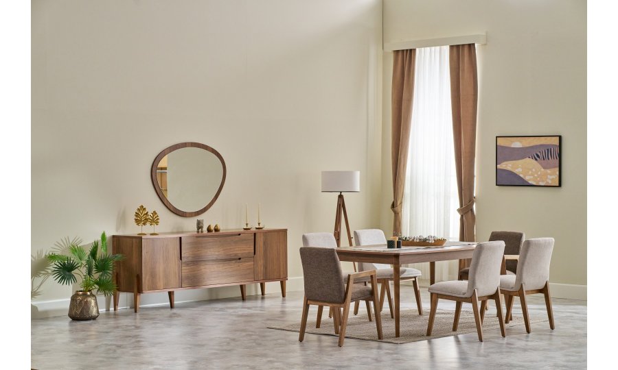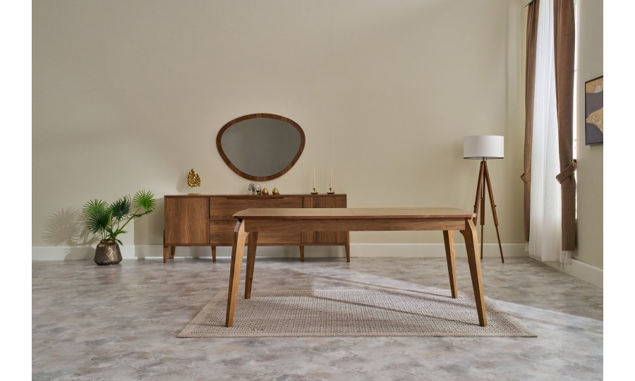 1 ad. konsol (aynalı), 1 ad. açılır masa, 6 ad. sandalyeden oluşmaktadır. Orta sehpa opsiyonel olarak satışa sunulmuştur.