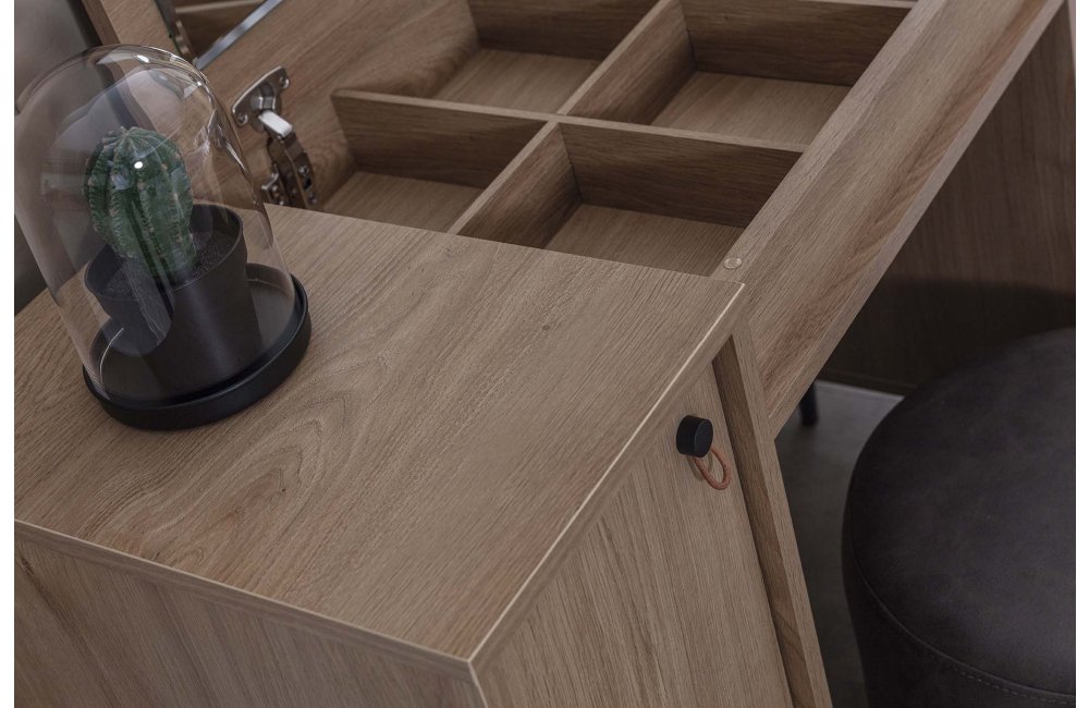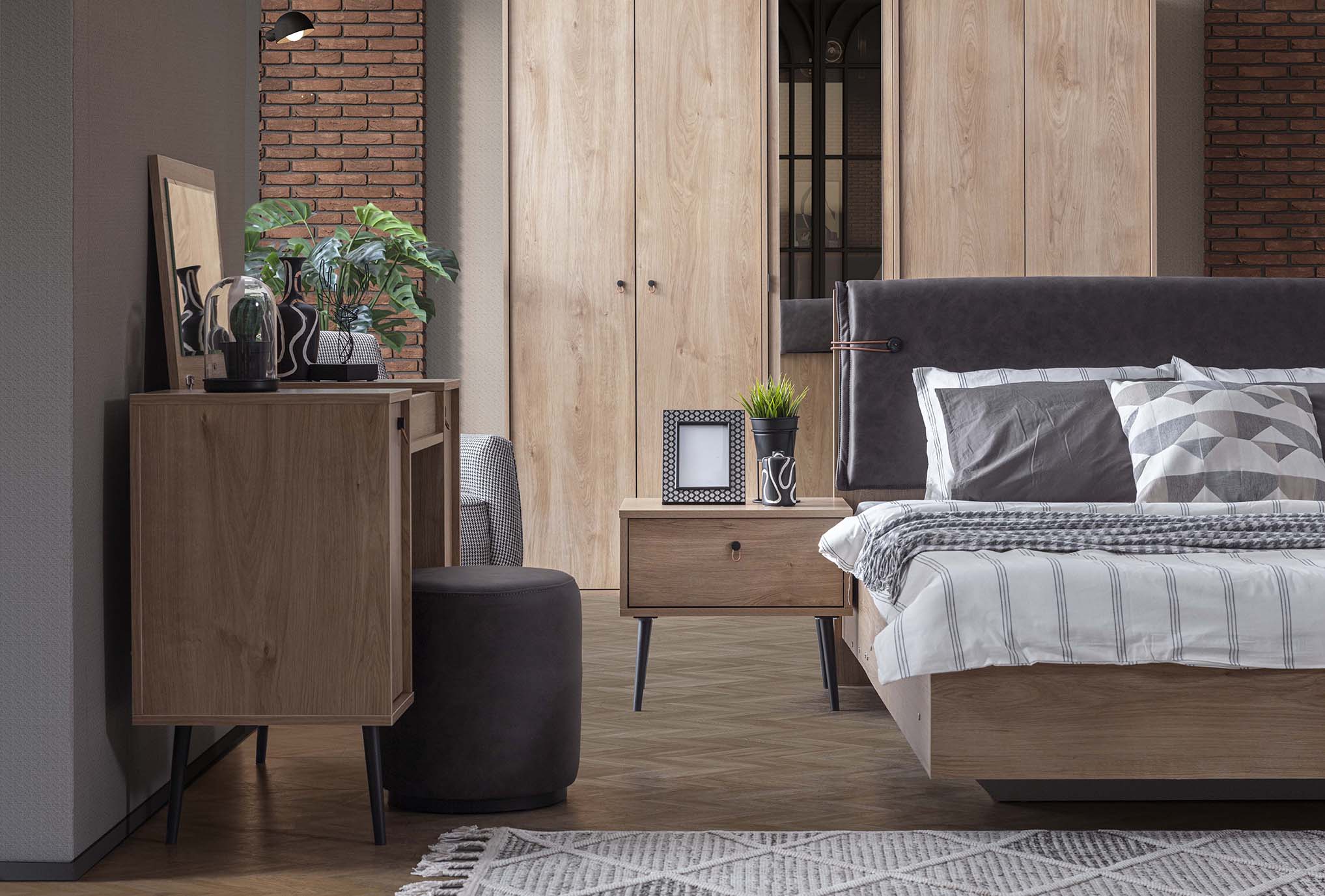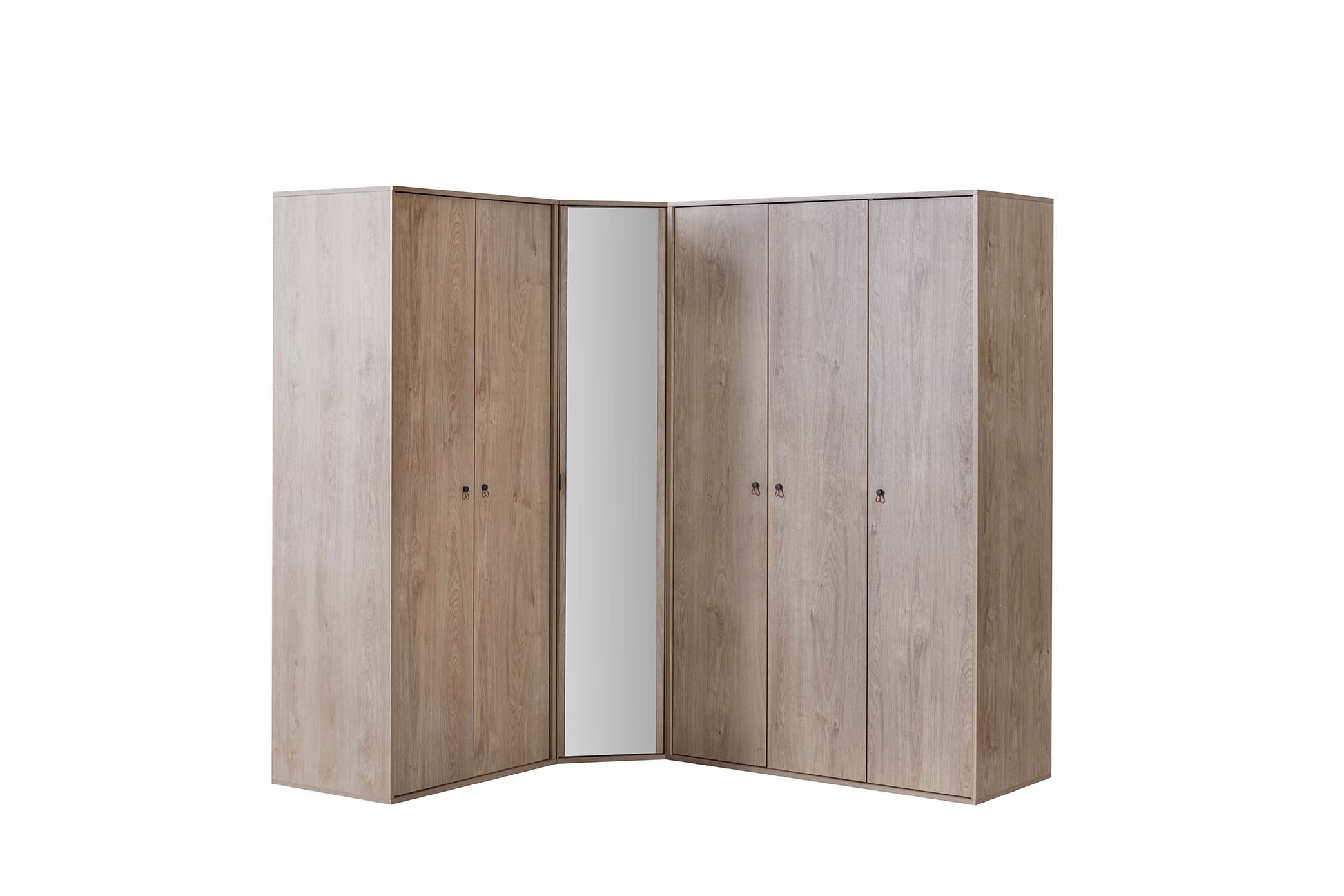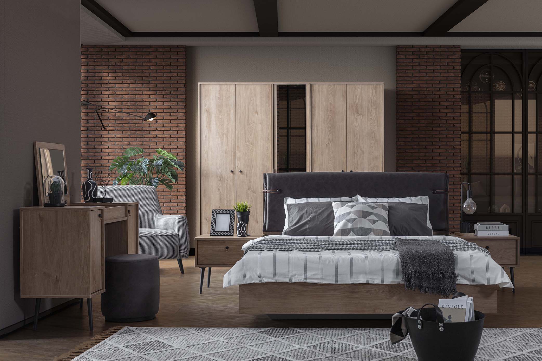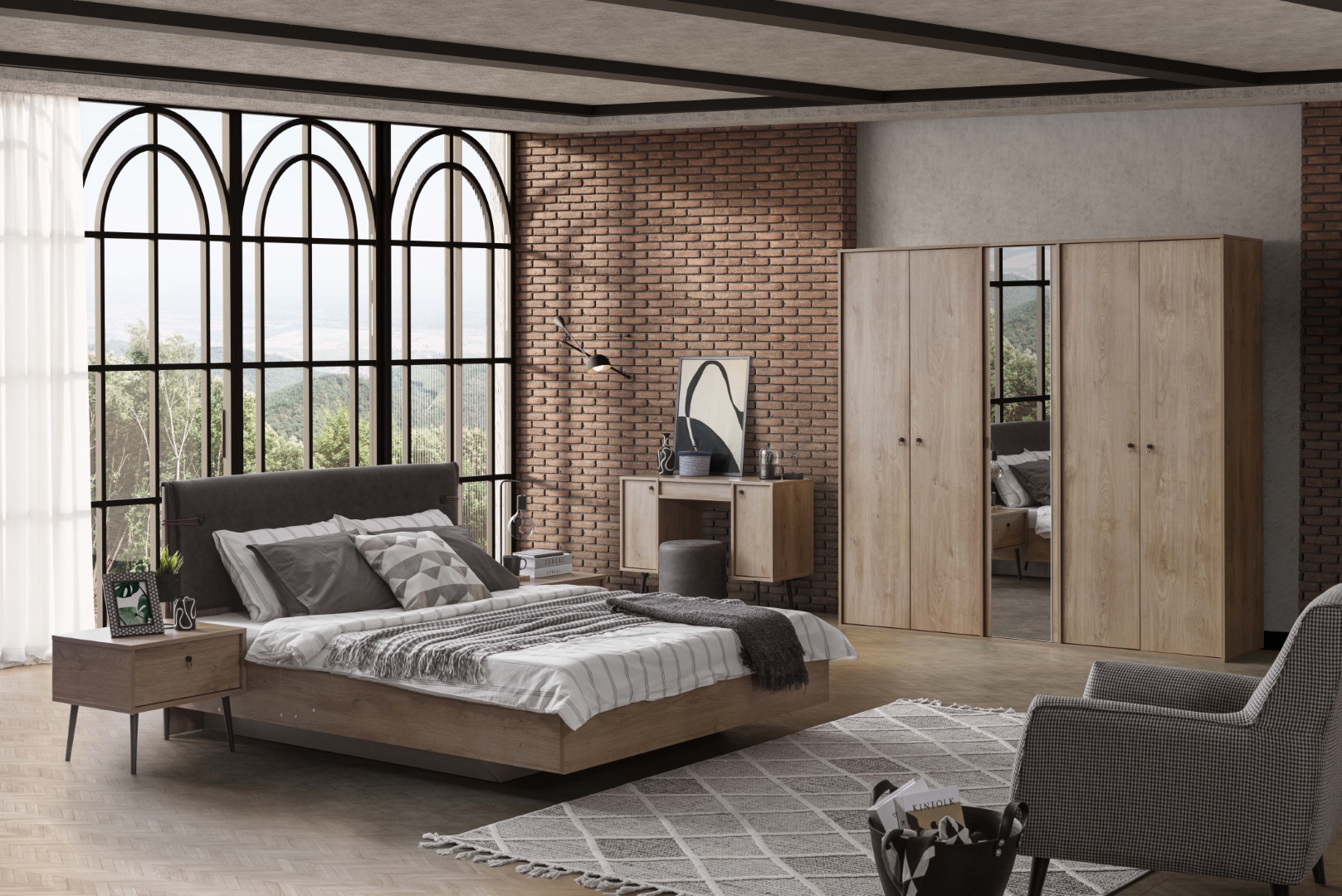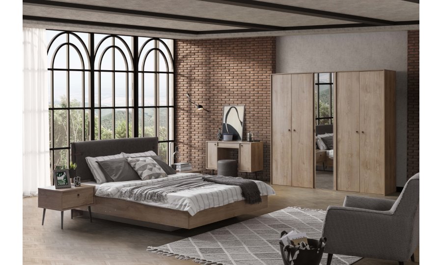 1 ad. 5 kapaklı dolap, 1 ad. bazasız karyola, 1 ad. aynalı şifonyer ve 2 ad. komodinden oluşmaktadır. Baza sistemi, şifonyer pufu, dolap içi çekmece modülü, 1-2-3 kapaklı ve köşe dolap opsiyonel satılmaktadır.