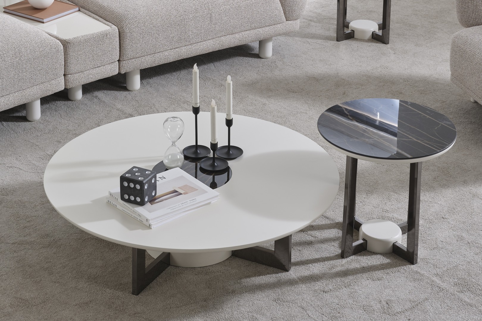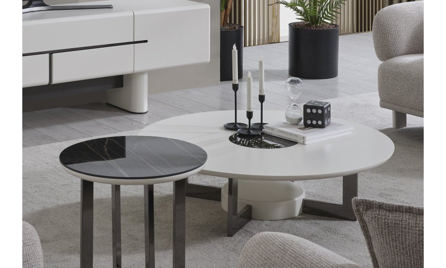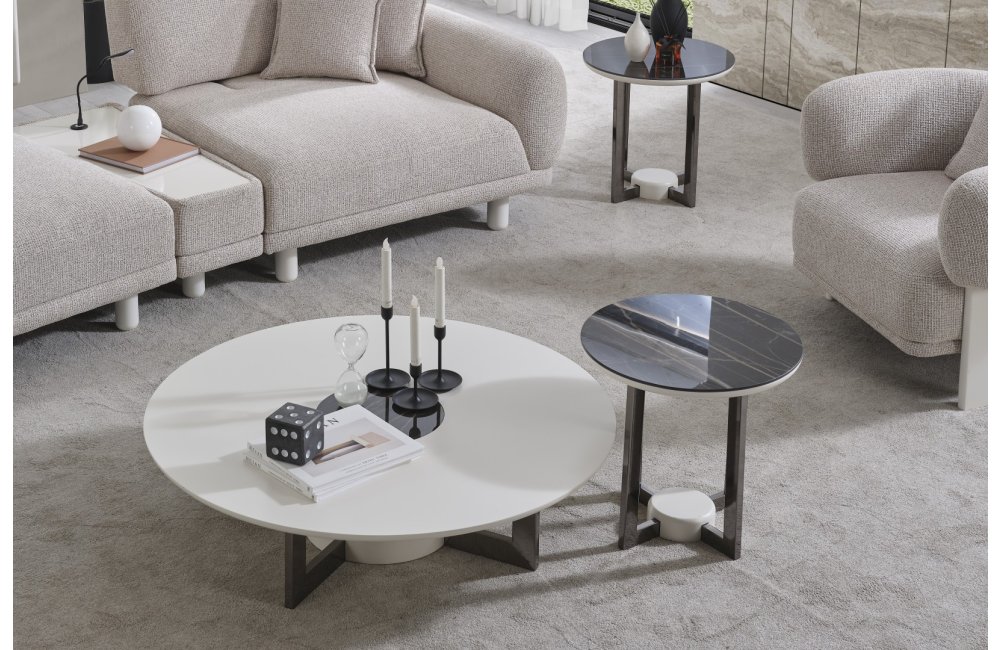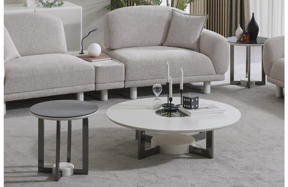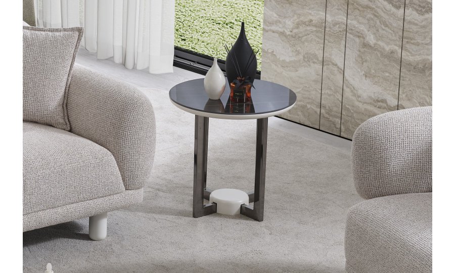 • Premium Dallas Yan Sehpa, orta sehpanın dairesel formunu daha kompakt ve dikey bir yapıyla tamamlar. Üst tablasında yer alan siyah mermer/cam dokusu, serinin krem tonlarıyla mükemmel bir kontrast oluştururken; C formuna yakın estetik ayak yapısı, sehpanın koltuklara yaklaştırılarak fonksiyonel kullanımını kolaylaştırır. Hem dekoratif bir kaide hem de pratik bir servis alanı olarak salonunuzun vazgeçilmez bir parçasıdır.