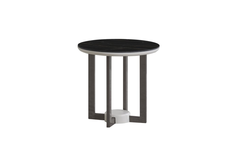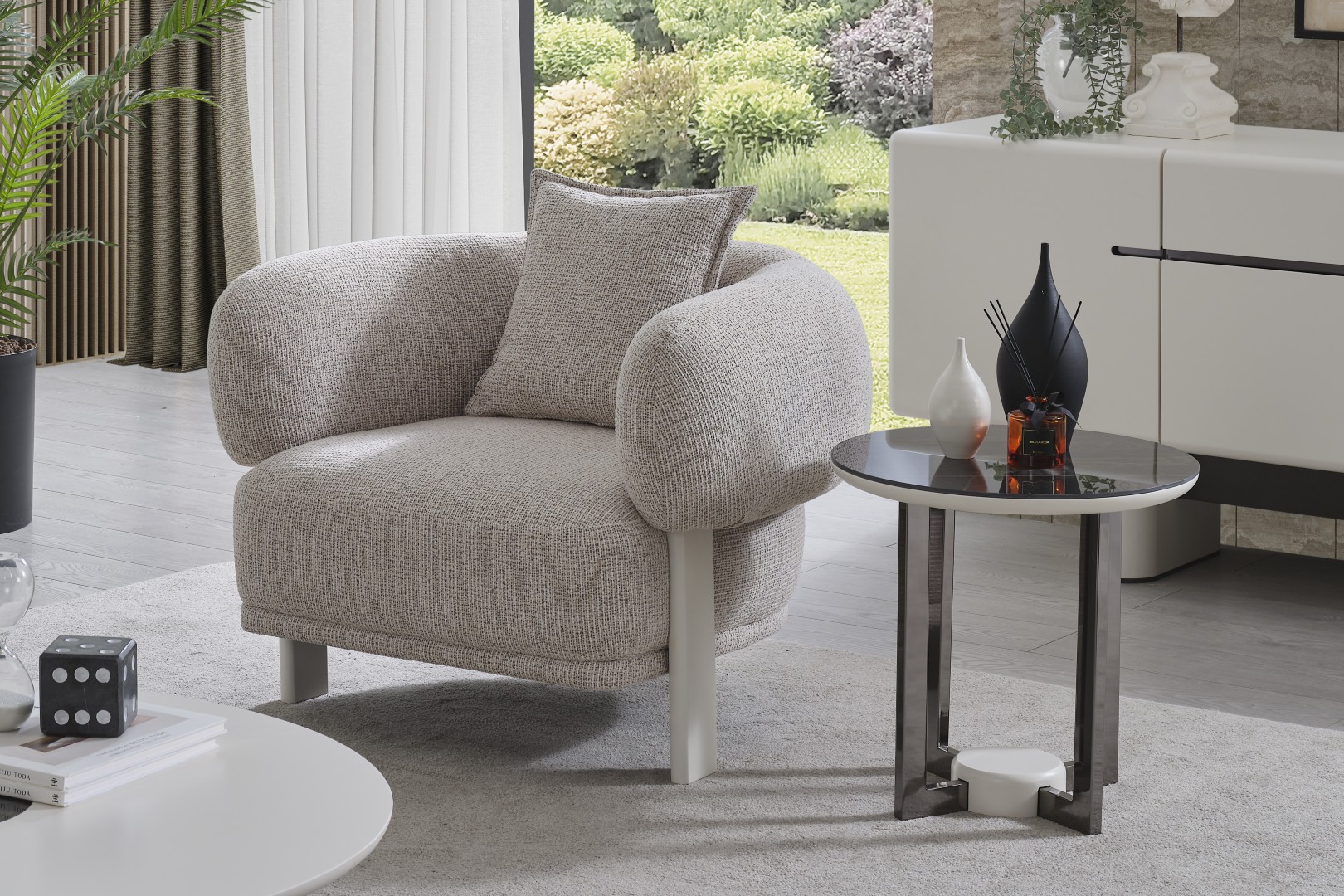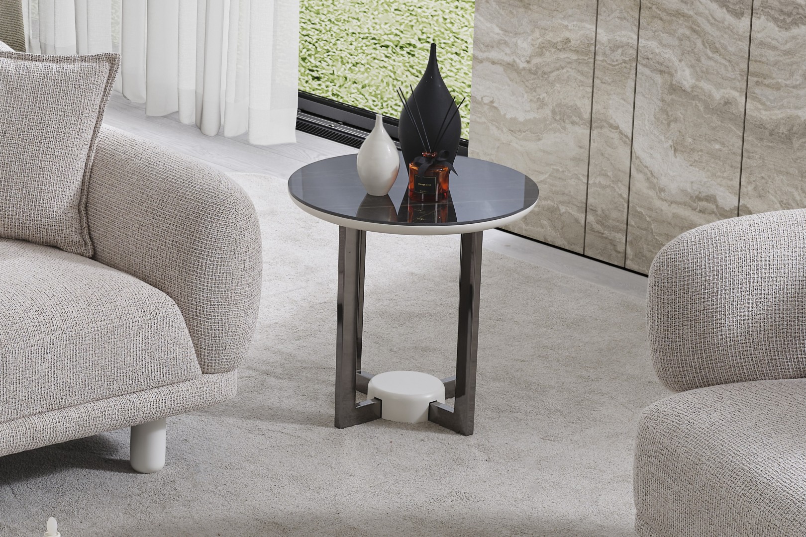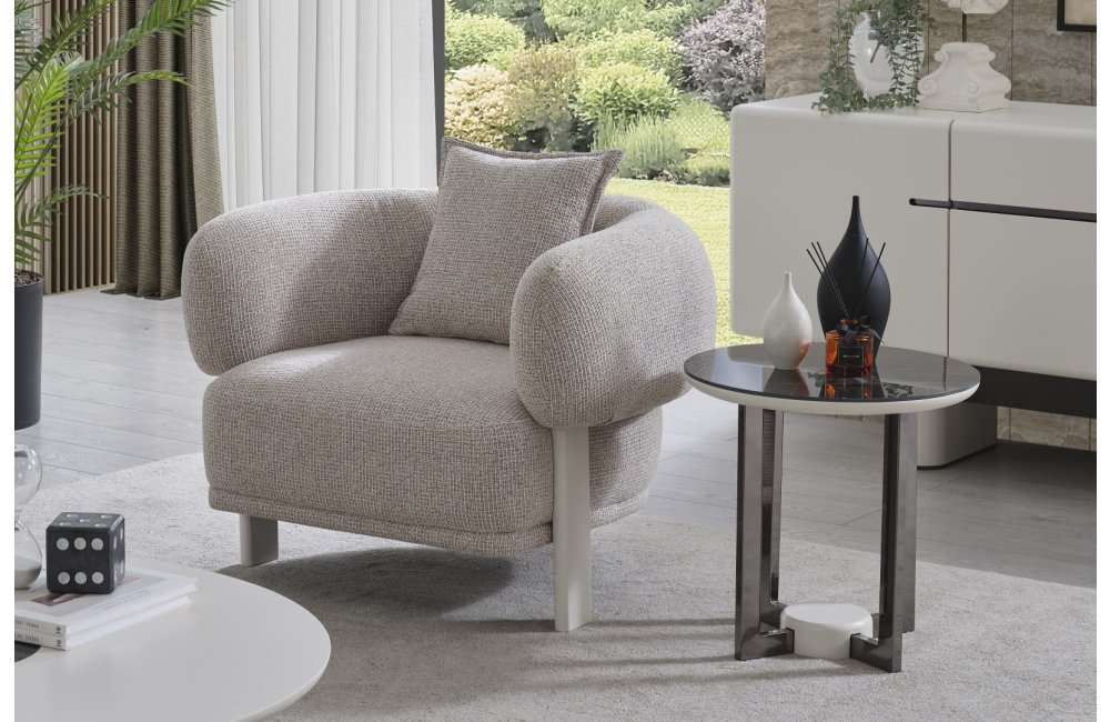 • Premium Dallas Yan Sehpa, orta sehpanın dairesel formunu daha kompakt ve dikey bir yapıyla tamamlar. Üst tablasında yer alan siyah mermer/cam dokusu, serinin krem tonlarıyla mükemmel bir kontrast oluştururken; C formuna yakın estetik ayak yapısı, sehpanın koltuklara yaklaştırılarak fonksiyonel kullanımını kolaylaştırır. Hem dekoratif bir kaide hem de pratik bir servis alanı olarak salonunuzun vazgeçilmez bir parçasıdır.