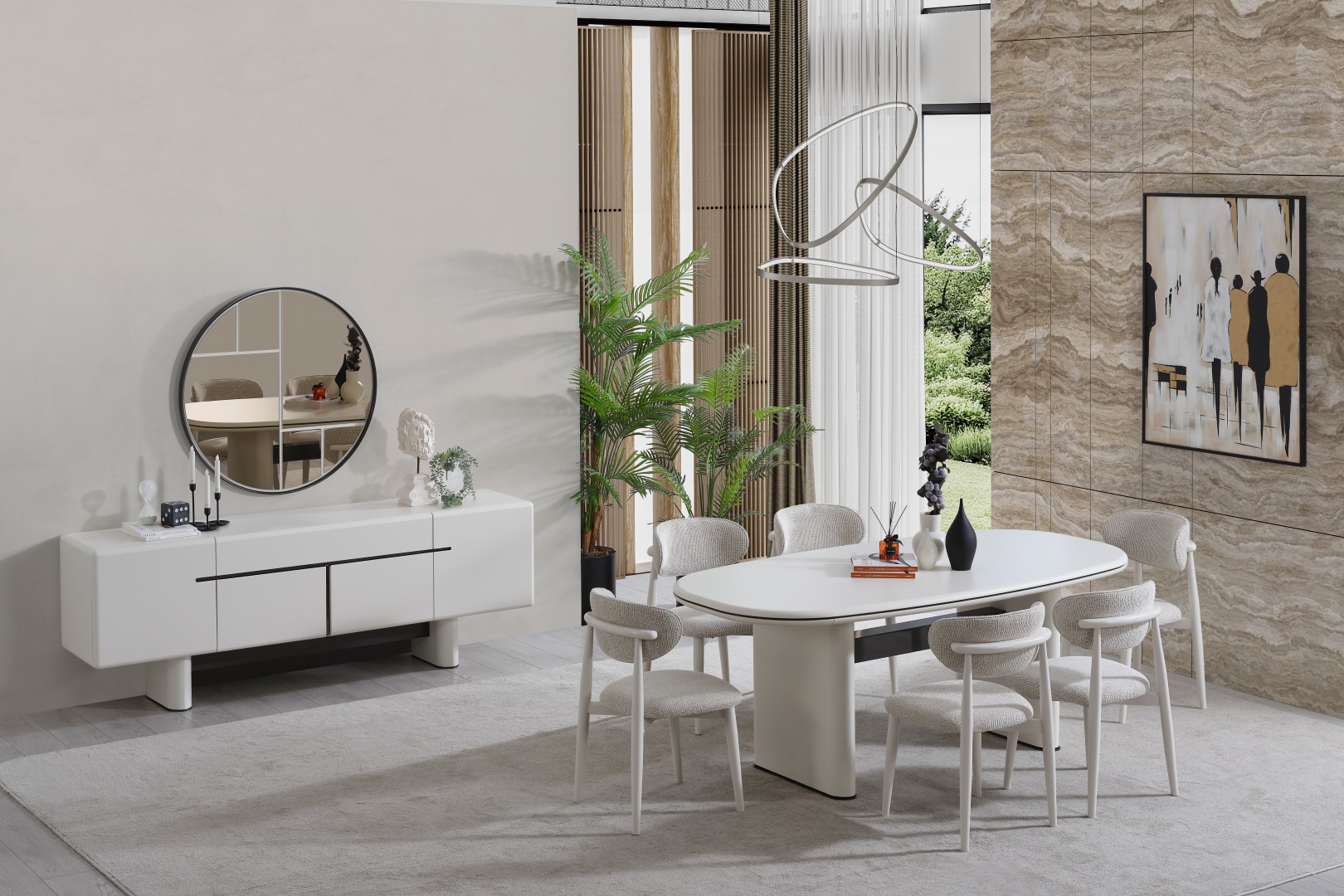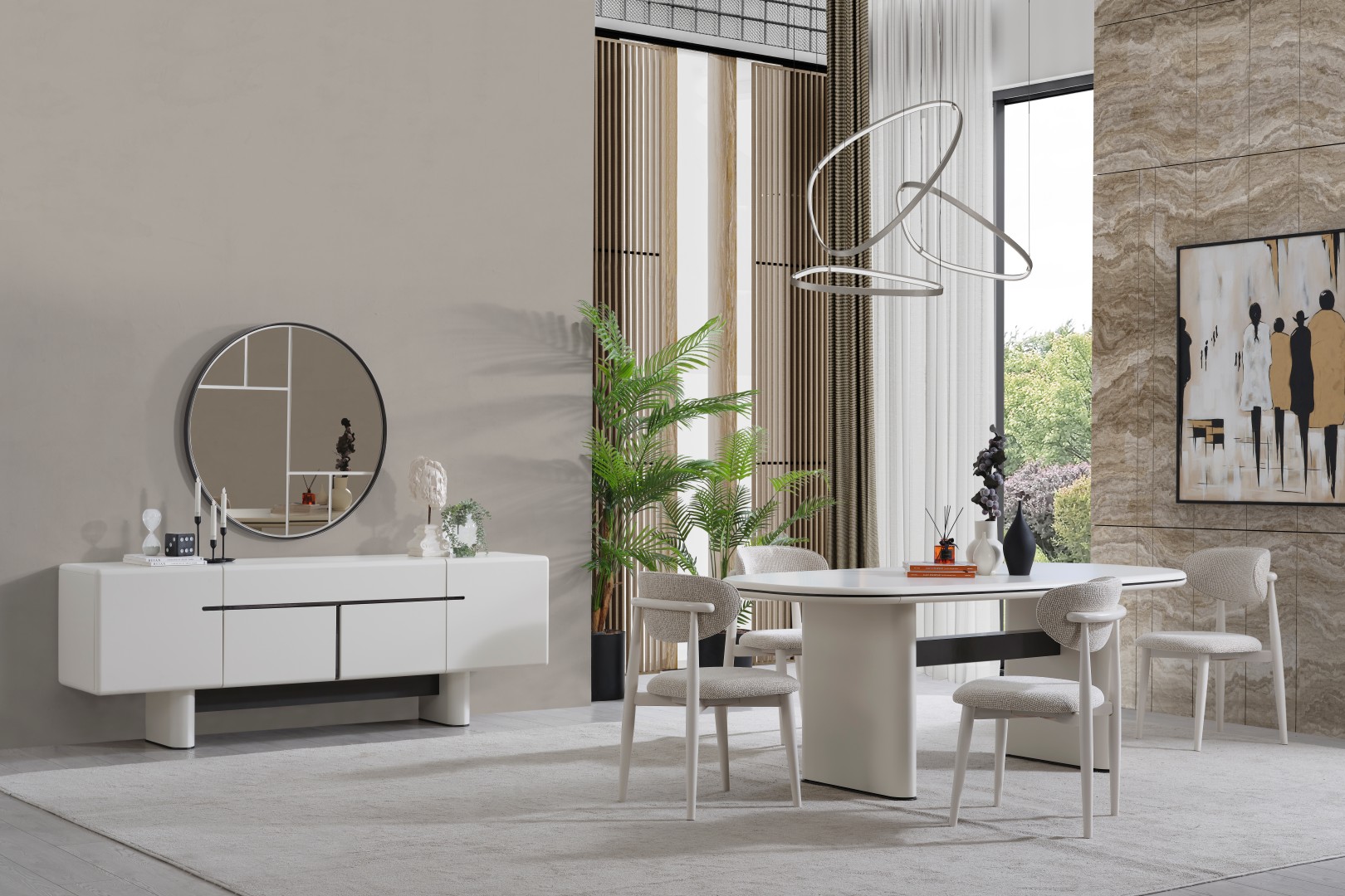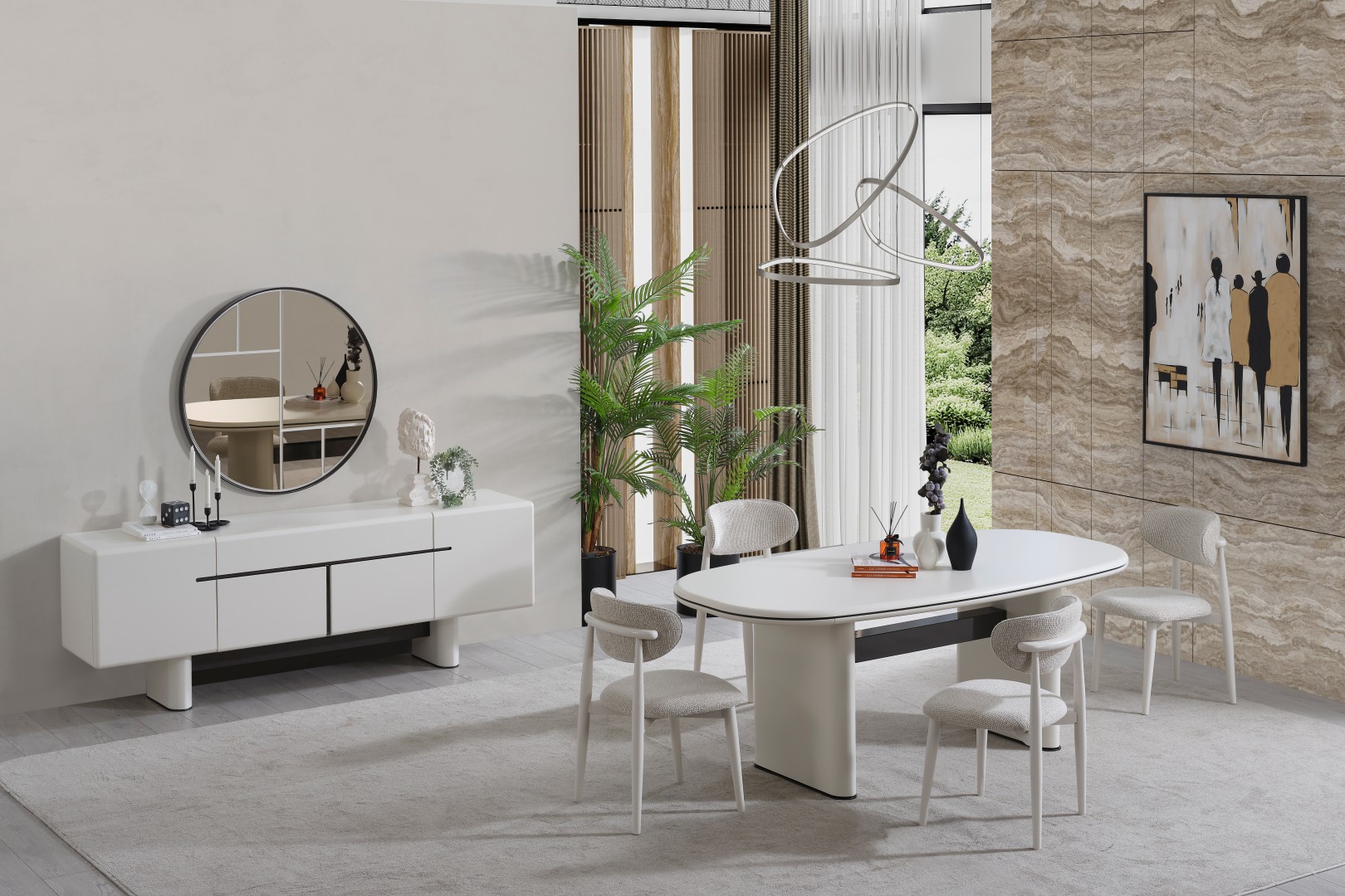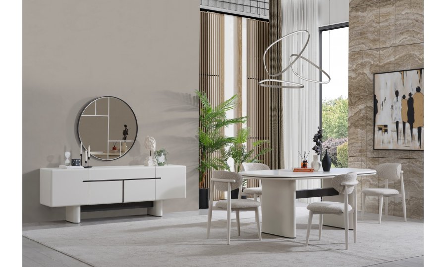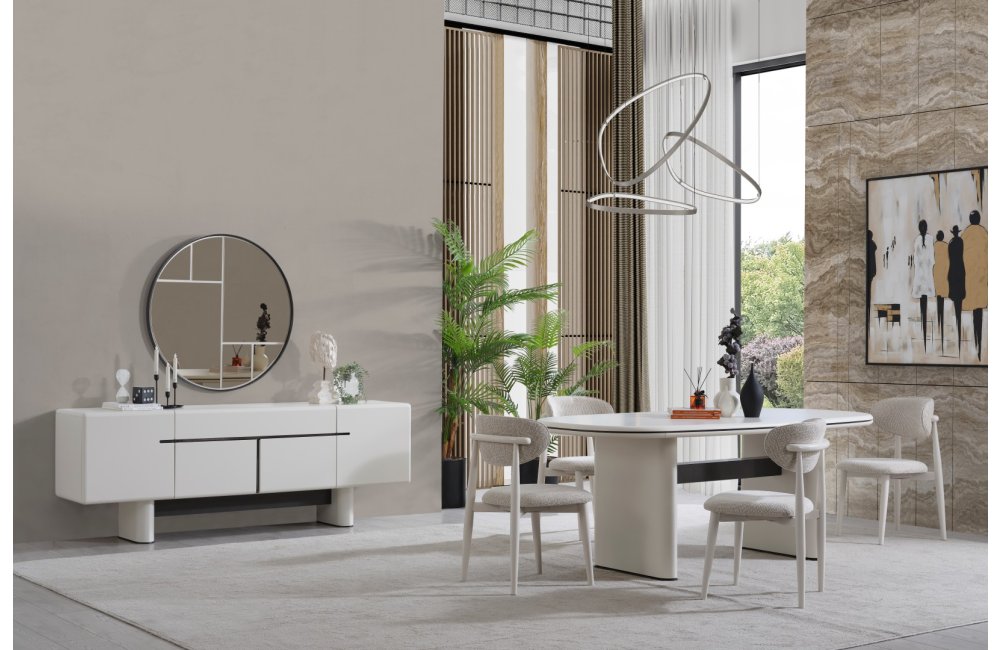 • Premium Dallas Yemek Odası, görsel bir bütünlük sunar. Yatay formdaki konsolu ve heykelsi masa ayaklarıyla hem depolama çözümü sunar hem de yemek alanınıza lüks bir dokunuş katar.