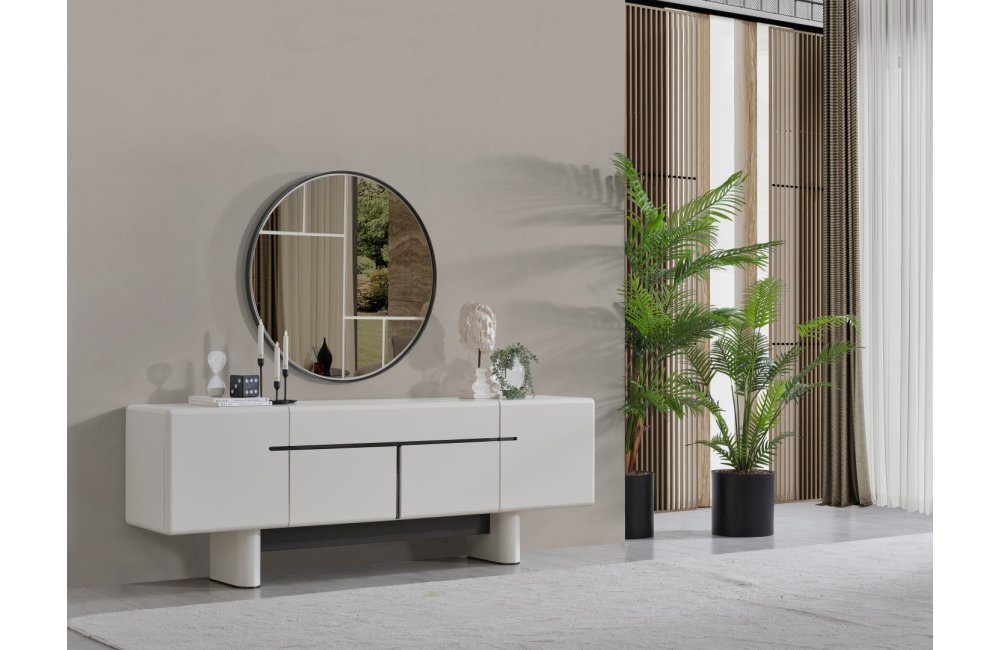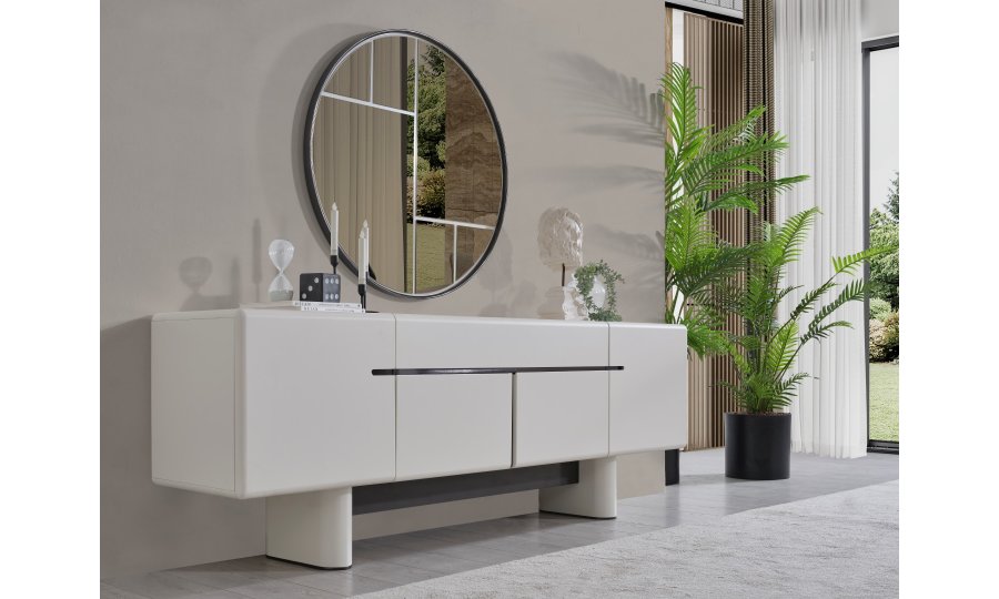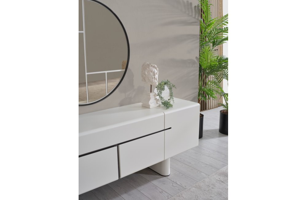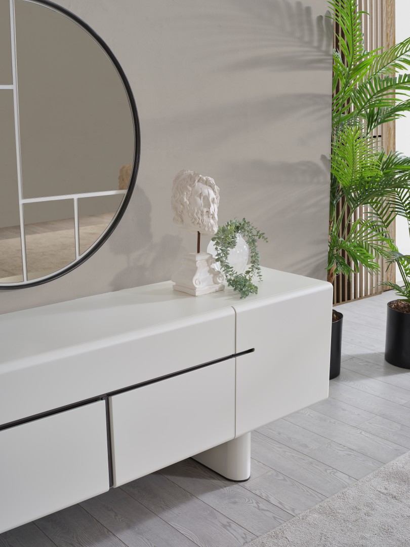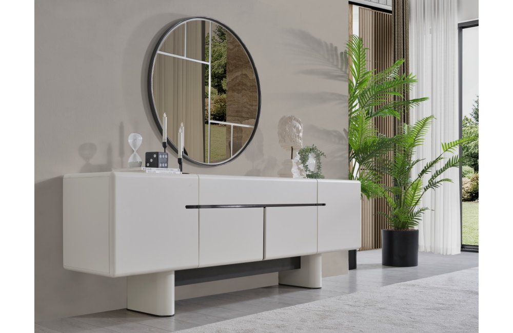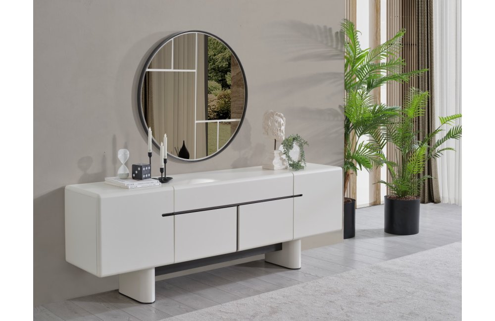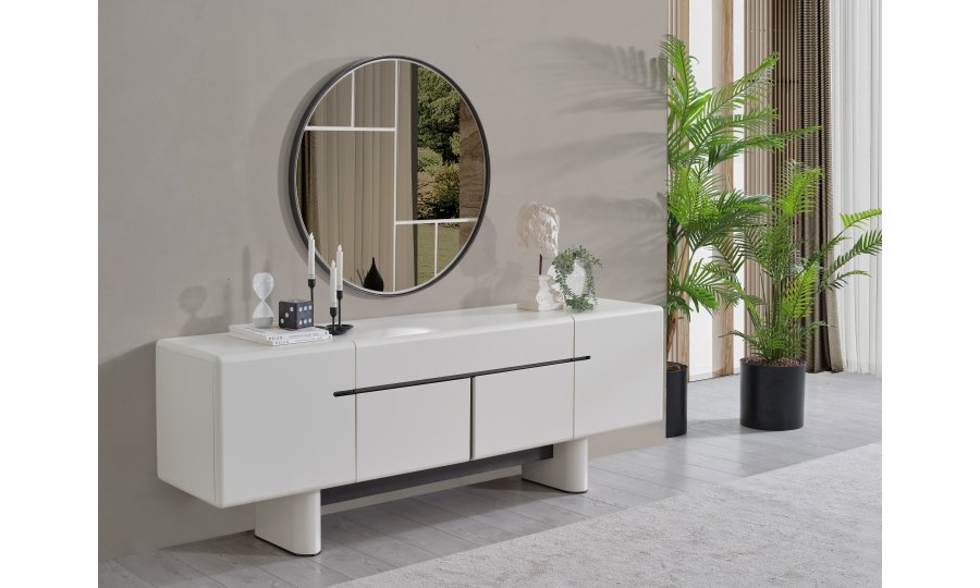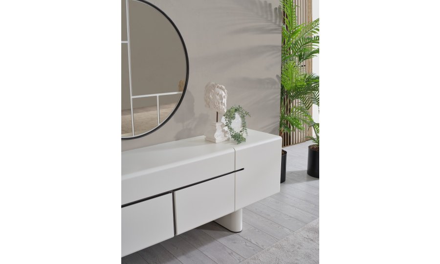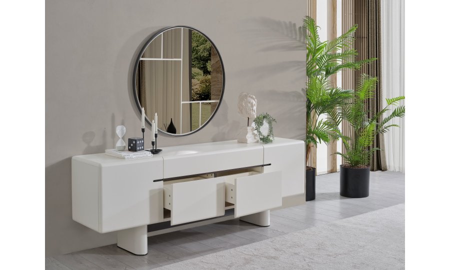 • Dallas Konsol, serinin genelindeki kıvrımlı tasarım dilini devam ettirerek keskin köşelerden arındırılmış yumuşak bir forma sahiptir. Orta kısmındaki yatay siyah çizgi detayıyla modern bir kontrast yakalayan bu parça, geniş iç bölmeleri sayesinde yemek takımlarınız için şık bir saklama alanı sunar. Yerden yüksek blok ayak tasarımı ise temizlik kolaylığı sağlarken ürüne heykelsi bir görünüm kazandırır.
