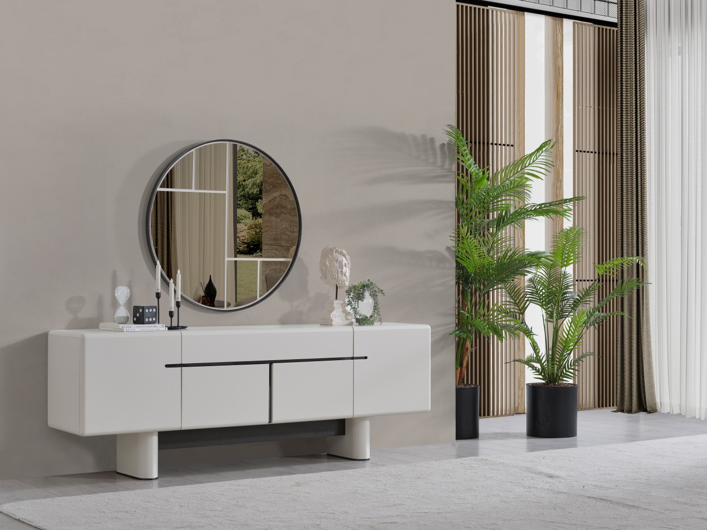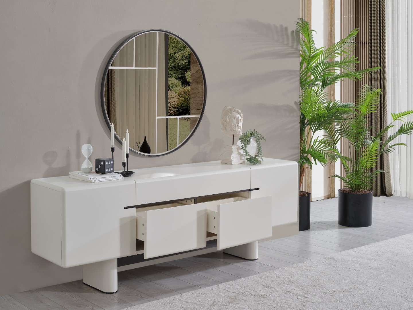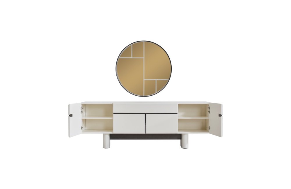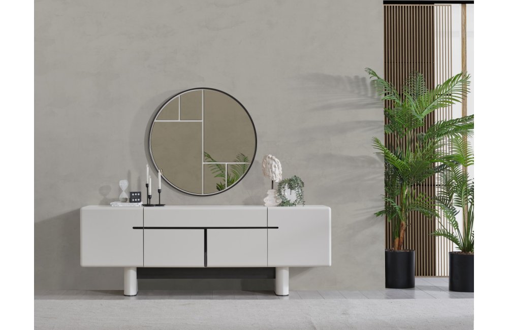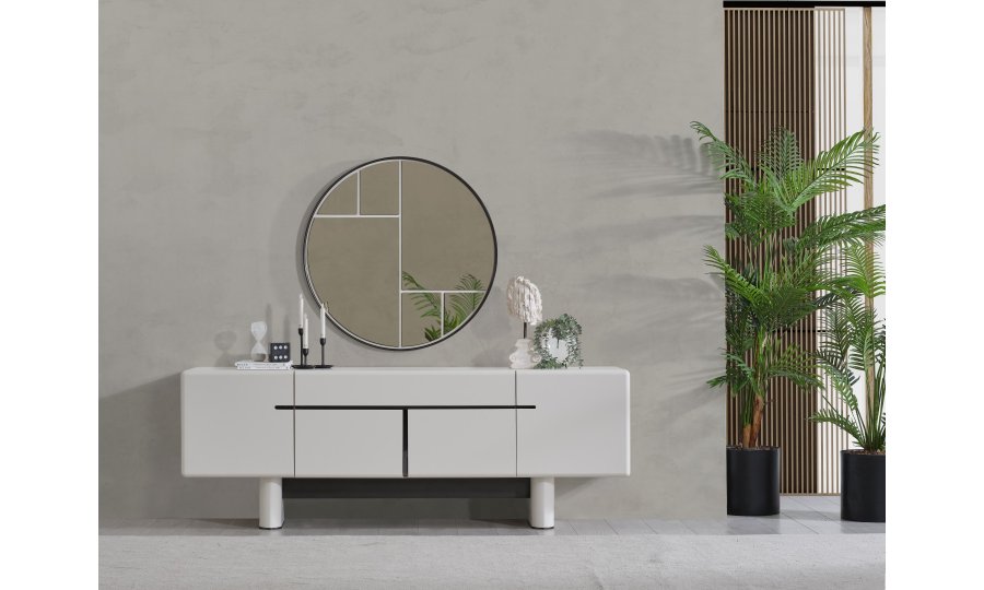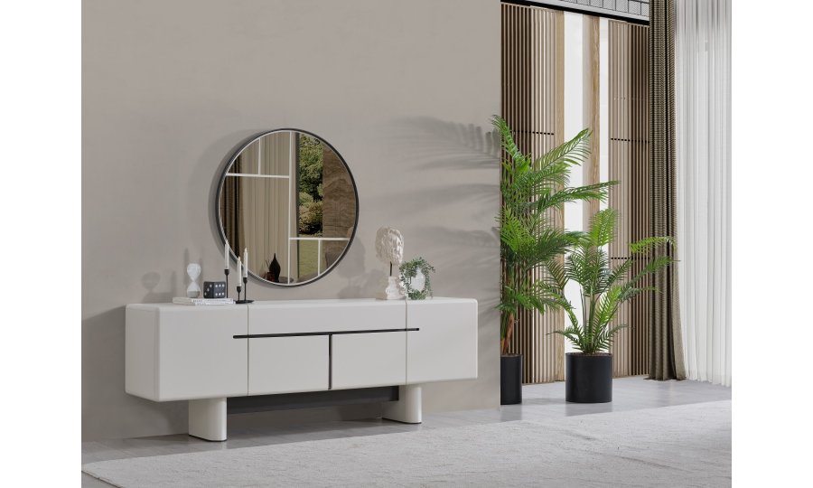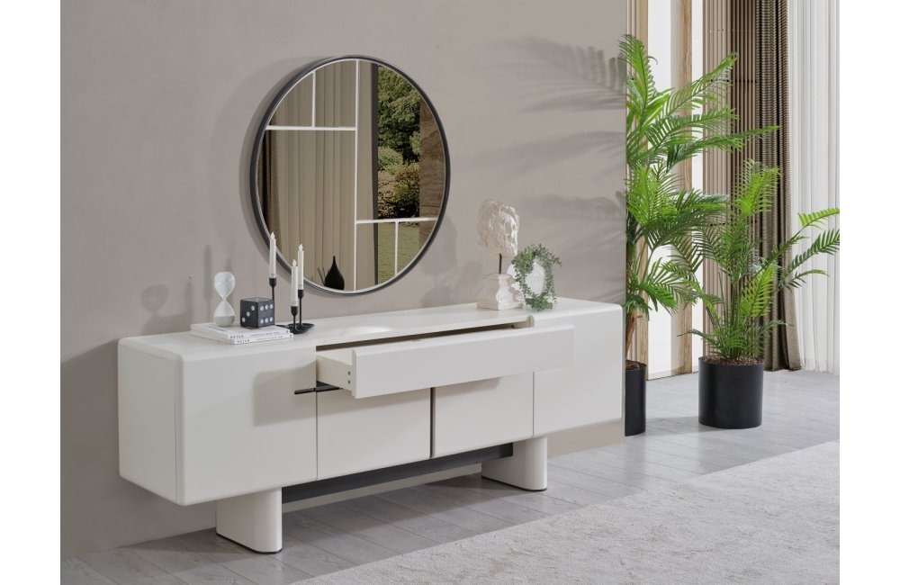 • Dallas Konsol, serinin genelindeki kıvrımlı tasarım dilini devam ettirerek keskin köşelerden arındırılmış yumuşak bir forma sahiptir. Orta kısmındaki yatay siyah çizgi detayıyla modern bir kontrast yakalayan bu parça, geniş iç bölmeleri sayesinde yemek takımlarınız için şık bir saklama alanı sunar. Yerden yüksek blok ayak tasarımı ise temizlik kolaylığı sağlarken ürüne heykelsi bir görünüm kazandırır.