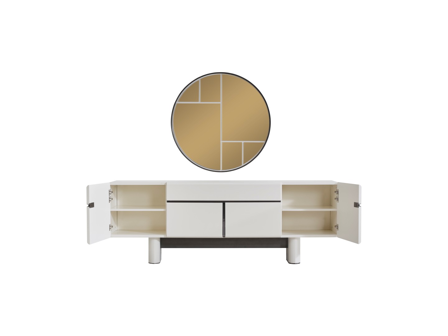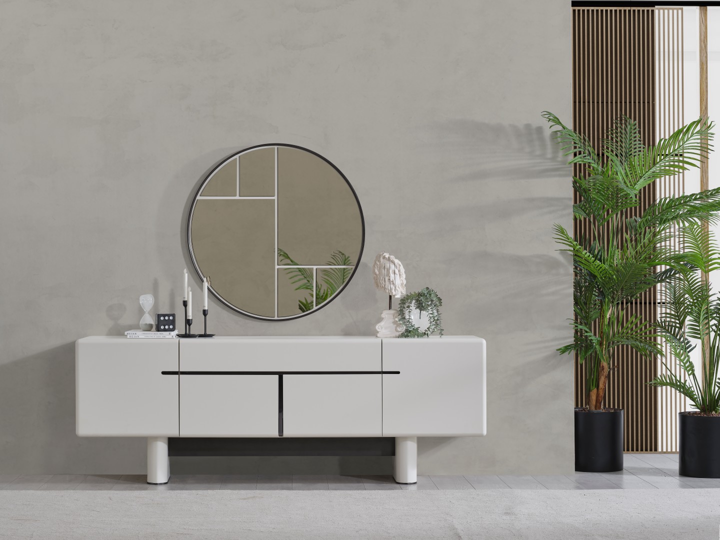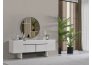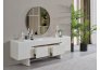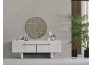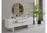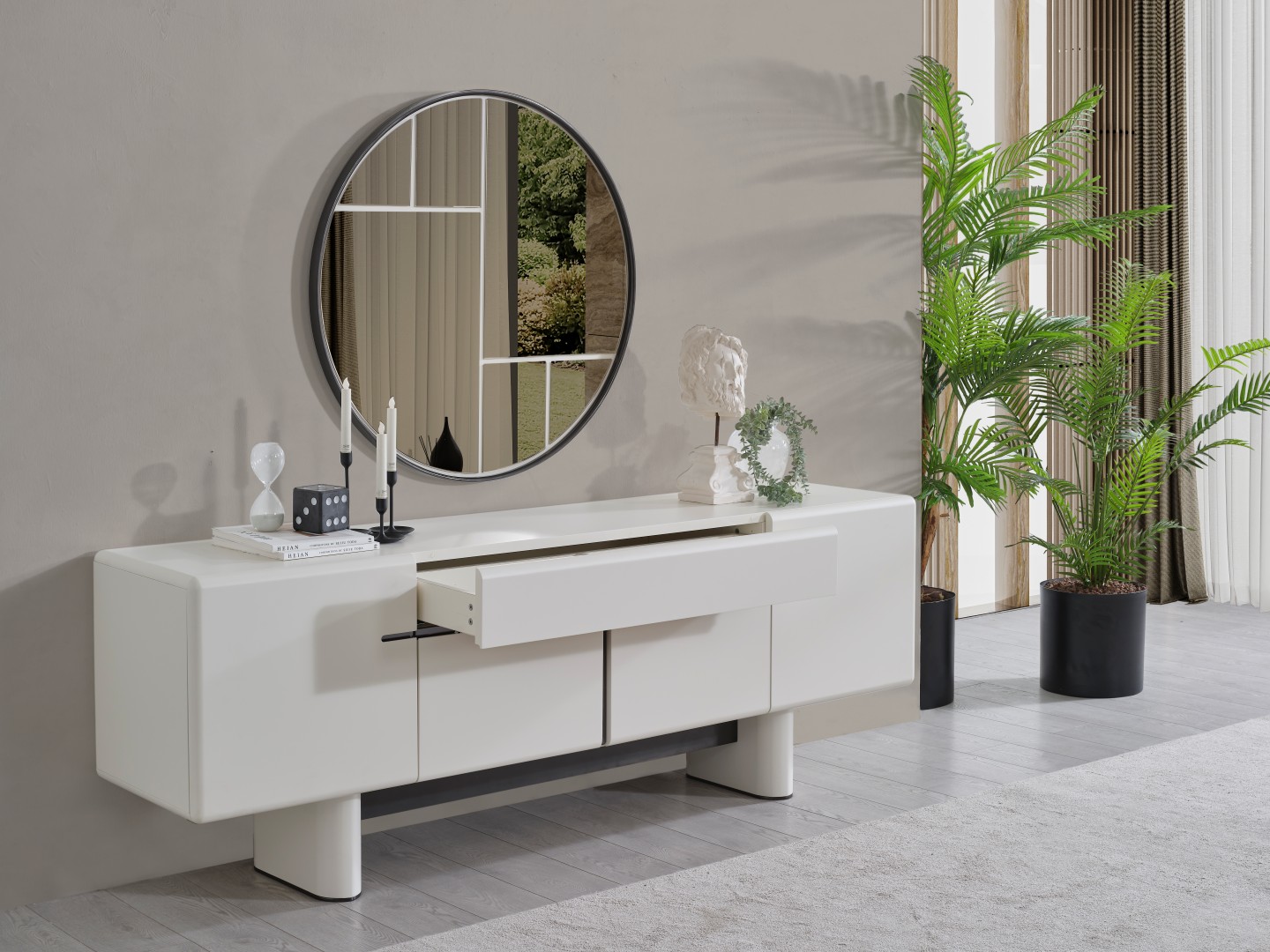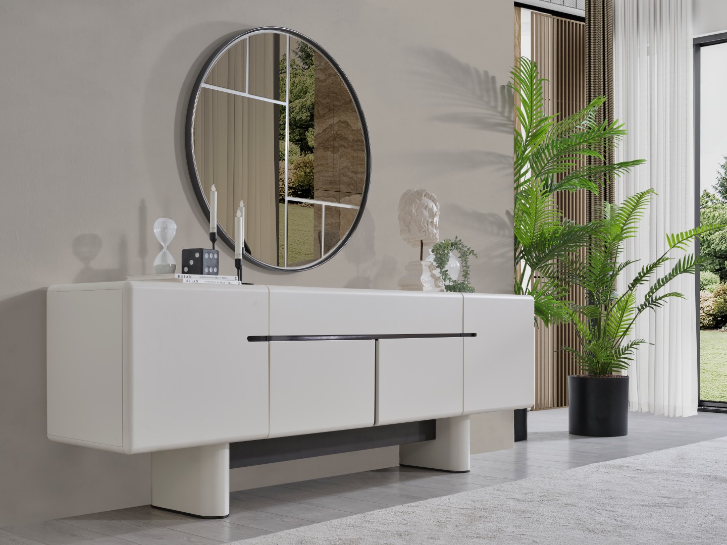 • Dallas Konsol, serinin genelindeki kıvrımlı tasarım dilini devam ettirerek keskin köşelerden arındırılmış yumuşak bir forma sahiptir. Orta kısmındaki yatay siyah çizgi detayıyla modern bir kontrast yakalayan bu parça, geniş iç bölmeleri sayesinde yemek takımlarınız için şık bir saklama alanı sunar. Yerden yüksek blok ayak tasarımı ise temizlik kolaylığı sağlarken ürüne heykelsi bir görünüm kazandırır.