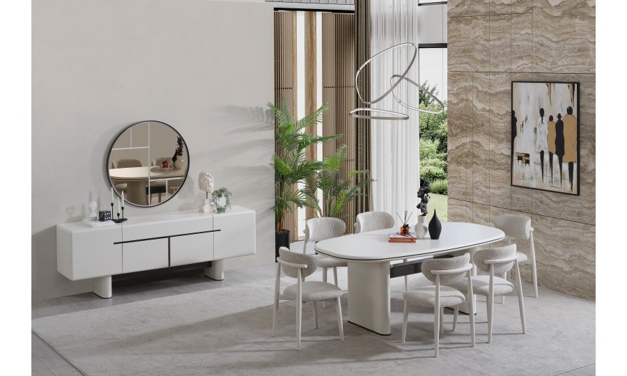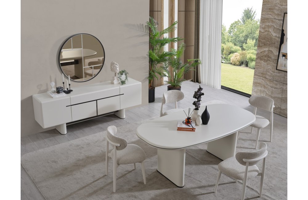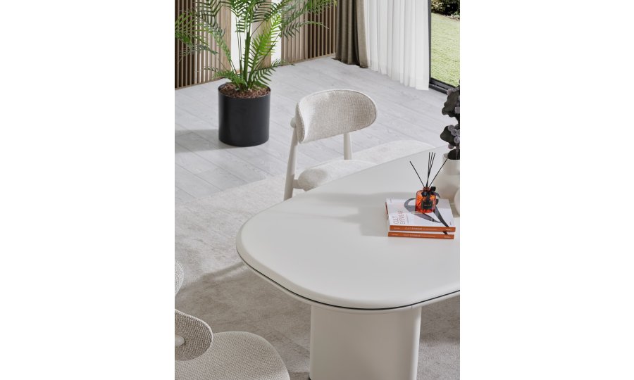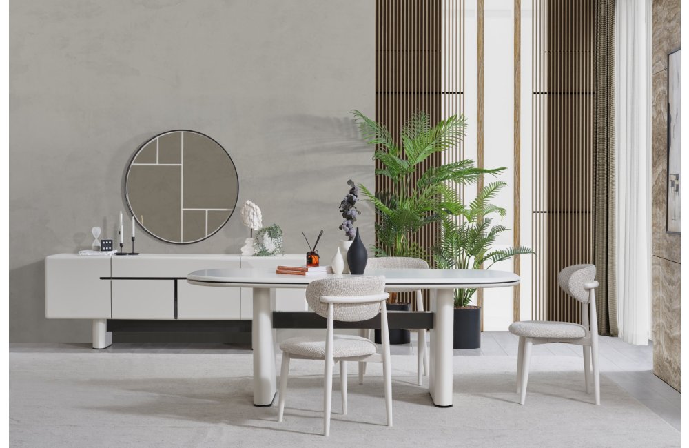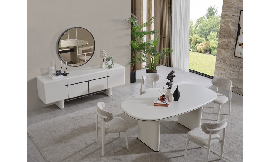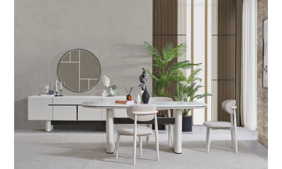 • Keskin köşelerin yerini yumuşak geçişlere bıraktığı Dallas Yemek Masası, geniş oval yüzeyiyle daha samimi bir yemek ortamı sağlar. Mat krem yüzeyi, kolay temizlenebilir yapısı ve sağlam sütun ayaklarıyla uzun ömürlü kullanım sunar.