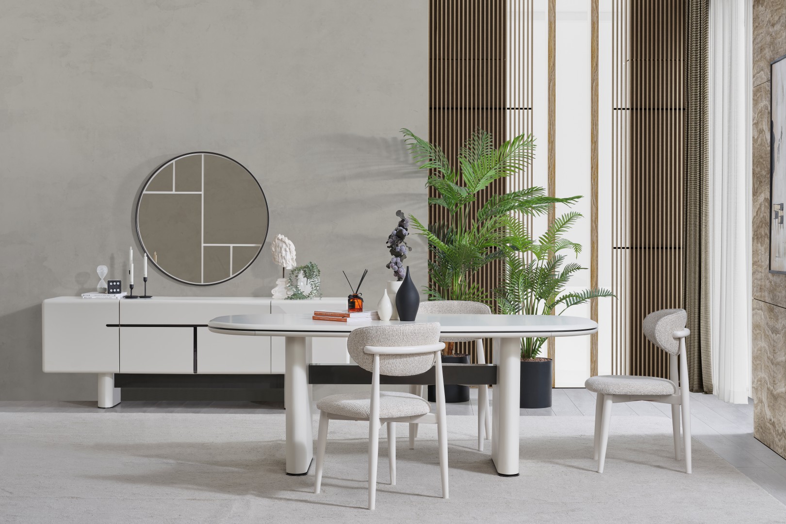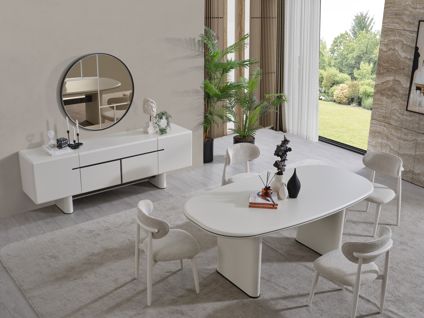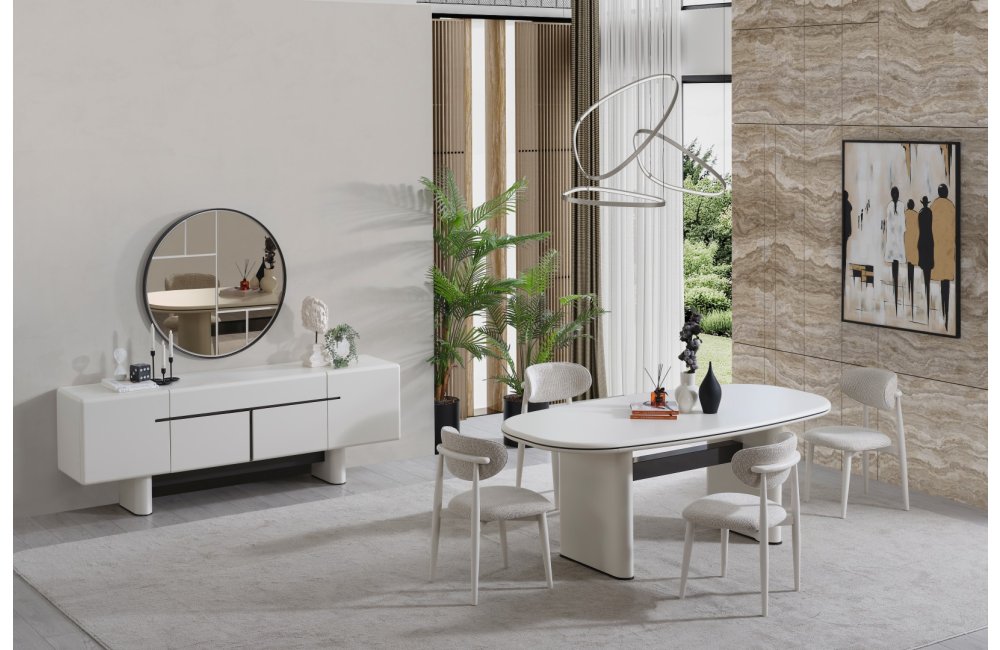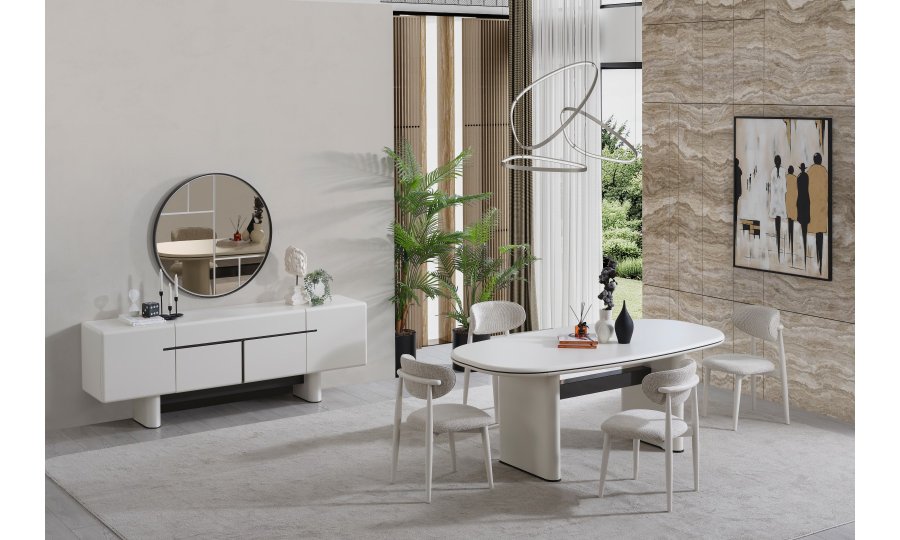 • Keskin köşelerin yerini yumuşak geçişlere bıraktığı Dallas Yemek Masası, geniş oval yüzeyiyle daha samimi bir yemek ortamı sağlar. Mat krem yüzeyi, kolay temizlenebilir yapısı ve sağlam sütun ayaklarıyla uzun ömürlü kullanım sunar.