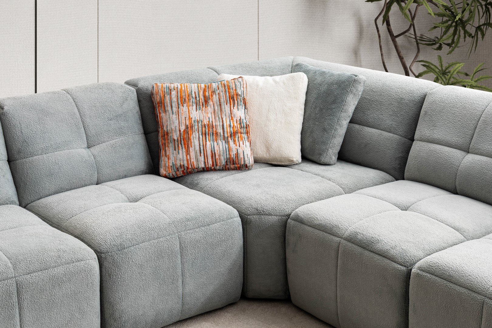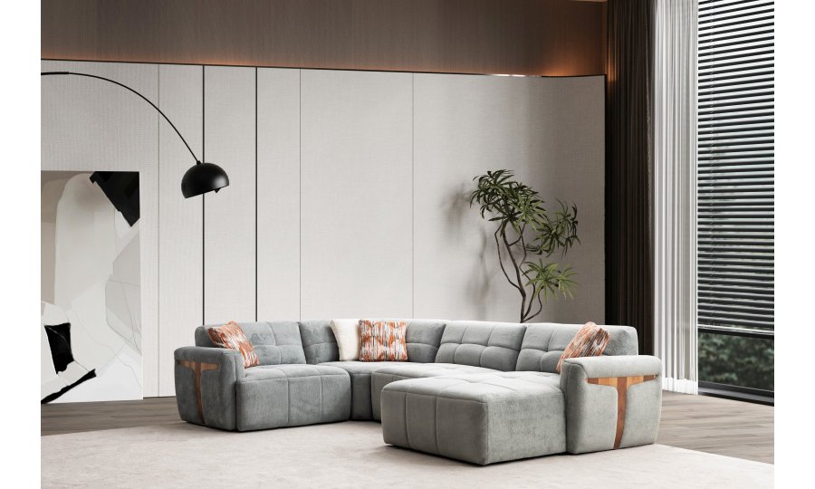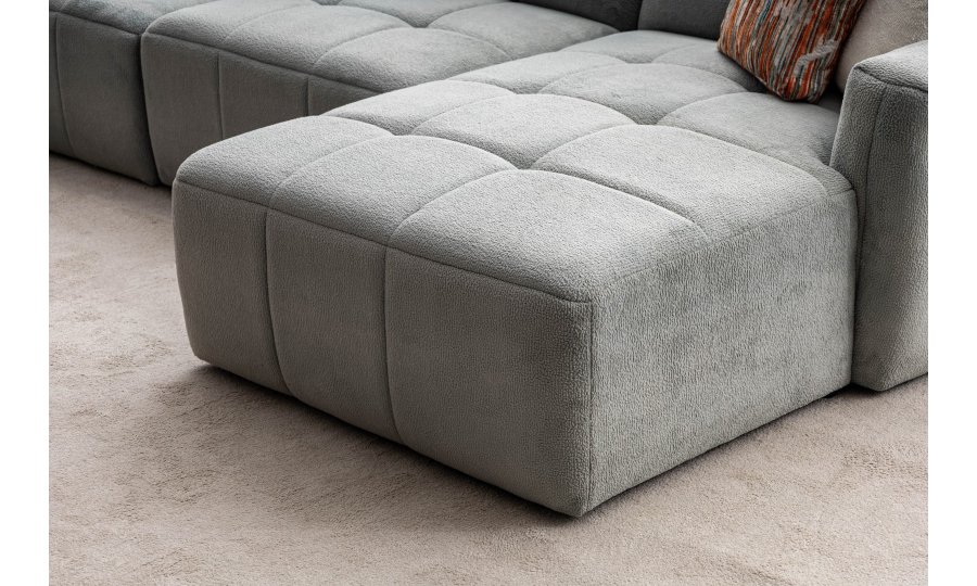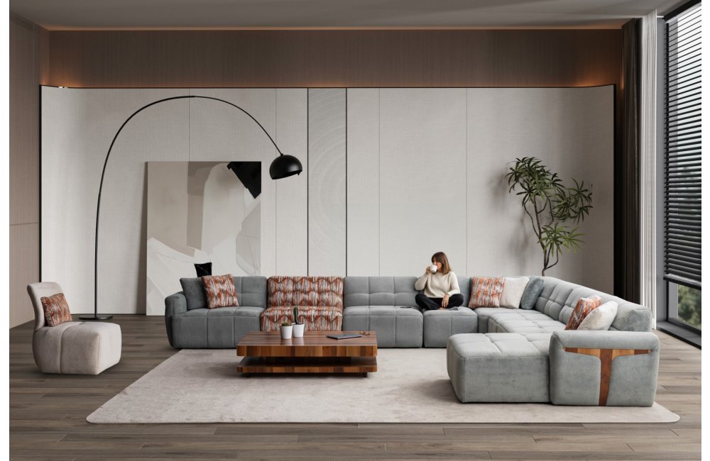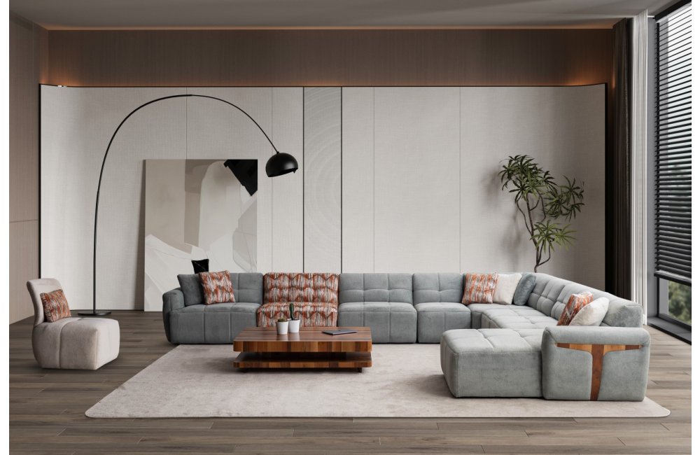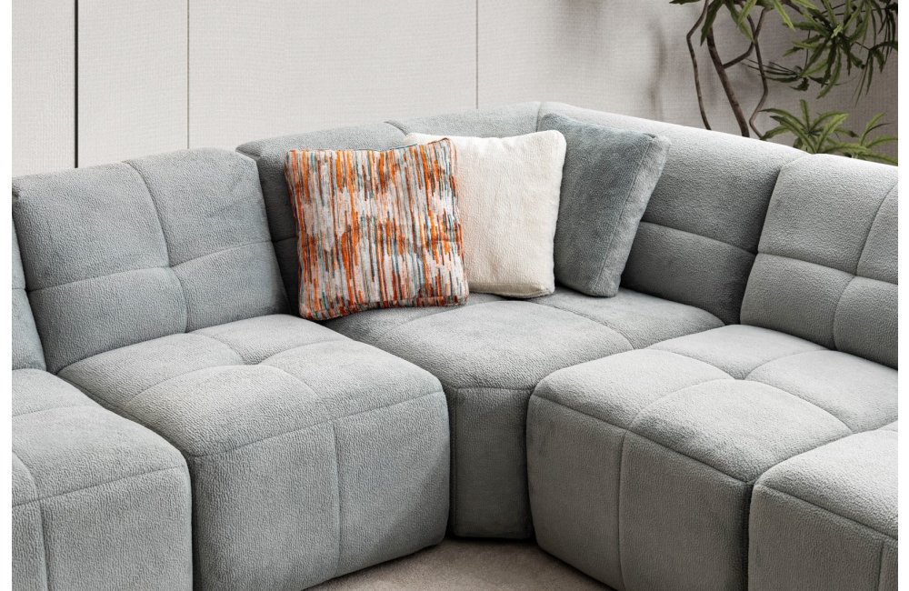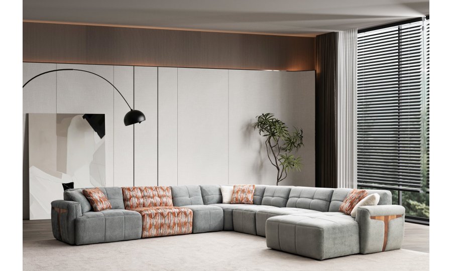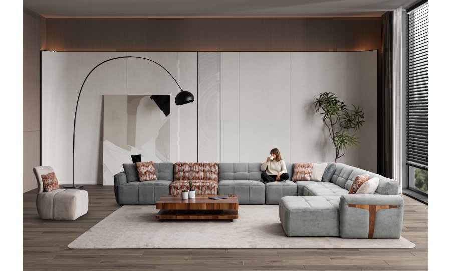 1ad. 90cm kollu modül, 2ad 90cm kolsuz piyon, 1ad. 60cm kolsuz piyon, 1ad. köşe, 1ad. 60cm yataklı kolsuz piyon, 1ad. 90cm yataklı kolsuz piyon ve 1ad. dinlenme modülden oluşmaktadır. Berjer, puflar, 90cm yataklı kollu modül ve 60cm kollu yataklı modül opsiyonel satılmaktadır.