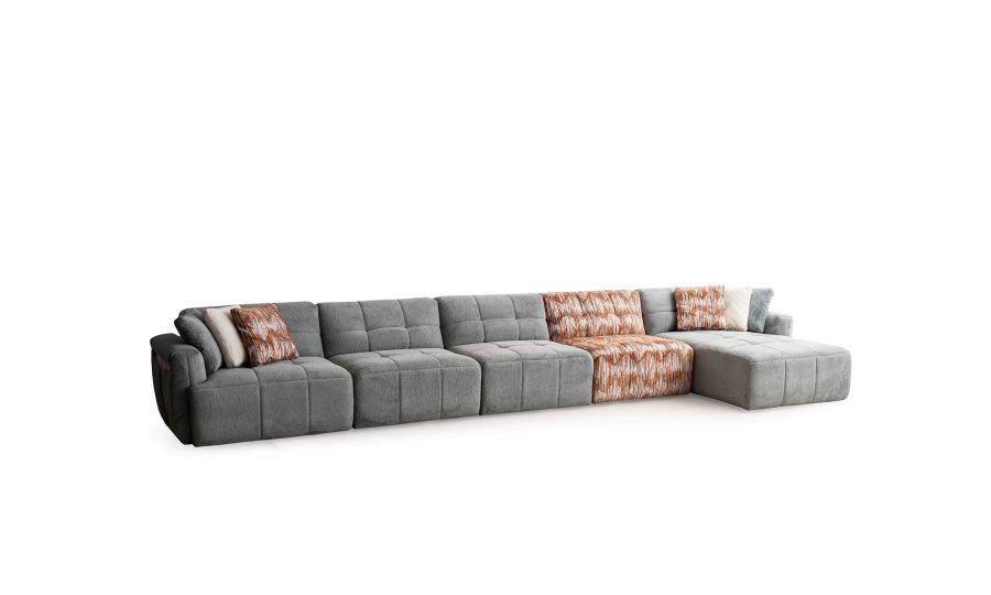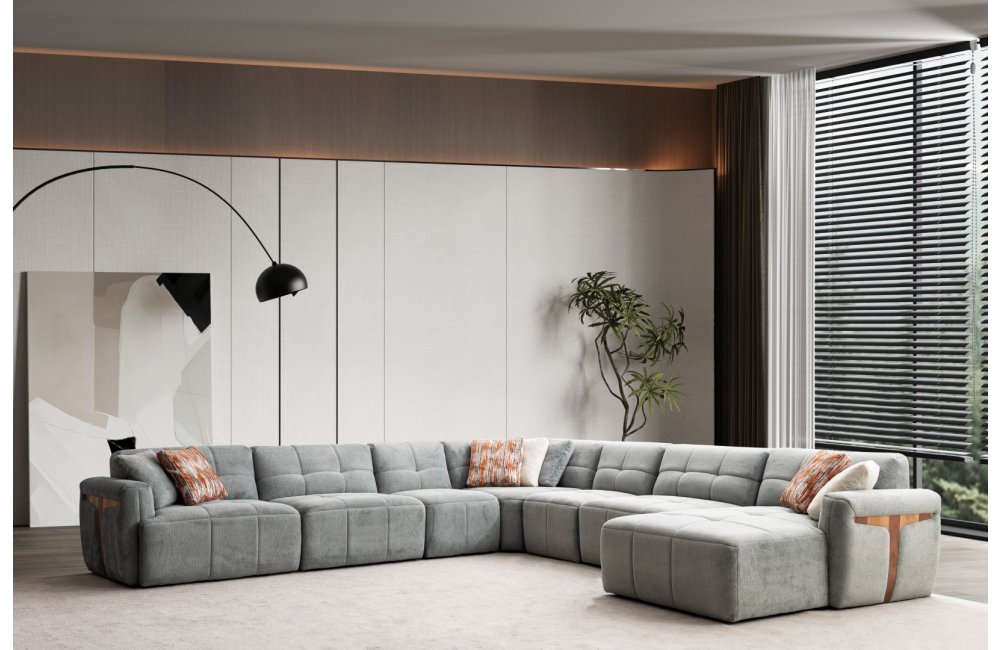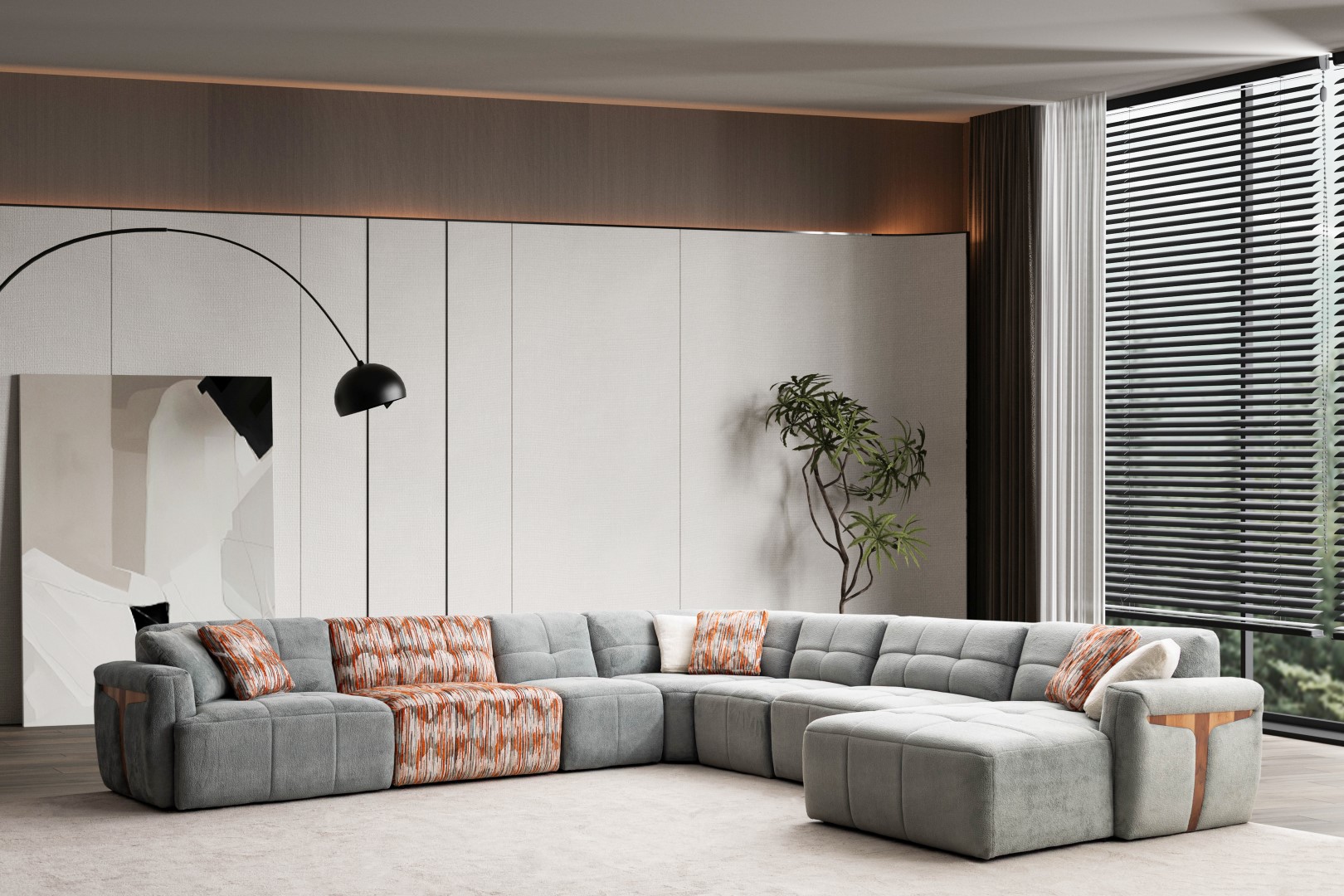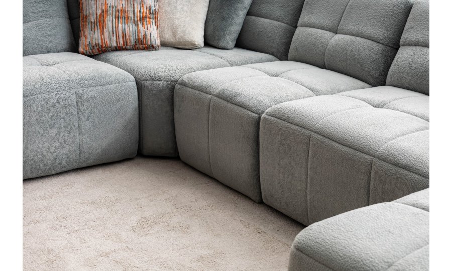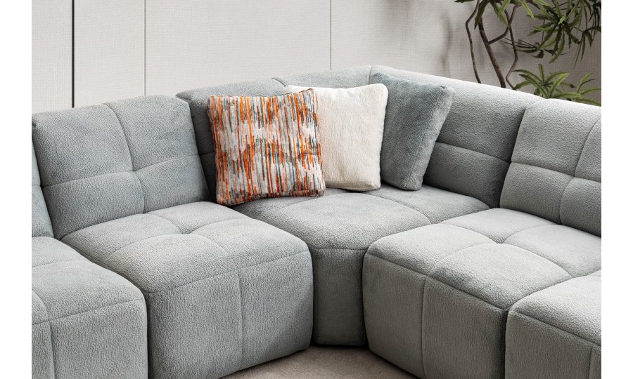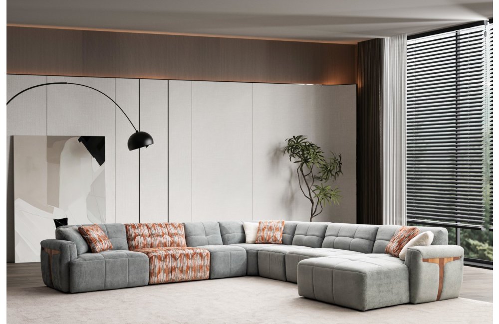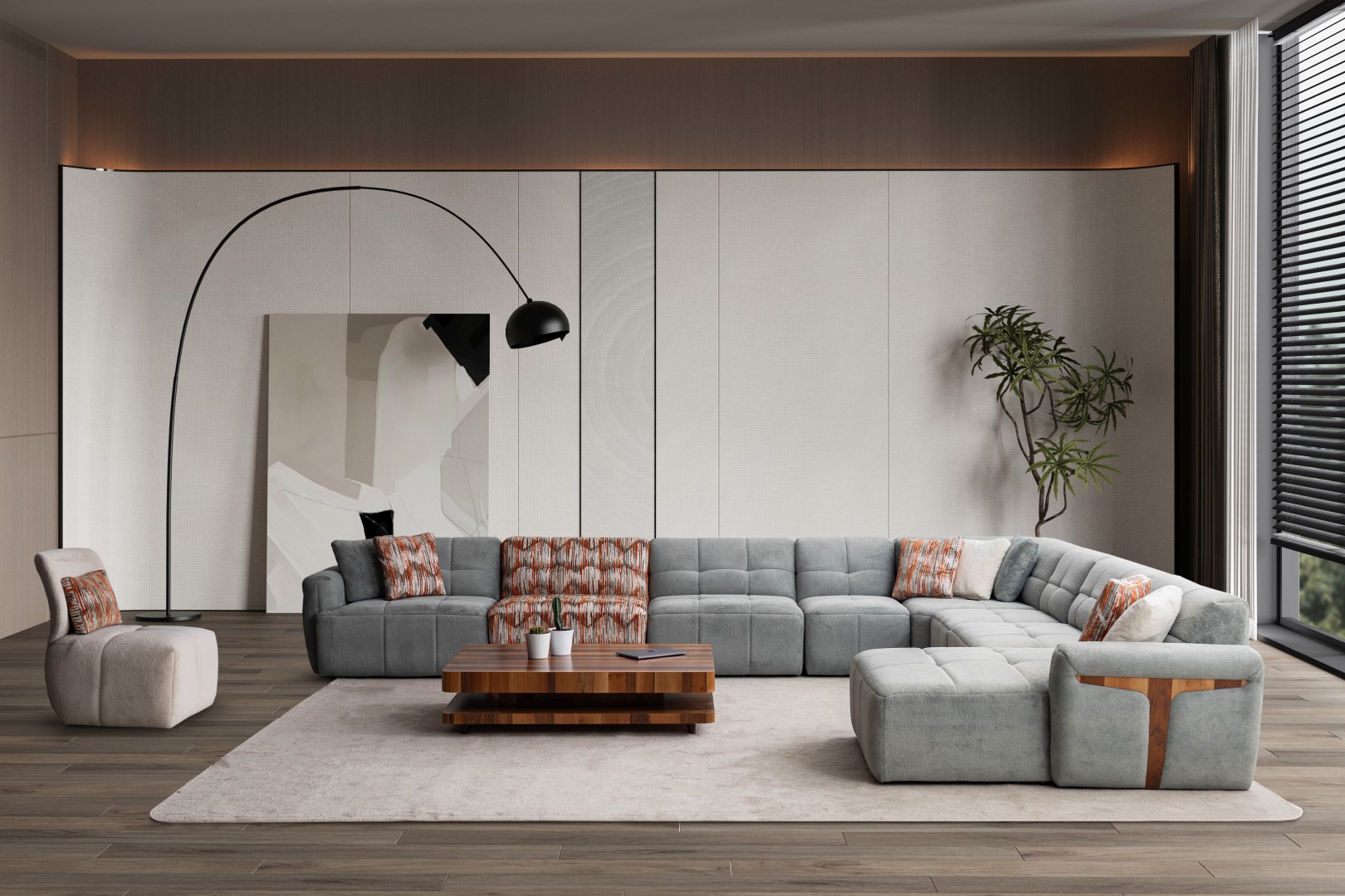 1ad. 90cm kollu modül, 2ad 90cm kolsuz piyon, 1ad. 60cm kolsuz piyon, 1ad. köşe, 1ad. 60cm yataklı kolsuz piyon, 1ad. 90cm yataklı kolsuz piyon ve 1ad. dinlenme modülden oluşmaktadır. Berjer, puflar, 90cm yataklı kollu modül ve 60cm kollu yataklı modül opsiyonel satılmaktadır.