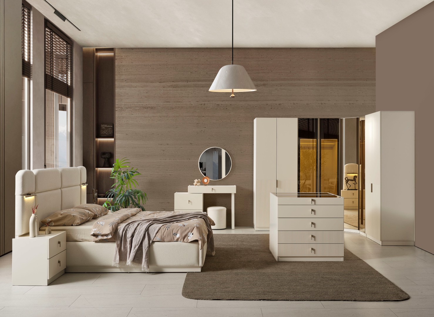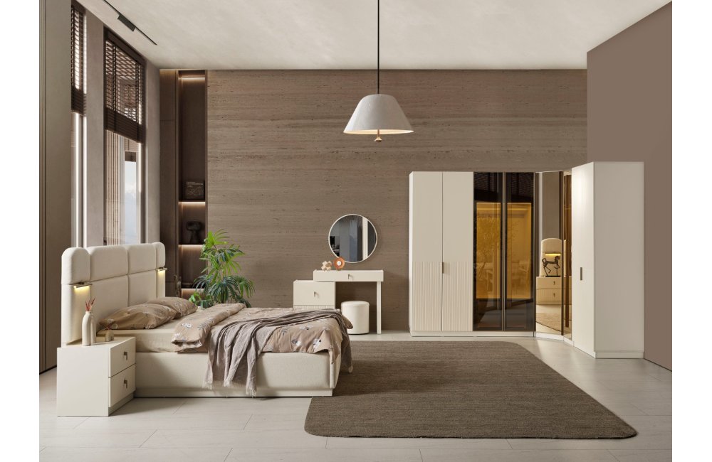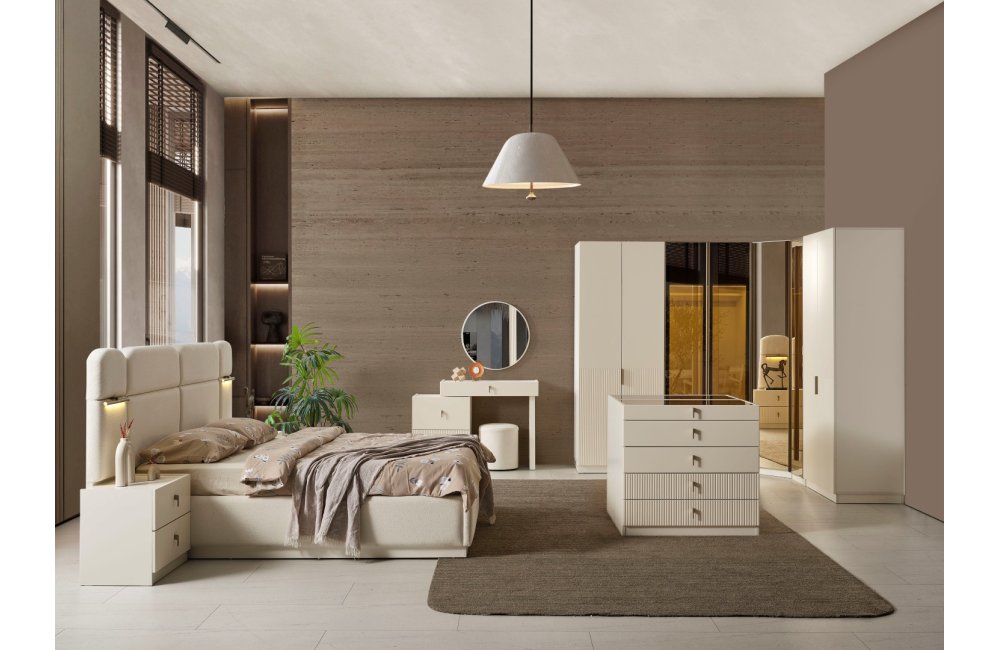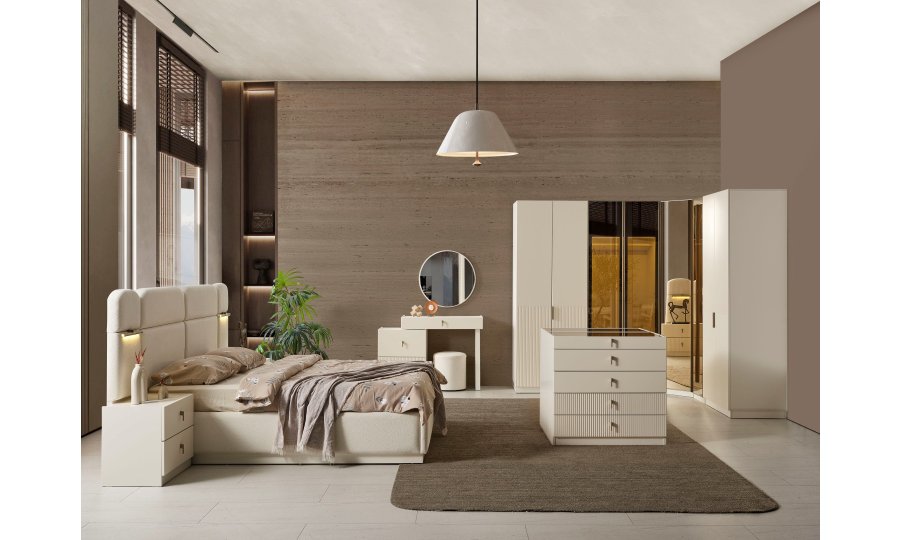 1ad.8 kapaklı dolap, 1ad.karyola (içi boş), 2ad. komodin , 2 ad. komodin panosu , 1 ad. şifonyer, 1ad. aynadan oluşmaktadır.
