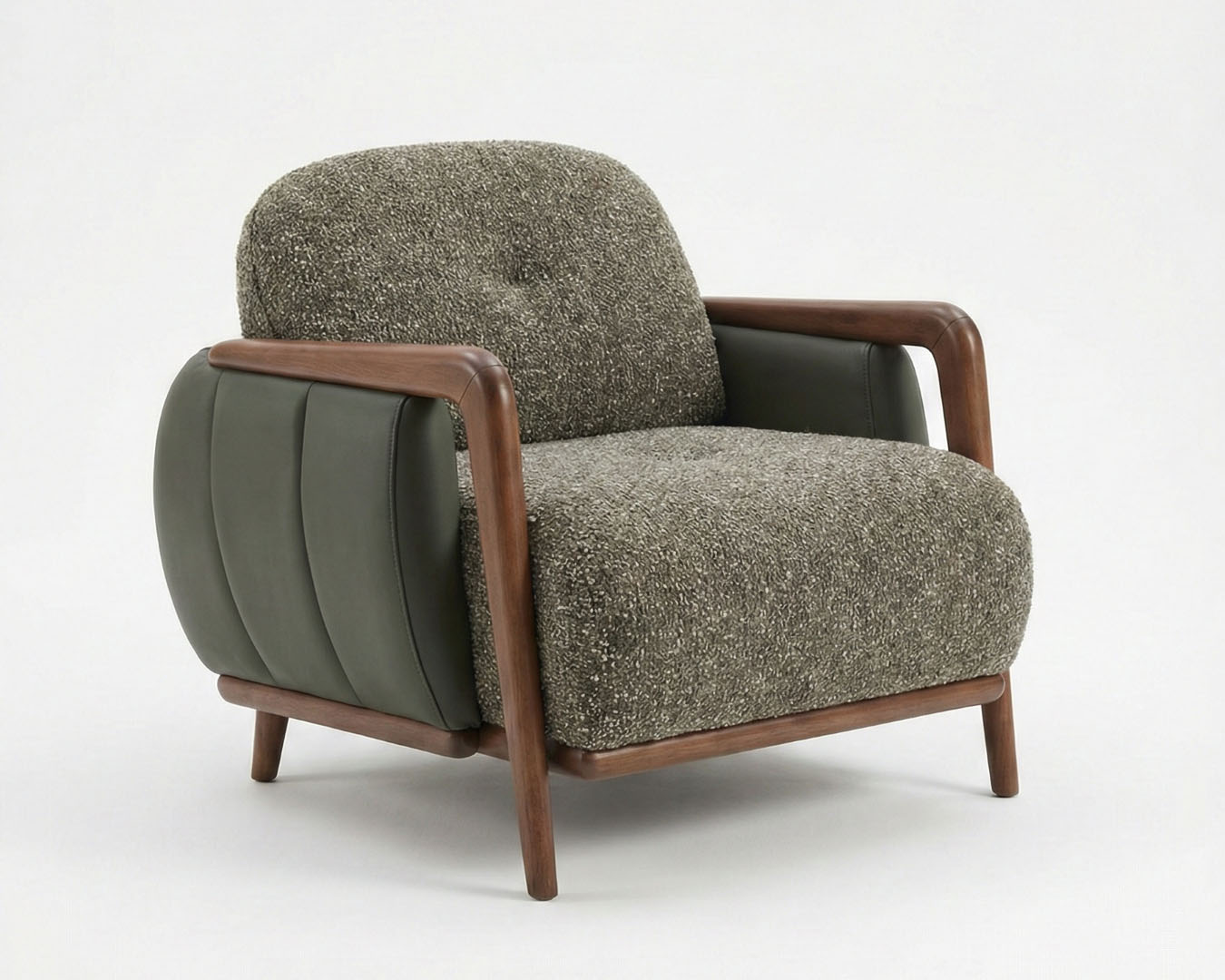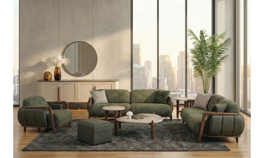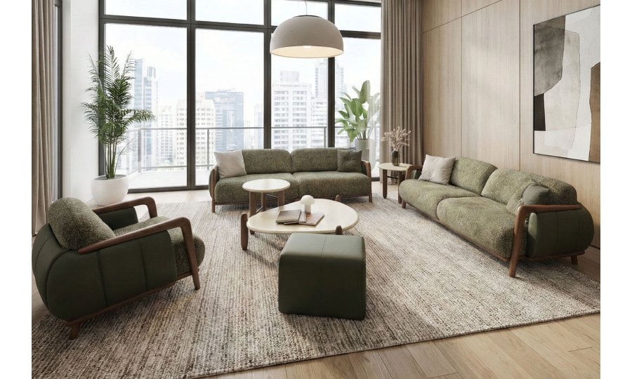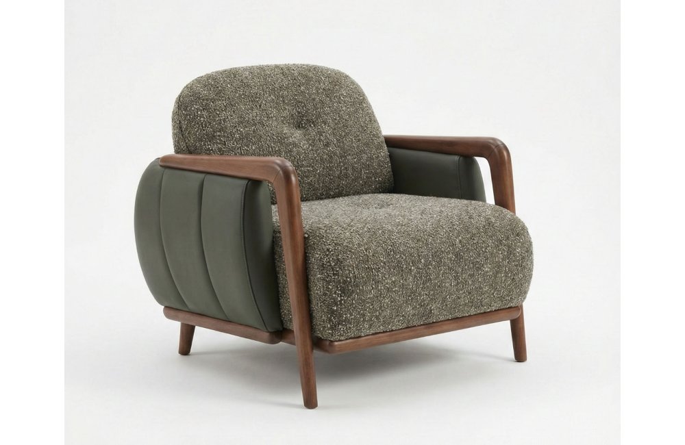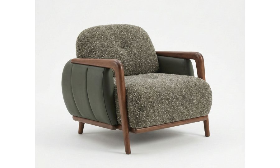 • Retro-Modern İskelet Tasarımı: Masif ceviz görünümlü ahşap iskelet, kolçaklardan başlayarak tüm gövdeyi çevreleyen akışkan ve zarif bir hat sunar.