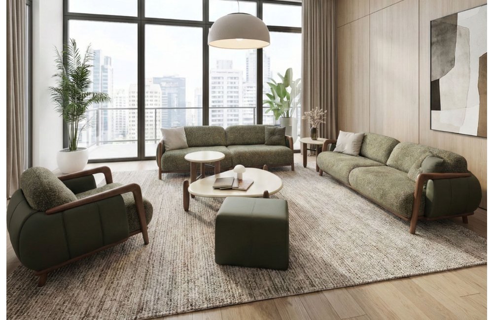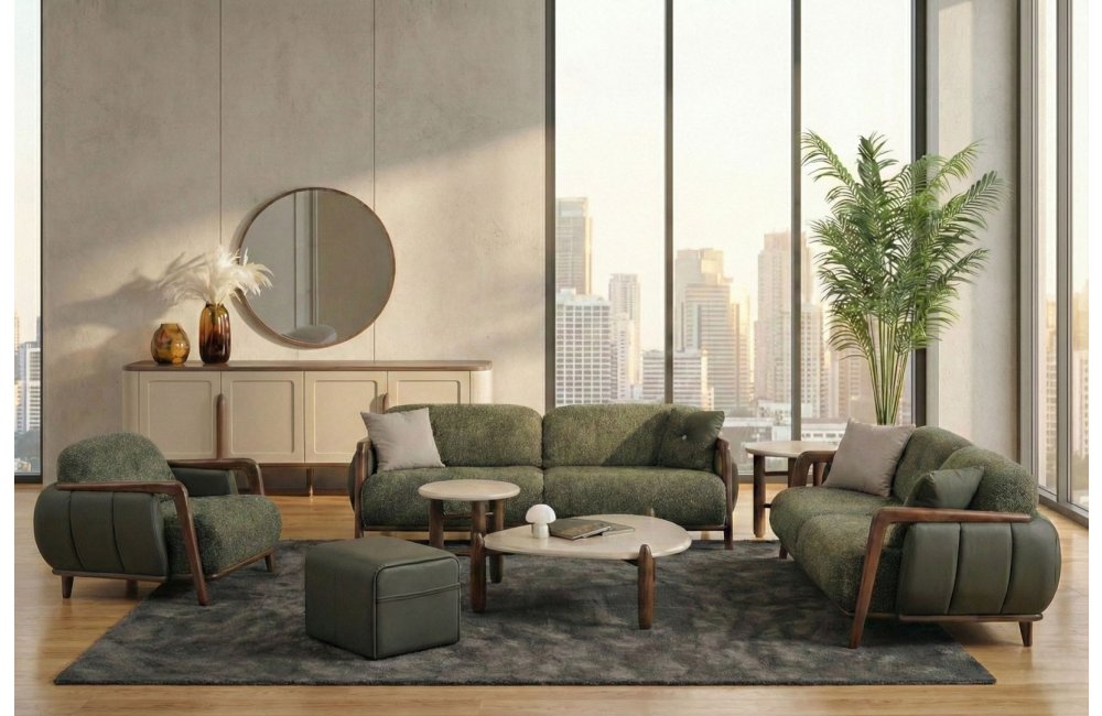 • Zengin Doku Kombinasyonu: Gövdede kullanılan pürüzsüz deri görünümü ile oturum minderlerindeki yüksek kaliteli buklet (tüvit) kumaş, kontrast bir şıklık ve dokunsal zenginlik sağlar.
