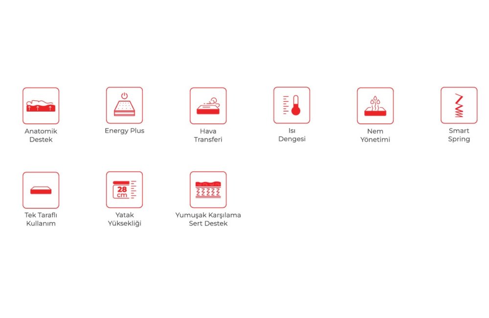 Smarttech Energy Yaylı Yatak, Energy Plus yapısıyla gece boyunca vücudun dinlenme sürecini destekleyen bir uyku deneyimi sunar. Yatağa uzandığınızda yumuşak bir karşılama hissi alırken, sabaha doğru daha toparlanmış bir uyanış hissi fark edebilirsiniz. Gün içinde kendinizi daha enerjik hissetmek isteyenler için bu yapı önemli bir avantaj oluşturur.